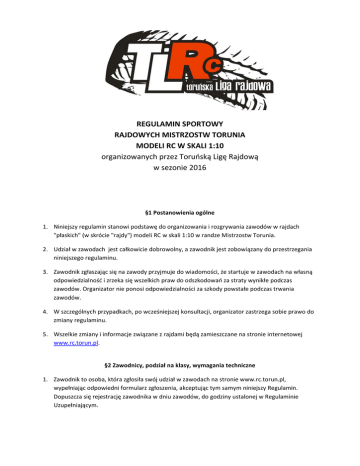 REGULAMIN SPORTOWY RAJDOWYCH MISTRZOSTW TORUNIA MODELI RC W SKALI 1:10 organizowanych przez Toruńską Ligę Rajdową w sezonie 2016 §1 Postanowienia ogólne 1. Niniejszy regulamin stanowi podstawę do organizowania i rozgrywania zawodów w rajdach "płaskich" (w skrócie "rajdy") modeli RC w skali 1:10 w randze Mistrzostw Torunia. 2. Udział w zawodach jest całkowicie dobrowolny, a zawodnik jest zobowiązany do przestrzegania niniejszego regulaminu. 3. Zawodnik zgłaszając się na zawody przyjmuje do wiadomości, że startuje w zawodach na własną odpowiedzialność i zrzeka się wszelkich praw do odszkodowań za straty wynikłe podczas zawodów. Organizator nie ponosi odpowiedzialności za szkody powstałe podczas trwania zawodów. 4. W szczególnych przypadkach, po wcześniejszej konsultacji, organizator zastrzega sobie prawo do zmiany regulaminu. 5. Wszelkie zmiany i informacje związane z rajdami będą zamieszczane na stronie internetowej www.rc.torun.pl. §2 Zawodnicy, podział na klasy, wymagania techniczne 1. Zawodnik to osoba, która zgłosiła swój udział w zawodach na stronie www.rc.torun.pl, wypełniając odpowiedni formularz zgłoszenia, akceptując tym samym niniejszy Regulamin. Dopuszcza się rejestrację zawodnika w dniu zawodów, do godziny ustalonej w Regulaminie Uzupełniającym. 2. Do udziału w zawodach zawodnik zgłasza jeden model (podwozie i karoseria). Podczas trwania zawodów nie ma możliwości wymiany podwozia na inny model. Dopuszcza się tylko naprawę uszkodzonych podzespołów lub ich wymianę na nowe. 3. Model, który został zgłoszony do udziału w zawodach musi spełniać wymagania techniczne dla jednej z 4 klas: WRC, WRC2, WRC3, JWRC. Wszystkie modele startujące w rajdach muszą być napędzane pojedynczym silnikiem elektrycznym klasy 540 oraz mieścić się w następujących wymiarach (najczęściej oznaczane przez producentów jako skala 1/10): szerokość 165 - 200m, rozstaw osi 200 - 267mm, maksymalne wymiary opon: szerokość do 32mm, średnica do 75mm (średnicę opon mierzy się bez kolców). Offset kół jest dopuszczalny w granicach bocznego obrysu nadwozia. Nie dopuszcza się stosowania pełnych felg typu "disc". 4. Model musi być wyposażony w karoserię rajdową (nie dotyczy Pucharu Debiutanta), której oryginał w skali 1:1 choć raz startował w rajdach rangi mistrzostw świata, kraju lub miejscowego okręgu. Karoseria modelu musi być oklejona w narodową flagę oraz dane zawodnika (imię i/lub nazwisko i/lub nickname), umieszczone na obu tylnych bocznych szybach. Nie dopuszcza się startu modelem w malowaniu cywilnym. Dotyczy wszystkich klas. 5. Nie zezwala się na stosowanie jakichkolwiek urządzeń elektronicznych wspomagających jazdę: systemów kontroli trakcji, żyroskopów itp. Dotyczy wszystkich klas. 6. Oświetlenie: podczas rajdów nocnych model musi być wyposażony w oświetlenie. Oświetlenie może być wykonane w postaci lamp przednich lub "elektrowni" na masce modelu. Tylne oświetlenie nie jest wymagane. Nie dopuszcza się stosowania oświetlenia na dachu samochodu w postaci latarek itp. Zawodnik podczas przejazdu nie może posiadać dodatkowego oświetlenia nie będącego integralną częścią modelu np. latarek "czołówek". Dotyczy wszystkich klas. 7. Klasa WRC: 7.1. Wiek: powyżej 12-tego roku życia. 7.2. Silnik: pojedynczy silnik elektryczny klasy 540 o maksymalnej liczbie zwoi: 7.2.1. silniki bezszczotkowe do 13,5 T włącznie 7.2.2. silniki szczotkowe do 10T włącznie. 7.3. Zasilanie: dowolny typ akumulatora, w tym pakiety o napięciu do 11.1V (3S) włącznie 7.4. Napęd: tylko 4WD 8. Klasa WRC2: 8.1. Wiek: powyżej 12-tego roku życia 8.2. Silnik: pojedynczy silnik elektryczny klasy 540 o liczbie zwoi : 8.2.1. silniki bezszczotkowe o liczbie zwoi większej lub równej 15,5T i mniejszej niż 21,5T 8.2.2. silniki szczotkowe o liczbie zwoi większej lub równej 15T i mniejszej niż 27T 8.3. Zasilanie: dowolny typ akumulatora o maksymalnym napięciu nominalnym do 7.4V (2S) włącznie. 8.4. Napęd: 4WD lub 2WD. W przypadku modeli 2WD dopuszcza się stosowanie silników z klasy WRC. 9. Klasa WRC3: 9.1. Wiek: powyżej 12-tego roku życia. 9.2. Silnik: dowolny silnik elektryczny klasy 540 o liczbie zwoi 21.5T (silnik bezszczotkowy) lub 27T (silnik szczotkowy) 9.3. Zasilanie: dowolny typ akumulatora o maksymalnym napięciu nominalnym do 7.4V (2S) włącznie. 9.4. Napęd: 4WD lub 2WD. W przypadku modeli 2WD dopuszcza się stosowanie silników z klasy WRC2. 10. Klasa JWRC: 10.1. Wiek zawodnika: do 12 lat (pod uwagę brany jest rok urodzenia). Zawodnik może startować w klasie JWRC do końca sezonu, w którym kończy 12 lat. 10.2. Obowiązują wszystkie wymagania techniczne zgodne z klasą WRC3. §3 Organizacja zawodów 1. Zawody organizowane są według kalendarza opublikowanego na stronie www.rc.torun.pl, z możliwością zmiany dat poszczególnych rund, o czym organizator poinformuje stosownym komunikatem na stronie www. 2. Najpóźniej na 5 dni przed terminem zawodów organizator zobowiązany jest do umieszczenia na stronie internetowej Regulaminu Uzupełniającego. 3. Na czas trwania zawodów powoływany jest Sędzia Główny, który pełni również funkcję dyrektora zawodów. Sędzia główny powołuje sędziów chronometrażu. 4. Sędzia główny - sędzia odpowiedzialny za prawidłowy przebieg zawodów, nadzoruje pracę sędziów chronometrażu, przyjmuje skargi i wnioski od zawodników. §4 Zgłoszenia oraz przebieg zawodów 1. Zawodnik dokonuje zgłoszenia na zawody za pośrednictwem strony www.rc.torun.pl. 2. Zawodnik zobowiązany jest do wpłaty wpisowego w wysokości .... zł na miejscu zawodów przed badaniem technicznym. 3. Sędzia główny dokonuje przyjęcia wpisowego i rejestracji kart zgłoszeniowych. Sędzia lub osoba wskazana może dokonać badania kontrolnego BK-1, po czym będzie opublikowana lista startowa. 4. Po BK-1 i do momentu startu pierwszego zawodnika wszystkie modele wszystkie 
