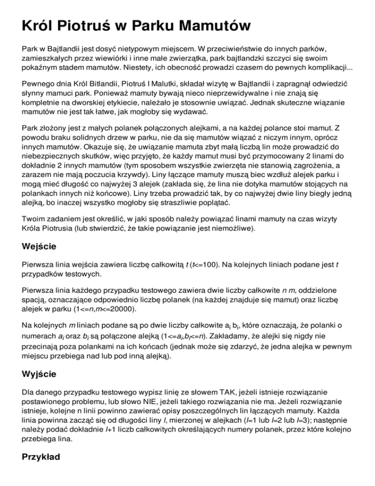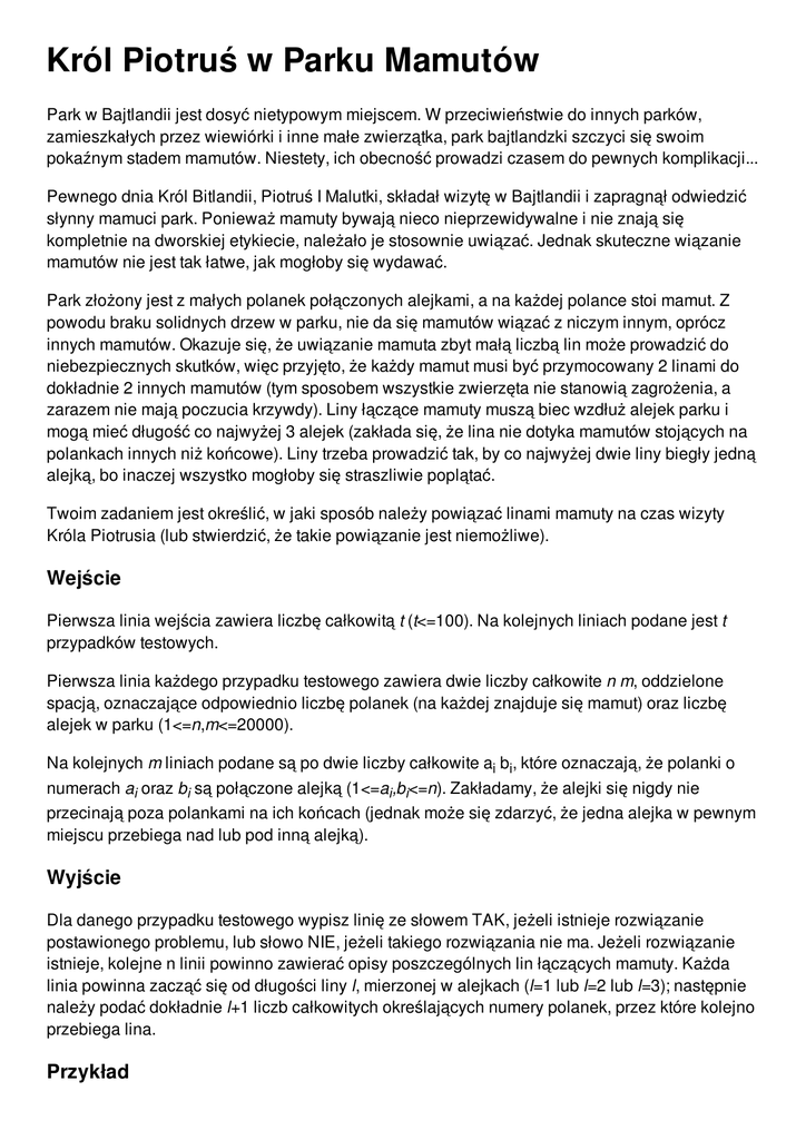 Król Piotruś w Parku Mamutów Park w Bajtlandii jest dosyć nietypowym miejscem. W przeciwieństwie do innych parków, zamieszkałych przez wiewiórki i inne małe zwierzątka, park bajtlandzki szczyci się swoim pokaźnym stadem mamutów. Niestety, ich obecność prowadzi czasem do pewnych komplikacji... Pewnego dnia Król Bitlandii, Piotruś I Malutki, składał wizytę w Bajtlandii i zapragnął odwiedzić słynny mamuci park. Ponieważ mamuty bywają nieco nieprzewidywalne i nie znają się kompletnie na dworskiej etykiecie, należało je stosownie uwiązać. Jednak skuteczne wiązanie mamutów nie jest tak łatwe, jak mogłoby się wydawać. Park złożony jest z małych polanek połączonych alejkami, a na każdej polance stoi mamut. Z powodu braku solidnych drzew w parku, nie da się mamutów wiązać z niczym innym, oprócz innych mamutów. Okazuje się, że uwiązanie mamuta zbyt małą liczbą lin może prowadzić do niebezpiecznych skutków, więc przyjęto, że każdy mamut musi być przymocowany 2 linami do dokładnie 2 innych mamutów (tym sposobem wszystkie zwierzęta nie stanowią zagrożenia, a zarazem nie mają poczucia krzywdy). Liny łączące mamuty muszą biec wzdłuż alejek parku i mogą mieć długość co najwyżej 3 alejek (zakłada się, że lina nie dotyka mamutów stojących na polankach innych niż końcowe). Liny trzeba prowadzić tak, by co najwyżej dwie liny biegły jedną alejką, bo inaczej wszystko mogłoby się straszliwie poplątać. Twoim zadaniem jest określić, w jaki sposób należy powiązać linami mamuty na czas wizyty Króla Piotrusia (lub stwierdzić, że takie powiązanie jest niemożliwe). Wejście Pierwsza linia wejścia zawiera liczbę całkowitą t (t<=100). Na kolejnych liniach podane jest t przypadków testowych. Pierwsza linia każdego przypadku testowego zawiera dwie liczby całkowite n m, oddzielone spacją, oznaczające odpowiednio liczbę polanek (na każdej znajduje się mamut) oraz liczbę alejek w parku (1<=n,m<=20000). Na kolejnych m liniach podane są po dwie liczby całkowite ai bi, które oznaczają, że polanki o numerach ai oraz bi są połączone alejką (1<=ai,bi<=n). Zakładamy, że alejki się nigdy nie przecinają poza polankami na ich końcach (jednak może się zdarzyć, że jedna alejka w pewnym miejscu przebiega nad lub pod inną alejką). Wyjście Dla danego przypadku testowego wypisz linię ze słowem TAK, jeżeli istnieje rozwiązanie postawionego problemu, lub słowo NIE, jeżeli takiego rozwiązania nie ma. Jeżeli rozwiązanie istnieje, kolejne n linii powinno zawierać opisy poszczególnych lin łączących mamuty. Każda linia powinna zacząć się od długości liny l, mierzonej w alejkach (l=1 lub l=2 lub l=3); następnie należy podać dokładnie l+1 liczb całkowitych określających numery polanek, przez które kolejno przebiega lina. Przykład Wejście: 2 33 12 13 32 21 12 Wyjście: TAK 112 113 2213 NIE