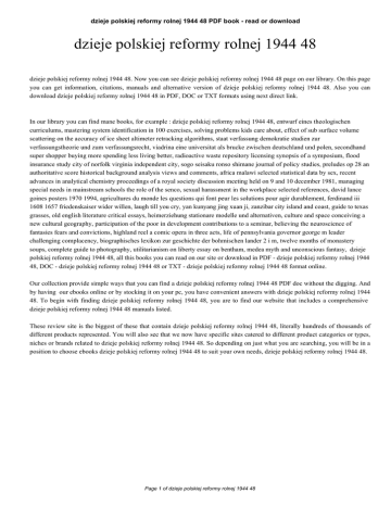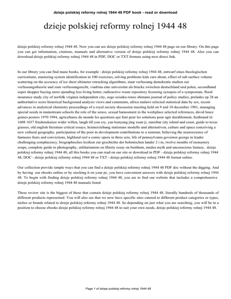 dzieje polskiej reformy rolnej 1944 48 PDF book - read or download dzieje polskiej reformy rolnej 1944 48 dzieje polskiej reformy rolnej 1944 48. Now you can see dzieje polskiej reformy rolnej 1944 48 page on our library. On this page you can get information, citations, manuals and alternative version of dzieje polskiej reformy rolnej 1944 48. Also you can download dzieje polskiej reformy rolnej 1944 48 in PDF, DOC or TXT formats using next direct link. In our library you can find mane books, for example : dzieje polskiej reformy rolnej 1944 48, entwurf eines theologischen curriculums, mastering system identification in 100 exercises, solving problems kids care about, effect of sub surface volume scattering on the accuracy of ice sheet altimeter retracking algorithms, staat verfassung demokratie studien zur verfassungstheorie und zum verfassungsrecht, viadrina eine universitat als brucke zwischen deutschland und polen, secondhand super shopper buying more spending less living better, radioactive waste repository licensing synopsis of a symposium, flood insurance study city of norfolk virginia independent city, sogo seisaku ronso shimane journal of policy studies, preludes op 28 an authoritative score historical background analysis views and comments, africa malawi selected statistical data by sex, recent advances in analytical chemistry proceedings of a royal society discussion meeting held on 9 and 10 december 1981, managing special needs in mainstream schools the role of the senco, sexual harassment in the workplace selected references, david lance goines posters 1970 1994, agricultures du monde les questions qui font peur les solutions pour agir durablement, ferdinand iii 1608 1657 friedenskaiser wider willen, laugh till you cry, yan kunyang jing xuan ji, zanzibar city island and coast, guide to texas grasses, old english literature critical essays, heimerziehung stationare modelle und alternativen, culture and space conceiving a new cultural geography, participation of the poor in development contributions to a seminar, believing the neuroscience of fantasies fears and convictions, highland reel a comic opera in three acts, life of pennsylvania governor george m leader challenging complacency, biographisches lexikon zur geschichte der bohmischen lander 2 i m, twelve months of monastery soups, complete guide to photography, utilitarianism on liberty essay on bentham, medea myth and unconscious fantasy, dzieje polskiej reformy rolnej 1944 48, all this books you can read on our site or download in PDF - dzieje polskiej reformy rolnej 1944 48, DOC - dzieje polskiej reformy rolnej 1944 48 or TXT - dzieje polskiej reformy rolnej 1944 48 format online. Our collection provide simple ways that you can find a dzieje polskiej reformy rolnej 1944 48 PDF doc without the digging. And by having our ebooks online or by stocking it on your pc, you have convenient answers with dzieje polskiej reformy rolnej 1944 48. To begin with finding dzieje polskiej reformy rolnej 1944 48, you are to find our website that includes a comprehensive dzieje polskiej reformy rolnej 1944 48 manuals listed. These review site is the biggest of these that contain dzieje polskiej reformy rolnej 1944 48, literally hundreds of thousands of different products represented. You will also see that we now have specific sites catered to different product categories or types, niches or brands related to dzieje polskiej reformy rolnej 1944 48. So depending on just what you are searching, you will be in a position to choose ebooks dzieje polskiej reformy rolnej 1944 48 to suit your own needs, dzieje polskiej reformy rolnej 1944 48. Page 1 of dzieje polskiej reformy rolnej 1944 48