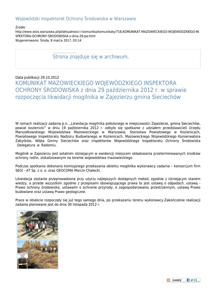Wojewódzki Inspektorat Ochrony Środowiska w Warszawie Źródło: http://www.wios.warszawa.pl/pl/aktualnosci-i-komunika/komunikaty/718,KOMUNIKAT-MAZOWIECKIEGO-WOJEWODZKIEGO-IN SPEKTORA-OCHRONY-SRODOWISKA-z-dnia-29-pa.html Wygenerowano: Środa, 8 marca 2017, 03:14 Strona znajduje się w archiwum. Data publikacji 29.10.2012 KOMUNIKAT MAZOWIECKIEGO WOJEWÓDZKIEGO INSPEKTORA OCHRONY ŚRODOWISKA z dnia 29 października 2012 r. w sprawie rozpoczęcia likwidacji mogilnika w Zajezierzu gmina Sieciechów W ramach realizacji zadania p.n. „Likwidacja mogilnika położonego w miejscowości Zajezierze, gmina Sieciechów, powiat kozienicki” w dniu 19 października 2012 r. odbyło się spotkanie z udziałem przedstawicieli Urzędu Marszałkowskiego Województwa Mazowieckiego w Warszawie, Starostwa Powiatowego w Kozienicach, Powiatowego Inspektoratu Nadzoru Budowlanego w Kozienicach, Mazowieckiego Wojewódzkiego Konserwatora Zabytków, Wójta Gminy Sieciechów oraz inspektorów Wojewódzkiego Inspektoratu Ochrony Środowiska Delegatura w Radomiu. Mogilnik w Zajezierzu jest ostatnim istniejącym w ewidencji miejscem składowania przeterminowanych środków ochrony roślin, zlokalizowanym na terenie województwa mazowieckiego. Podczas spotkania dokonano komisyjnego przekazania obiektu mogilnika wykonawcy zadania – konsorcjum firm SEGI - AT Sp. z o. o. oraz GEOCOMA Marcin Chalecki. Likwidacja zostanie przeprowadzona przy użyciu najlepszych dostępnych metod, zgodnie z istniejącym stanem wiedzy, a przede wszystkim zgodnie z przepisami obowiązującego prawa to jest ustawą o odpadach, ustawą Prawo ochrony środowiska, ustawami o ochronie przyrody, o zagospodarowaniu przestrzennym, ustawą Prawo budowlane oraz ustawą Prawo geologiczne. Prace w obiekcie rozpoczęły się już tego samego dnia, po przekazaniu terenu wykonawcy.Zakończenie realizacji zadania planowane jest do dnia 30 listopada 2012 r. Data publikacji 29.10.2012 Rejestr zmian Liczba wizyt: 886 Autor: Tomasz Klech Opublikowane przez Ewa Pacholska