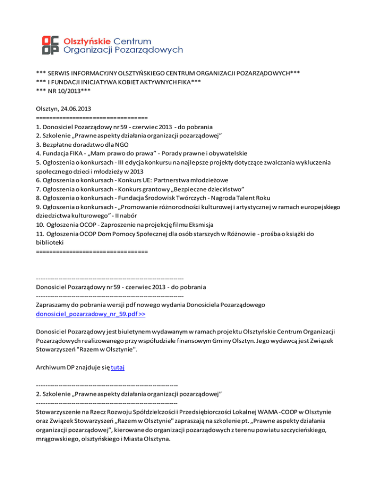 *** SERWIS INFORMACYJNY OLSZTYŃSKIEGO CENTRUM ORGANIZACJI POZARZĄDOWYCH*** *** I FUNDACJI INICJATYWA KOBIET AKTYWNYCH FIKA*** *** NR 10/2013*** Olsztyn, 24.06.2013 ================================= 1. Donosiciel Pozarządowy nr 59 - czerwiec 2013 - do pobrania 2. Szkolenie „Prawne aspekty działania organizacji pozarządowej” 3. Bezpłatne doradztwo dla NGO 4. Fundacja FIKA - „Mam prawo do prawa” - Porady prawne i obywatelskie 5. Ogłoszenia o konkursach - III edycja konkursu na najlepsze projekty dotyczące zwalczania wykluczenia społecznego dzieci i młodzieży w 2013 6. Ogłoszenia o konkursach - Konkurs UE: Partnerstwa młodzieżowe 7. Ogłoszenia o konkursach - Konkurs grantowy „Bezpieczne dzieciństwo” 8. Ogłoszenia o konkursach - Fundacja Środowisk Twórczych - Nagroda Talent Roku 9. Ogłoszenia o konkursach - „Promowanie różnorodności kulturowej i artystycznej w ramach europejskiego dziedzictwa kulturowego” - II nabór 10. Ogłoszenia OCOP - Zaproszenie na projekcję filmu Eksmisja 11. Ogłoszenia OCOP Dom Pomocy Społecznej dla osób starszych w Różnowie - prośba o książki do biblioteki ================================= --------------------------------------------------------------------Donosiciel Pozarządowy nr 59 - czerwiec 2013 - do pobrania --------------------------------------------------------------------Zapraszamy do pobrania wersji pdf nowego wydania Donosiciela Pozarządowego donosiciel_pozarzadowy_nr_59.pdf >> Donosiciel Pozarządowy jest biuletynem wydawanym w ramach projektu Olsztyńskie Centrum Organizacji Pozarządowych realizowanego przy współudziale finansowym Gminy Olsztyn. Jego wydawcą jest Związek Stowarzyszeń "Razem w Olsztynie". Archiwum DP znajduje się tutaj -----------------------------------------------------------------2. Szkolenie „Prawne aspekty działania organizacji pozarządowej” -----------------------------------------------------------------Stowarzyszenie na Rzecz Rozwoju Spółdzielczości i Przedsiębiorczości Lokalnej WAMA -COOP w Olsztynie oraz Związek Stowarzyszeń „Razem w Olsztynie" zapraszają na szkolenie pt. „Prawne aspekty działania organizacji pozarządowej”, kierowane do organizacji pozarządowych z terenu powiatu szczycieńskiego, mrągowskiego, olsztyńskiego i Miasta Olsztyna. Zobacz więcej >> --------------------------------------------------------------------3. Bezpłatne doradztwo dla NGO --------------------------------------------------------------------Olsztyńskie Centrum Organizacji Pozarządowych oferuje bezpłatną pomoc przy przygotowaniu ofert konkursowych. Organizacje zainteresowane ofertą OCOP proszone są o kontakt: [email protected] Tel. 503 680 500 Bezpłatne doradztwo uzyskać można również w zakresie m.in.: rozliczania ofert z realizacji zadań publicznych oraz pisania i rozliczania projektów. Osoby zajmujące się w organizacji sprawami księgowymi i finansowymi zapraszamy do skorzystania z bezpłatnego doradztwa w Olsztyńskim Centrum Organizacji Pozarządowych we wtorki g.17.00-19.00. Miejsce: Olsztyńskie Centrum Organizacji Pozarządowych, ul. Tarasa Szewczenki 1, 10-274 Olsztyn mapa >> Doradztwo jest organizowane przez Związek Stowarzyszeń „Razem w Olsztynie” w ramach projektu „Olsztyńskie Centrum Organizacji Pozarządowych" realizowanego przy współudziale finansowym Gminy Olsztyn oraz projektu "W kierunku profesjonalizacji" współfinansowanego przez Powiat Olsztyński. --------------------------------------------------------------------4. Fundacja FIKA - „Mam prawo do prawa” - Porady prawne i obywatelskie --------------------------------------------------------------------W ramach projektu "Mam prawo do prawa" realizowanego przez Fundację FIKA prowadzone są bezpłatne porady prawne i obywatelskie, spotkania z doradcami i ekspertami. W trakcie porad istnieje możliwość uzyskania pomocy przy sporządzaniu min. pism, odwołań, wniosków, powództw, itp. Prowadzone jest również doradztwo prawne dla przedstawicieli NGO. Zapraszamy do Punktu Konsultacyjnego Projektu przy ul. Tarasa Szewczenki 1, 10-274 Olsztyn mapa >> Dyżury ekspertów i doradców - środy 11.00-14.00 - piątki 11.00-14.00 Pytania dotyczące aspektów prawnych powstawania i funkcjonowania organizacji pozarządowych prosimy przesyłać drogą elektroniczną: [email protected] Wszystkich chętnych mieszkańców Bartoszyc i okolic serdecznie zapraszamy do spotkania z naszymi doradczyniami w siedzibie MOPS-u przy ul. Pieniężnego 10A w dniach w godzinach 11.00-14.00. Kolejny termin porad w Bartoszycach to: 24 czerwca 2013. Zobacz więcej >> Zapraszamy również do skorzystania z bezpłatnych porad prawnych na antenie Radia Olsztyn w każdą trzecią sobotę miesiąca o godz. 14.00. Najbliższa audycja 20 lipca 2013. Zobacz więcej >> Projekt „Mam prawo do prawa” jest współfinansowany przez Unię Europejską ze środków Europejskiego Funduszu Społecznego w ramach Programu Operacyjnego Kapitał Ludzki, Priorytet V, Działanie 5.4 Rozwój potencjału trzeciego sektora, Podziałanie 5.4.2 Rozwój dialogu obywatelskiego. --------------------------------------------------------------------5. Ogłoszenia o konkursach - III edycja konkursu na najlepsze projekty dotyczące zwalczania wykluczenia społecznego dzieci i młodzieży w 2013 --------------------------------------------------------------------Fundusz Społeczny Notariatu zaprasza osoby prawne – organizacje pozarządowe, które uzyskały osobowość prawną co najmniej na 6 miesięcy przed datą złożenia Wniosku Aplikacyjnego i działają na zasadzie non profit lub non for profit tj. nie dla osiągnięcia zysku lub z przeznaczeniem wygenerowanych środków na cele statutowe, do udziału w III edycji konkursu na najlepsze projekty dotyczące zwalczania wykluczenia społecznego dzieci i młodzieży w 2013 roku. Zobacz więcej >> --------------------------------------------------------------------6. Ogłoszeni