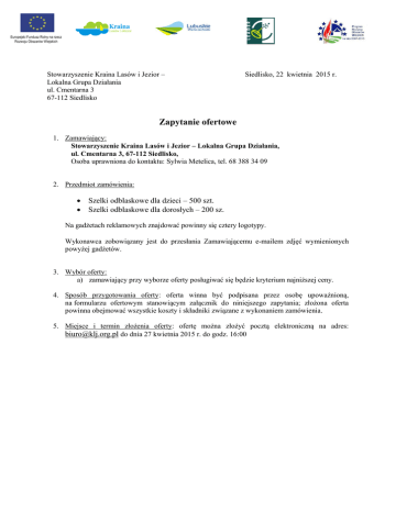 Europejski Fundusz Rolny na rzecz Rozwoju Obszarów Wiejskich Stowarzyszenie Kraina Lasów i Jezior – Lokalna Grupa Działania ul. Cmentarna 3 67-112 Siedlisko Siedlisko, 22 kwietnia 2015 r. Zapytanie ofertowe 1. Zamawiający: Stowarzyszenie Kraina Lasów i Jezior – Lokalna Grupa Działania, ul. Cmentarna 3, 67-112 Siedlisko, Osoba uprawniona do kontaktu: Sylwia Metelica, tel. 68 388 34 09 2. Przedmiot zamówienia: Szelki odblaskowe dla dzieci – 500 szt. Szelki odblaskowe dla dorosłych – 200 sz. Na gadżetach reklamowych znajdować powinny się cztery logotypy. Wykonawca zobowiązany jest do przesłania Zamawiającemu e-mailem zdjęć wymienionych powyżej gadżetów. 3. Wybór oferty: a) zamawiający przy wyborze oferty posługiwać się będzie kryterium najniższej ceny. 4. Sposób przygotowania oferty: oferta winna być podpisana przez osobę upoważnioną, na formularzu ofertowym stanowiącym załącznik do niniejszego zapytania; złożona oferta powinna obejmować wszystkie koszty i składniki związane z wykonaniem zamówienia. 5. Miejsce i termin złożenia oferty: ofertę można złożyć pocztą elektroniczną na adres: [email protected] do dnia 27 kwietnia 2015 r. do godz. 16:00 Europejski Fundusz Rolny na rzecz Rozwoju Obszarów Wiejskich ……………………………………. (nazwa i adres Wykonawcy) …………………………………… (miejscowość, data) OFERTA Stowarzyszenie Kraina Lasów i Jezior – LGD ul. Cmentarna 3, 67-112 Siedlisko Odpowiadając na zapytanie ofertowe z dnia 22 kwietnia 2015 r. dotyczące gadżetów reklamowych: Lp. Nazwa przedmiotu zamówienia 1 2 Szelki odblaskowe dla dzieci Szelki odblaskowe dla dorosłych Razem Jed n. mia ry szt. szt. Ilość Cena jedn. netto VAT % Cena jedn. brutto Wartość brutto 500 200 Oferujemy wykonanie zamówienia za cenę brutto: ………………………zł Słownie: …………………………………………………………………………………………………… Przyjmujemy do realizacji postawione przez Zamawiającego w zapytaniu o cenę warunki. „Wyrażam zgodę na przetwarzanie moich danych osobowych dla potrzeb niezbędnych do realizacji zadania (zgodnie z Ustawą z dnia 29.08.1997 roku o Ochronie Danych Osobowych; tekst jednolity: Dz. U. z 2002r. Nr 101, poz. 926 ze zm.).” …………………………………………. (podpis osoby upoważnionej)