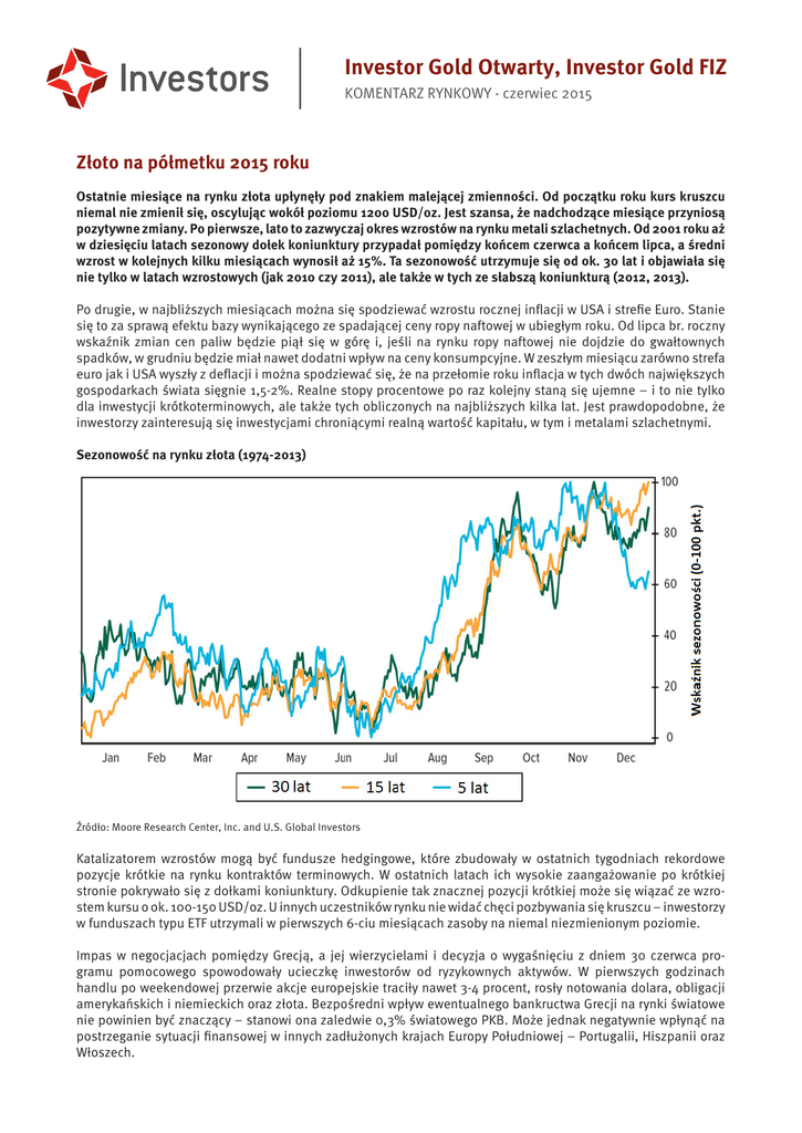Investor Gold Otwarty, Investor Gold FIZ KOMENTARZ RYNKOWY - czerwiec 2015 Złoto na półmetku 2015 roku Ostatnie miesiące na rynku złota upłynęły pod znakiem malejącej zmienności. Od początku roku kurs kruszcu niemal nie zmienił się, oscylując wokół poziomu 1200 USD/oz. Jest szansa, że nadchodzące miesiące przyniosą pozytywne zmiany. Po pierwsze, lato to zazwyczaj okres wzrostów na rynku metali szlachetnych. Od 2001 roku aż w dziesięciu latach sezonowy dołek koniunktury przypadał pomiędzy końcem czerwca a końcem lipca, a średni wzrost w kolejnych kilku miesiącach wynosił aż 15%. Ta sezonowość utrzymuje się od ok. 30 lat i objawiała się nie tylko w latach wzrostowych (jak 2010 czy 2011), ale także w tych ze słabszą koniunkturą (2012, 2013). Po drugie, w najbliższych miesiącach można się spodziewać wzrostu rocznej inflacji w USA i strefie Euro. Stanie się to za sprawą efektu bazy wynikającego ze spadającej ceny ropy naftowej w ubiegłym roku. Od lipca br. roczny wskaźnik zmian cen paliw będzie piął się w górę i, jeśli na rynku ropy naftowej nie dojdzie do gwałtownych spadków, w grudniu będzie miał nawet dodatni wpływ na ceny konsumpcyjne. W zeszłym miesiącu zarówno strefa euro jak i USA wyszły z deflacji i można spodziewać się, że na przełomie roku inflacja w tych dwóch największych gospodarkach świata sięgnie 1,5-2%. Realne stopy procentowe po raz kolejny staną się ujemne – i to nie tylko dla inwestycji krótkoterminowych, ale także tych obliczonych na najbliższych kilka lat. Jest prawdopodobne, że inwestorzy zainteresują się inwestycjami chroniącymi realną wartość kapitału, w tym i metalami szlachetnymi. Sezonowość na rynku złota (1974-2013) Źródło: Moore Research Center, Inc. and U.S. Global Investors Katalizatorem wzrostów mogą być fundusze hedgingowe, które zbudowały w ostatnich tygodniach rekordowe pozycje krótkie na rynku kontraktów terminowych. W ostatnich latach ich wysokie zaangażowanie po krótkiej stronie pokrywało się z dołkami koniunktury. Odkupienie tak znacznej pozycji krótkiej może się wiązać ze wzrostem kursu o ok. 100-150 USD/oz. U innych uczestników rynku nie widać chęci pozbywania się kruszcu – inwestorzy w funduszach typu ETF utrzymali w pierwszych 6-ciu miesiącach zasoby na niemal niezmienionym poziomie. Impas w negocjacjach pomiędzy Grecją, a jej wierzycielami i decyzja o wygaśnięciu z dniem 30 czerwca programu pomocowego spowodowały ucieczkę inwestorów od ryzykownych aktywów. W pierwszych godzinach handlu po weekendowej przerwie akcje europejskie traciły nawet 3-4 procent, rosły notowania dolara, obligacji amerykańskich i niemieckich oraz złota. Bezpośredni wpływ ewentualnego bankructwa Grecji na rynki światowe nie powinien być znaczący – stanowi ona zaledwie 0,3% światowego PKB. Może jednak negatywnie wpłynąć na postrzeganie sytuacji finansowej w innych zadłużonych krajach Europy Południowej – Portugalii, Hiszpanii oraz Włoszech. Investor Gold Otwarty, Investor Gold FIZ KOMENTARZ RYNKOWY - czerwiec 2015 Zadłużenie tych krajów znacznie przekracza niemal zapomniany już limit traktatu z Maastricht (60% PKB), a w Portugalii i we Włoszech wynosi ono ponad 130% PKB. Taki poziom długu sektora publicznego notowano w Grecji w 2010 roku, tuż przed otrzymaniem pierwszej transzy pomocy międzynarodowej. Trudno przewidzieć rozwój wydarzeń w przypadku, gdyby niewypłacalność zagroziła kolejnemu, po Cyprze i Grecji, krajowi. Można się jednak spodziewać, że w takiej sytuacji odpływ kapitału ku bezpiecznym przystaniom – dolarowi amerykańskiemu, złotu i obligacjom amerykańskim może być odpowiednio większy. Okresy niepewności na rynkach i większej zmienności zazwyczaj dowartościowują złoto i dlatego warto je utrzymywać jako część zdywersyfikowanego portfela. Zasoby złota w światowych funduszach ETF (w mln unkcji) Źródło: Bloomberg Maciej Kołodziejczyk Zarządzający funduszami Investors TFI Investors Towarzystwo Funduszy Inwestycyjnych S.A. jest podmiotem prowadzącym działalność na podstawie zezwolenia Komisji Nadzoru Finansowego udzielonego decyzją nr DFI/W/4034-30/1N-1-3432/05 z dnia 12 lipca 2005 r. w zakresie tworzenia funduszy inwestycyjnych i zarządzania nimi oraz zarządzaniu zbiorczym portfelem papierów wartościowych. Niniejszy materiał ma wyłącznie charakter reklamowy. Opracowany został przez Investors TFI S.A. w związku z zarządzaniem funduszami inwestycyjnymi. Materiał oraz zawarte w nim prognozy stanowią wyłącznie wyraz poglądów jego autora i oparte zostały na stanie wiedzy aktualnym na dzień jego sporządzenia. Przy sporządzeniu materiału i zawartych w nim prognoz oparto się na informacjach pozyskanych z powszechnie dostępnych i uznanych za wiarygodne źródeł, dokładając należytej staranności, aby informacje zamieszczone w niniejszym materiale były rzetelne, niemniej jednak nie można zagwarantować ich poprawności, kompletności i aktualności. Investors TFI S.A. zastrzega sobie możliwość zmiany przedstawionych opinii, w tym w przypadku zmiany sytuacji rynkowej, bez konieczności powiadamiania o niej adresatów niniejszego materiału. Investors TFI S.A. nie gwarantuje ziszczenia się scenariuszy lub prognoz zamieszczonych w niniejszym materiale, w szczególności przedstawione informacje (historyczne i prognozowane) nie stanowią gwarancji osiągnięcia podobnych wyników w przyszłości. Materiał niniejszy nie stanowi oferty publicznej ani publicznego oferowania w zakresie nabycia lub Investor Gold Otwarty, Investor Gold FIZ KOMENTARZ RYNKOWY - czerwiec 2015 sprzedaży jakichkolwiek papierów wartościowych ani oferty w rozumieniu przepisów ustawy z dnia 23 kwietnia 1964 r. – Kodeks cywilny. Wnioski wyciągnięte na podstawie przedstawionych komentarzy i prognoz nie powinny stanowić samodzielnej podstawy jakichkolwiek decyzji inwestycyjnyc