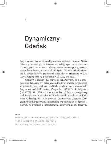 5. Dynamiczny Gdańsk Przyszło nam żyć w niezwykłym czasie zmian i rozwoju. Nasze miasto przeżywa przyspieszony rozwój gospodarczy i urbanistyczny, powstają nowe dzielnice, nowe miejsca pracy, rozwija się społeczeństwo, wzrasta jakość życia. Gdańsk już kilkakrotnie w swojej historii przeżywał takie okresy przemian: w XIV i XVII wieku oraz na przełomie XIX i XX stulecia. Ważnym okresem dla rozwoju urbanistycznego i gospodarczego Gdańska był także czas odbudowy miasta ze zniszczeń wojennych oraz budowa wielkich dzielnic mieszkaniowych: Przymorze (od 1959 roku), Zaspa (od 1973) Piecki Migowo (od 1977). W 1974 roku otwarto Port Północny, najgłębszy nad Bałtykiem, a w roku 1975 oddano do eksploatacji Rafinerię Gdańską. W 1970 powstał Uniwersytet Gdański. Ówczesny boom budowlany skończył się w połowie lat siedemdziesiątych, w związku z narastającym kryzysem gospodarczym. 2008 E U R O P E J S K I E C E N T R U M S O L I D A R N O Ś C I – M A R Z E N I E Ż Y C I A, K T Ó R E N A B I E R A R E A L N E G O K S Z TA ŁT U F O T. A R C H I W U M U R Z Ę D U M I E J S K I E G O 573 - Adamowicz sklad.indd 145 2008-10-06 15:10:01 PAW E Ł A DA M OW I C Z Należy pamiętać, że w systemie komunistycznym motorem rozwoju miasta było państwo, jako jedyny właściciel i dysponent środków finansowych. Całe miasto stanowiło „przestrzeń polityczną, ponieważ władza miała monopol na jej wytwarzanie. Nawet indywidualne budownictwo jednorodzinne, które zaczęło się szybciej rozwijać w końcu lat sześćdziesiątych, było podporządkowane odgórnie ustalonym normom”1. Przemiany rynku mieszkaniowego Rozwój ludnościowy Gdańska, jak i innych miast, następował przede wszystkim dzięki napływowi nowych mieszkańców oraz – w mniejszym stopniu – dzięki przyrostowi naturalnemu. Okresom największego wzrostu gospodarczego i demograficznego, zarówno na początku XX wieku, jak i w latach siedemdziesiątych, towarzyszyły cykle wzmożonego budownictwa mieszkaniowego. W ostatnich latach – mimo relatywnie niewielkiego ujemnego salda migracji (–746 osób w 2006 roku) i niezbyt dużego przyrostu naturalnego (w 2006 urodziło się tylko 4395 dzieci) – ze względu na dziesiątki lat niedoborów i zaniedbań, będących spuścizną po poprzednim systemie, popyt na mieszkania w Gdańsku, podobnie jak w innych metropoliach Polski, rośnie. Na początku lat dziewięćdziesiątych władza publiczna przestała być najważniejszym inwestorem w mieście. Stała się jednym z wielu, a podstawowe zadanie samorządu to zachęcanie prywatnych inwestorów do rozwoju budownictwa mieszkaniowego. Zmiana gospodarczego modelu państwa z socjalistycznego na oparty na regułach wolnego rynku, otwarcie gospodarki polskiej na konkurencję międzynarodową, rozwój tech- 146 573 - Adamowicz sklad.indd 146 2008-10-06 15:10:01 DYNAMICZNY GDAŃSK nologii oraz zmiana sposobu zarządzania armią polską sprawiły, iż wiele zakładów przemysłowych stanęło przed koniecznością głębokich przeobrażeń bądź przed likwidacją, a wiele garnizonów i koszar zostało zamkniętych. W tych wypadkach rezygnowały one z części lub z całości użytkowanych terenów i obiektów, przekazując je do prywatnego lub publicznego wykorzystania. W Gdańsku w ten sposób ogromne obszary – dotąd zajmowane przez przemysł, różne firmy państwowe (na przykład PKP) i wojsko – zostały udostępnione na potrzeby ogólnomiejskie. Tym, czym pod koniec XIX wieku było odzyskanie terenów rozwojowych przez miasto w wyniku rozebrania części fortyfikacji okalających stary Gdańsk i przyłączenia sąsiednich gmin, w latach 1989–2007 było uzyskanie przez miasto około 489 hektarów terenów poprzemysłowych, powojskowych i pokolejowych2. Zgodnie z obowiązującymi planami zagospodarowania przestrzennego i projektami planów tereny te chcemy przeznaczyć pod zabudowę mieszkaniową lub mieszkaniowo-usługową (około 300 hektarów) oraz produkcyjno-usługową i usługową (około 189 hektarów). Do końca 2007 roku udało się zagospodarować około 74 hektarów terenów poprzemysłowych, powojskowych i pokolejowych. Najważniejszymi sektorami budującymi miasto są mieszkalnictwo, usługi i handel oraz infrastruktura i komunikacja. Liczba budowanych mieszkań, upraszczając nieco, zależy przede wszystkim od chłonności rynku, czyli chęci i zdolności ich nabywania, od dostępności terenów budowlanych wraz z aktualnymi planami zagospodarowania przestrzennego oraz od aktywności firm deweloperskich. Średnie zarobki w sferze przedsiębiorstw w Gdańsku należą do najwyższych w Polsce, co warunkuje niezłą zdolność kredytową gdańszczan decydujących się na kupno mieszkania. Atrakcyjność lokalizacyjna wielu ofert 147 573 - Adamowicz sklad.indd 147 2008-10-06 15:10:01 PAW E Ł A DA M OW I C Z sprzyja dodatkowo kupowaniu lokali przez mieszkańców innych miast i krajów. To z kolei rozwija popyt na mieszkania. Gdańsk ma pod dostatkiem terenów mieszkaniowych, w większości objętych obowiązującymi planami zagospodarowania przestrzennego. Pod tym względem Gdańsk zajmuje pierwszą pozycję wśród największych miast i może pochwalić się ponad sześćdziesięciotrzyprocentowym pokryciem miasta planami. To ogromna zasługa mojego zastępcy Wiesława Bielawskiego i profesjonalnego zespołu pracowników Biura Rozwoju Gdańska, prowadzonego przez doświadczonego urbanistę, Marka Piskorskiego. Na terenach przeznaczonych na funkcje mieszkaniowe można wybudować około 7,58 miliona metrów kwadratowych powierzchni użytkowej mieszkań, co daje ponad sto tysięcy mieszkań o powierzchni użytkowej 76 metrów kwadratowych każde3. W 2007 roku w Gdańsku oddano do użytku rekordową od 1980 roku liczbę 3295 mieszkań o ogólnej powierzchni użytkowej 229 781 metrów kwadratowych. Przy założeniu, że średnio rocznie powstanie 250 000 metrów kwadratowych powierzchni uży