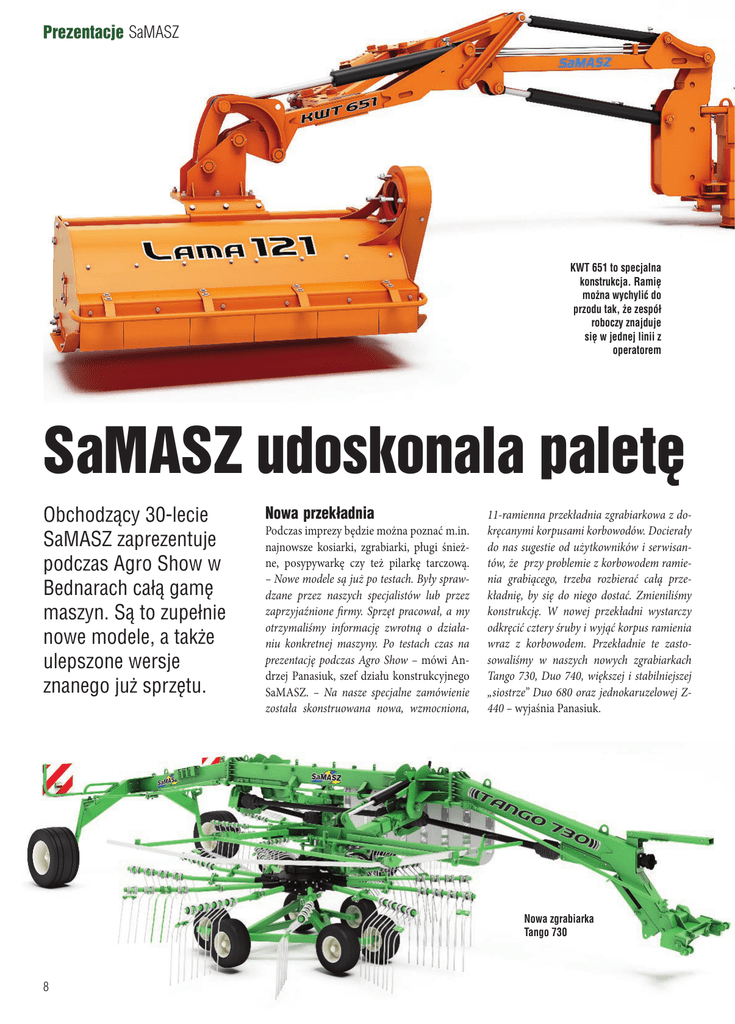 Prezentacje SaMASZ KWT 651 to specjalna konstrukcja. Ramię można wychylić do przodu tak, że zespół roboczy znajduje się w jednej linii z operatorem SaMASZ udoskonala paletę Obchodzący 30-lecie SaMASZ zaprezentuje podczas Agro Show w Bednarach całą gamę maszyn. Są to zupełnie nowe modele, a także ulepszone wersje znanego już sprzętu. Nowa przekładnia Podczas imprezy będzie można poznać m.in. najnowsze kosiarki, zgrabiarki, pługi śnieżne, posypywarkę czy też pilarkę tarczową. – Nowe modele są już po testach. Były sprawdzane przez naszych specjalistów lub przez zaprzyjaźnione firmy. Sprzęt pracował, a my otrzymaliśmy informację zwrotną o działaniu konkretnej maszyny. Po testach czas na prezentację podczas Agro Show – mówi Andrzej Panasiuk, szef działu konstrukcyjnego SaMASZ. – Na nasze specjalne zamówienie została skonstruowana nowa, wzmocniona, 11-ramienna przekładnia zgrabiarkowa z dokręcanymi korpusami korbowodów. Docierały do nas sugestie od użytkowników i serwisantów, że przy problemie z korbowodem ramienia grabiącego, trzeba rozbierać całą przekładnię, by się do niego dostać. Zmieniliśmy konstrukcję. W nowej przekładni wystarczy odkręcić cztery śruby i wyjąć korpus ramienia wraz z korbowodem. Przekładnie te zastosowaliśmy w naszych nowych zgrabiarkach Tango 730, Duo 740, większej i stabilniejszej „siostrze” Duo 680 oraz jednokaruzelowej Z440 – wyjaśnia Panasiuk. Nowa zgrabiarka Tango 730 Innowacyjnym rozwiązaniem jest też ramię wysięgnikowe kosiarki KWT 651. To duże udogodnienie dla jej użytkowników. – Chodzi o widoczność ramienia. Do tej pory operator ciągnika, aby zobaczyć je podczas pracy, musiał odwracać głowę. KWT 651 to specjalna konstrukcja. Ramię można wychylić do przodu tak, że zespół roboczy znajduje się w jednej linii z operatorem. Podczas pracy wystarczy więc spojrzeć w bok, żeby widzieć zespół roboczy – tłumaczy szef działu konstrukcyjnego SaMASZ. Nowością SaMASZ jest nowa, wzmocniona, 11-ramienna przekładnia zgrabiarkowa z dokręcanymi korpusami korbowodów. Rozwiązanie to znalazło zastosowanie w szeregu zgrabiarek firmy Premiera „karuzeli” Podczas Agro Show premierę będzie miał też nowy przetrząsacz 4-karuzelowy. P4-531 różni się od swojego poprzednika P4-530 kształtem palca sprężystego i ramienia grabiącego. Dodanie jednego zwoju, eliminacja naprężeń, osadzenie w specjalnym korpusie mocującym oraz zamocowanie do ramion wykonanych z rury pozwalają na znaczne wydłużenie żywotności palców sprężystych. Wykaszanie rowów – teraz jeszcze łatwiejsze Głowice koszące Lama 121 i 141 otrzymały nowy układ przeniesienia napędu umożliwiający łatwiejsze manewrowanie przy wy- kaszaniu rowów poboczy dróg. Zastosowanie w pługu POLI 300 odpornej na uderzenia odkładnicy z tworzywa sztucznego pozwoliło na znaczną redukcję masy, współczynnika tarcia i możliwości korodowania. Wraz z nowym RAM 300 uzupełniają bogatą ofertę pługów śnieżnych SaMASZ. Firma wróciła też do produkcji pilarek tarczowych. Wyposażona w trzy piły PT3- Nowy przetrząsacz 4-karuzelowy P4-531 różni się od P4-530 kształtem palca sprężystego i ramienia grabiącego 190 doskonale radzi sobie z cięciem gałęzi, krzaków o średnicy konarów do 15 cm. To tylko wybrane nowości, jakie SaMASZ przedstawi w Bednarach. W sumie planuje wystawić około 15 maszyn, które dopiero trafią do sprzedaży. Konstruktorzy pracują natomiast nad 30 nowymi produktami. Targi w Bednarach to bardzo ważne wydarzenie dla firmy z Białegostoku. – Agro Show ma już swój ukształtowany wizerunek, znaczenie i prestiż. Powierzchnia, liczba wystawców oraz liczba maszyn dorównują europejskim wystawom branży rolniczej. Uczestnictwo w Agro Show to przede wszystkim możliwość zaprezentowania oferty, nowości, spotkań z użytkownikami, dilerami a także z konkurencją. Jest dla nas niezwykle ważne i pouczające, by móc wysłuchać potrzeb, poznać oczekiwania i problemy naszych klientów. Na targach w Bednarach jesteśmy obecni od początku ich istnienia, będzie to więc nasza 16. edycja – mówi Norbert Pawluczuk, kierownik działu marketingu SaMASZ. Zbigniew Witamborski