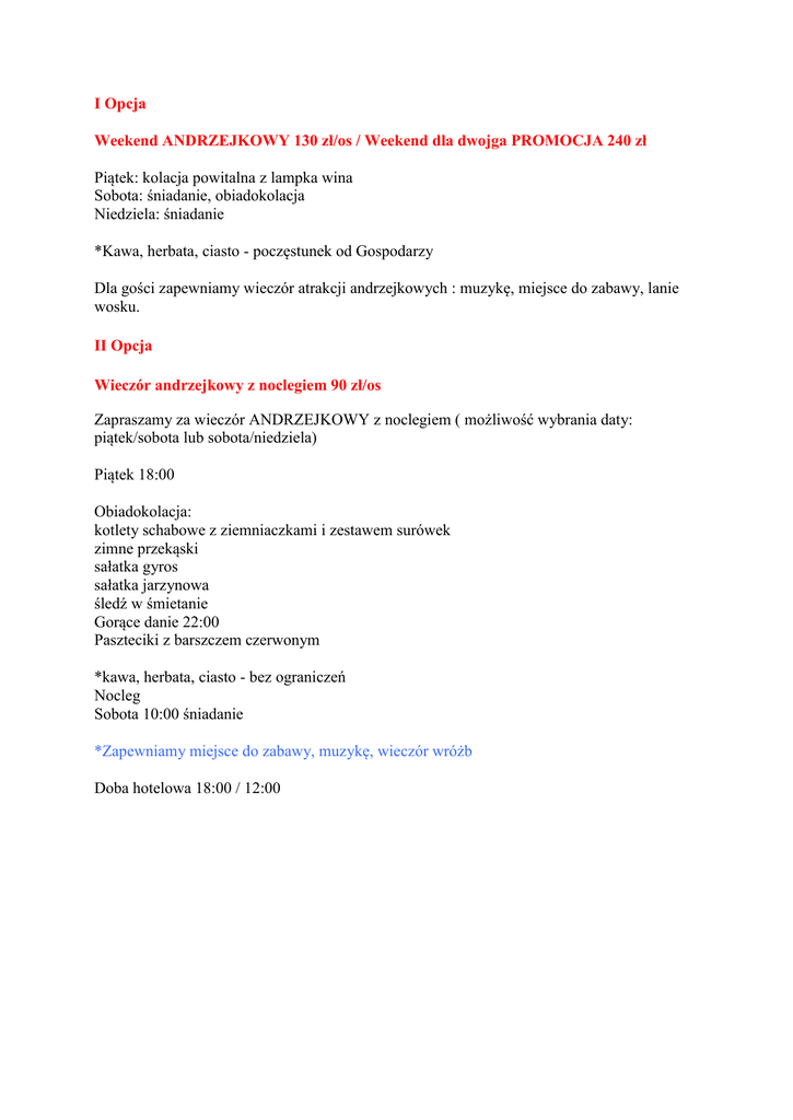 I Opcja Weekend ANDRZEJKOWY 130 zł/os / Weekend dla dwojga PROMOCJA 240 zł Piątek: kolacja powitalna z lampka wina Sobota: śniadanie, obiadokolacja Niedziela: śniadanie *Kawa, herbata, ciasto - poczęstunek od Gospodarzy Dla gości zapewniamy wieczór atrakcji andrzejkowych : muzykę, miejsce do zabawy, lanie wosku. II Opcja Wieczór andrzejkowy z noclegiem 90 zł/os Zapraszamy za wieczór ANDRZEJKOWY z noclegiem ( możliwość wybrania daty: piątek/sobota lub sobota/niedziela) Piątek 18:00 Obiadokolacja: kotlety schabowe z ziemniaczkami i zestawem surówek zimne przekąski sałatka gyros sałatka jarzynowa śledź w śmietanie Gorące danie 22:00 Paszteciki z barszczem czerwonym *kawa, herbata, ciasto - bez ograniczeń Nocleg Sobota 10:00 śniadanie *Zapewniamy miejsce do zabawy, muzykę, wieczór wróżb Doba hotelowa 18:00 / 12:00