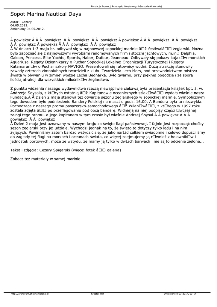 Fundacja Promocji Przemysłu Okrętowego i Gospodarki Morskiej Sopot Marina Nautical Days Autor: Cezary 04.05.2012. Zmieniony 04.05.2012.  powiększ    powiększ   powiększ   powiększ  powiększ    powiększ   powiększ   powiększ  powiększ    powiększ   powiększ  W dniach 1-3 maja br. odbywał się w najnowszej sopockiej marinie „festiwal― żeglarski. Można było zapoznać się z najnowszymi wyrobami renomowanych firm i stoczni jachtowych, m.in.: Delphia, Galeon, Princess, Elite Yachts, Sportis, Haber, Dufour, Jeanneau. Odbywały się pokazy kajakÃłw morskich Aquariusa, Regaty Dziennikarzy o Puchar Sopockiej Lokalnej Organizacji Turystycznej i Regaty KatamaranÃłw o Puchar szkoły NAVIGO. Prezentowali się ratownicy wodni. Dużą atrakcję stanowiły zawody czterech zimnolubnych twardzieli z klubu Twardziela Lech Mors, pod przewodnictwem mistrza świata w pływaniu w zimnej wodzie Lecha Bednarka. Było gwarno, przy pięknej pogodzie i ze sporą ilością atrakcji dla wszystkich miłośnikÃłw żeglarstwa. Z punktu widzenia naszego wydawnictwa rzeczą niewątpliwie ciekawą była prezentacja książek kpt. ż. w. Andrzeja Soysala, z ktÃłrych ostatnią „Kapitanowie oceanicznych szlakÃłw― wydała właśnie nasza Fundacja.  Dzień 2 maja stanowił też otwarcie sezonu żeglarskiego w sopockiej marinie. Symbolicznym tego dowodem było podniesienie Bandery Polskiej na maszt o godz. 16.00. A Bandera była to niezwykła. Pochodząca z naszego promu pasażersko-samochodowego „WilanÃłw―, z ktÃłrego w 1997 roku została zdjęta – po przeflagowaniu pod obcą banderę. Widnieją na niej podpisy części Ãłwczesnej załogi tego promu, a jego kapitanem w tym czasie był właśnie Andrzej Soysal.  powiększ    powiększ   powiększ  Dzień 2 maja jest uznawany w naszym kraju za święto flagi państwowej. I fajnie jest rozpocząć choćby sezon żeglarski przy jej udziale. Wychodzi jednak na to, że święto to dotyczy tylko lądu i na nim żyjących. Powinniśmy zatem bardzo wstydzić się, że jako narÃłd całkiem świadomie i celowo dopuściliśmy do zagłady tej flagi na morzach i oceanach świata, co więcej zdejmujemy ją rÃłwnież z holownikÃłw i jednostek portowych, może ze wstydu, że mamy ją tylko w dwÃłch barwach i nie są to odcienie zielone... Tekst i zdjęcia: Cezary Spigarski (więcej fotek – galeria) Zobacz też materiały w samej marinie http://archiwum.oficynamorska.pl Kreator PDF Utworzono 8-03-2017, 03:14