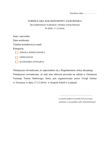 Trzcinica, dnia ……………… FORMULARZ ZGŁOSZENIOWY ZAWODNIKA DO GMINNEGO TURNIEJU TENISA STOŁOWEGO W DNIU 17.12.2016r. Imię i nazwisko: Data urodzenia: Telefon kontaktowy/e-mail: Kategoria: SZKOŁA PODSTAWOWA GIMNAZJUM KATEGORIA OTWARTA Niniejszym oświadczam, że zapoznałem się z Regulaminem, który akceptuję. Niniejszym oświadczam, że mój stan zdrowia pozwala na udział w Gminnym Turnieju Tenisa Stołowego, który jest organizowany przez Urząd Gminy w Trzcinicy w dniu 17.12.2016r. w Zespole Szkół w Laskach. ……………………………….. (czytelny podpis uczestnika lub prawnego opiekuna w przypadku osoby niepełnoletniej)
