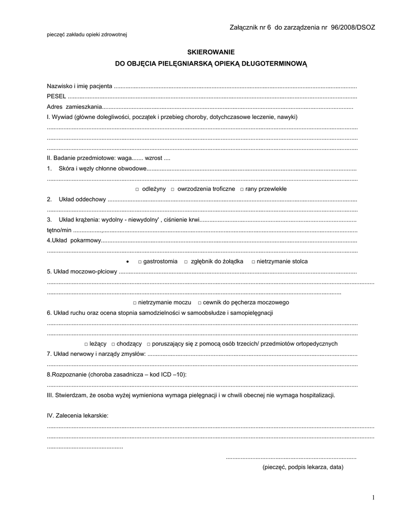 Załącznik nr 6 do zarządzenia nr 96/2008/DSOZ pieczęć zakładu opieki zdrowotnej SKIEROWANIE DO OBJĘCIA PIELĘGNIARSKĄ OPIEKĄ DŁUGOTERMINOWĄ Nazwisko i imię pacjenta ................................................................................................................................................... PESEL ............................................................................................................................................................................... Adres zamieszkania........................................................................................................................................................ I. Wywiad (główne dolegliwości, początek i przebieg choroby, dotychczasowe leczenie, nawyki) ............................................................................................................................................................................................ ............................................................................................................................................................................................ ............................................................................................................................................................................................ II. Badanie przedmiotowe: waga....... wzrost .... 1. Skóra i węzły chłonne obwodowe............................................................................................................................... ............................................................................................................................................................................................ □ odleżyny □ owrzodzenia troficzne □ rany przewlekłe 2. Układ oddechowy ....................................................................................................................................................... ............................................................................................................................................................................................ 3. Układ krążenia: wydolny - niewydolny' , ciśnienie krwi............................................................................................... tętno/min .................,.......................................................................................................................................................... 4.Układ pokarmowy........................................................................................................................................................... ............................................................................................................................................................................................ • □ gastrostomia □ zgłębnik do żołądka □ nietrzymanie stolca 5. Układ moczowo-płciowy ................................................................................................................................................ ...................................................................................................................................................................................................... .................................................................................................................................................................................. □ nietrzymanie moczu □ cewnik do pęcherza moczowego 6. Układ ruchu oraz ocena stopnia samodzielności w samoobsłudze i samopielęgnacji ............................................................................................................................................................................................ ............................................................................................................................................................................................ □ leżący □ chodzący □ poruszający się z pomocą osób trzecich/ przedmiotów ortopedycznych 7. Układ nerwowy i narządy zmysłów: ............................................................................................................................... ............................................................................................................................................................................................ 8.Rozpoznanie (choroba zasadnicza – kod ICD –10): ............................................................................................................................................................................................ III. Stwierdzam, że osoba wyżej wymieniona wymaga pielęgnacji i w chwili obecnej nie wymaga hospitalizacji. IV. Zalecenia lekarskie: ...................................................................................................................................................................................................... ...................................................................................................................................................................................................... .............................................. ............................................................................... (pieczęć, podpis lekarza, data) 1
