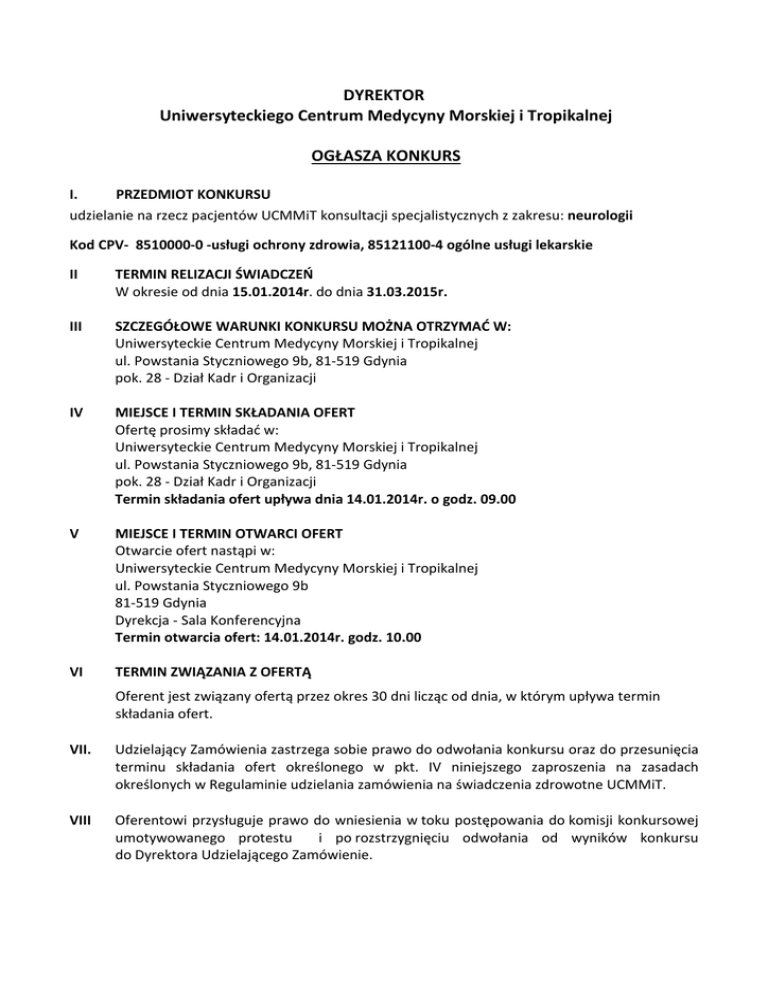 DYREKTOR Uniwersyteckiego Centrum Medycyny Morskiej i Tropikalnej OGŁASZA KONKURS I. PRZEDMIOT KONKURSU udzielanie na rzecz pacjentów UCMMiT konsultacji specjalistycznych z zakresu: neurologii Kod CPV- 8510000-0 -usługi ochrony zdrowia, 85121100-4 ogólne usługi lekarskie II TERMIN RELIZACJI ŚWIADCZEŃ W okresie od dnia 15.01.2014r. do dnia 31.03.2015r. III SZCZEGÓŁOWE WARUNKI KONKURSU MOŻNA OTRZYMAĆ W: Uniwersyteckie Centrum Medycyny Morskiej i Tropikalnej ul. Powstania Styczniowego 9b, 81-519 Gdynia pok. 28 - Dział Kadr i Organizacji IV MIEJSCE I TERMIN SKŁADANIA OFERT Ofertę prosimy składać w: Uniwersyteckie Centrum Medycyny Morskiej i Tropikalnej ul. Powstania Styczniowego 9b, 81-519 Gdynia pok. 28 - Dział Kadr i Organizacji Termin składania ofert upływa dnia 14.01.2014r. o godz. 09.00 V MIEJSCE I TERMIN OTWARCI OFERT Otwarcie ofert nastąpi w: Uniwersyteckie Centrum Medycyny Morskiej i Tropikalnej ul. Powstania Styczniowego 9b 81-519 Gdynia Dyrekcja - Sala Konferencyjna Termin otwarcia ofert: 14.01.2014r. godz. 10.00 VI TERMIN ZWIĄZANIA Z OFERTĄ Oferent jest związany ofertą przez okres 30 dni licząc od dnia, w którym upływa termin składania ofert. VII. Udzielający Zamówienia zastrzega sobie prawo do odwołania konkursu oraz do przesunięcia terminu składania ofert określonego w pkt. IV niniejszego zaproszenia na zasadach określonych w Regulaminie udzielania zamówienia na świadczenia zdrowotne UCMMiT. VIII Oferentowi przysługuje prawo do wniesienia w toku postępowania do komisji konkursowej umotywowanego protestu i po rozstrzygnięciu odwołania od wyników konkursu do Dyrektora Udzielającego Zamówienie.