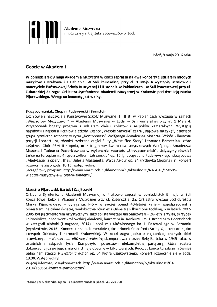 Łódź, 8 maja 2016 roku Goście w Akademii W poniedziałek 9 maja Akademia Muzyczna w Łodzi zaprasza na dwa koncerty z udziałem młodych muzyków z Krakowa i z Pabianic. W Sali kameralnej przy al. 1 Maja 4 wystąpią uczniowie i nauczyciele Państwowej Szkoły Muzycznej I i II stopnia w Pabianicach, w Sali koncertowej przy ul. Żubardzkiej 2a zagra Orkiestra Symfoniczna Akademii Muzycznej w Krakowie pod dyrekcją Marka Pijarowskiego. Wstęp na koncerty jest wolny. Skrzypcomaniak, Chopin, Paderewski i Bernstein Uczniowie i nauczyciele Państwowej Szkoły Muzycznej I i II st. w Pabianicach wystąpią w ramach „Wieczorów Muzycznych” w Akademii Muzycznej w Łodzi w Sali kameralnej przy al. 1 Maja 4. Przygotowali bogaty program z udziałem chóru, solistów i zespołów kameralnych. Wystąpią najmłodsi i najstarsi uczniowie szkoły. Zespół „Wesołe Smyczki” zagra „Bajkową muzykę”, dziecięca grupa rytmiczna zatańczy w rytm „Kontredansa” Wolfganga Amadeusza Mozarta. Wśród kilkunastu pozycji koncertu są również wybrane części Suity „West Side Story” Leonarda Bernsteina, które zaśpiewa Chór PSM II stopnia, oraz fragmenty kwartetów smyczkowych Wolfganga Amadeusza Mozarta i Tadeusza Paciorkiewicza w wykonaniu kwartetu „Skrzypcomaniak”. Usłyszymy również tańce na fortepian na 4 ręce z „Album tatrzańskie” op. 12 Ignacego Jana Paderewskiego, skrzypcową „Medytację” z opery „Thais” Jules’a Masseneta, Walca As-dur op. 34 Fryderyka Chopina i in. Koncert rozpocznie się o godz. 18.15, wstęp wolny. Szczegółowy program: http://www.amuz.lodz.pl/lifemotion/pl/aktualnosci/63-2016/150515wieczor-muzyczny-z-wizyta-w-akademii/ Maestro Pijarowski, Bartok i Czajkowski Orkiestra Symfoniczna Akademii Muzycznej w Krakowie zagości w poniedziałek 9 maja w Sali koncertowej łódzkiej Akademii Muzycznej przy ul. Żubardzkiej 2a. Orkiestra wystąpi pod dyrekcją Marka Pijarowskiego – dyrygenta, który w swojej ponad 40-letniej kariery współpracował z orkiestrami na całym świecie, wielokrotnie również z Orkiestrą Filharmonii Łódzkiej, a w latach 20022005 był jej dyrektorem artystycznym. Jako solista wystąpi Jan Snakowski – 26-letni artysta, skrzypek i altowiolista, absolwent krakowskiej Akademii, laureat m.in. Konkursu im. J. Brahmsa w Poertschach w kategorii altówki (I nagroda, 2014) i Konkursu Altówkowego im. J. Rakowskiego w Poznaniu (wyróżnienie, 2013). Koncertuje solo, kameralnie (jako członek Cracofonia String Quartet) oraz jako skrzypek Orkiestry Filharmonii Krakowskiej. W Łodzi zagra jedno z najbardziej znanych dzieł altówkowych – Koncert na altówkę i orkiestrę skomponowany przez Belę Bartoka w 1945 roku, w ostatnich miesiącach życia. Kompozytor pozostawił niekompletną partyturę, która została dokończona już po jego śmierci i istnieje obecnie w kilku wersjach. Podczas koncertu zabrzmi również pełna namiętności V Symfonia e-moll op. 64 Piotra Czajkowskiego. Koncert rozpocznie się o godz. 18.00. Wstęp wolny! Więcej informacji o wykonawcach: http://www.amuz.lodz.pl/lifemotion/pl/aktualnosci/632016/150661-koncert-symfoniczny/ Informacje: Aleksandra Bęben – [email protected], tel. 668 271 308