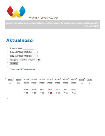 Miasto Wojkowice http://www.wojkowice.pl/main/aktualnosci/Rekrutacja-do-przedszkola-szkol-podstawowych-i /st:51/printpdf Aktualności Szukana fraza Data od (RRRR-MM-DD) Data do (RRRR-MM-DD) Kategorie wszystkie kategorie ... ▼ Szukaj Znaleziono 587 wiadomości. Pierws Poprze Aktua Aktua Aktua Aktua Aktua Aktua Aktua Następ Ostatni za dnia lności lności lności lności lności lności lności na a - - - - - - - stron stron stron stron stron stron stron a 48 a 49 a 50 a 51 a 52 a 53 a 54 2015-03-06 Marcel Sowa wśród zwycięzców w Slalomie Gigancie o Puchar Starosty Będzińskiego kategoria: Wojkowice 7 listopada odbyło się spotkanie z Generalnym Wykonawcą projektu „Rewitalizacja Parku Miejskiego w Wojkowicach” firmą KRISBUD Sp. z o.o. z Trzebini.Z ramienia Urzędu Miasta obecni byli Burmistrz Miasta Zofia Gajdzik, Zastępca Burmistrza Miasta Marek Mrozowski, Skarbnik Miasta Marek Skrobek oraz przedstawiciele urzędu z Wydziału Rozwoju oraz Wydziału Komunalnego odpowiedzialni za realizację zadania.W spotkaniu uczestniczyli ze 2015-03-06 Dowody osobiste i meldunki kategoria: Wojkowice 1 marca 2015 r. weszły w życie nowe ustawy: Ustawa o dowodach osobistych, Ustawa o ewidencji ludności oraz Prawo o aktach stanu cywilnego. Wprowadzają one zmiany, które docelowo mają ułatwić mieszkańcom załatwianie spraw w urzędzie. 2015-03-06 kategoria: Warszaty perkusyjne w „Tlenie Wojkowice“ Wojkowice 7 listopada odbyło się spotkanie z Generalnym Wykonawcą projektu „Rewitalizacja Parku Miejskiego w Wojkowicach” firmą KRISBUD Sp. z o.o. z Trzebini.Z ramienia Urzędu Miasta obecni byli Burmistrz Miasta Zofia Gajdzik, Zastępca Burmistrza Miasta Marek Mrozowski, Skarbnik Miasta Marek Skrobek oraz przedstawiciele urzędu z Wydziału Rozwoju oraz Wydziału Komunalnego odpowiedzialni za realizację zadania.W spotkaniu uczestniczyli ze 2015-03-06 Ruszyła działalność Placówki Wsparcia Dziennego „Tlen Wojkowice” kategoria: Wojkowice Od początku roku w Wojkowicach rozpoczęła swoje funkcjonowanie oraz działalność Placówka Wsparcia Dziennego „Tlen Wojkowice” – dawniej Centrum Młodzieżowe Tlen. 2015-03-05 Seniorze – przyjdź i odbierz kartę „AS-Aktywny Senior” kategoria: Wojkowice 6 marca po godzinie 15:00 Miejski Ośrodek Kultury w Wojkowicach odwiedzi, zaproszony na spotkanie Związku Emerytów i Rencistów, Wydział Polityki Społecznej Starostwa Powiatowego w Będzinie. 2015-03-04 Piotr Czyja wśród laureatów Nagród Starosty Będzińskiego kategoria: Wojkowice 7 listopada odbyło się spotkanie z Generalnym Wykonawcą projektu „Rewitalizacja Parku Miejskiego w Wojkowicach” firmą KRISBUD Sp. z o.o. z Trzebini.Z ramienia Urzędu Miasta obecni byli Burmistrz Miasta Zofia Gajdzik, Zastępca Burmistrza Miasta Marek Mrozowski, Skarbnik Miasta Marek Skrobek oraz przedstawiciele urzędu z Wydziału Rozwoju oraz Wydziału Komunalnego odpowiedzialni za realizację zadania.W spotkaniu uczestniczyli ze 2015-02-27 kategoria: Harmonogram badań wody Wojkowice Zgodnie z harmonogramem badań wody przeznaczonej do spożycia przez ludzi przedstawiamy wyniki badań monitoringu kontrolnego przeprowadzonego w dniu 28.1.2015 roku i w dniu 05.02.2015 roku na terenie Wojkowic 2015-02-25 Zmiana godzin otwarcia kasy. kategoria: Wojkowice W związku ze zmianami organizacyjnymi oraz w związku ze zmianami zasad gospodarki kasowej w Urzędzie Miasta, z dniem 6 marca 2015 r. kasa czynna będzie w następujących godzinach: 2015-02-24 Biblioteka nowej generacji - MAMY 6 TABLETÓW APPLE iPAD kategoria: Wojkowice 7 listopada odbyło się spotkanie z Generalnym Wykonawcą projektu „Rewitalizacja Parku Miejskiego w Wojkowicach” firmą KRISBUD Sp. z o.o. z Trzebini.Z ramienia Urzędu Miasta obecni byli Burmistrz Miasta Zofia Gajdzik, Zastępca Burmistrza Miasta Marek Mrozowski, Skarbnik Miasta Marek Skrobek oraz przedstawiciele urzędu z Wydziału Rozwoju oraz Wydziału Komunalnego odpowiedzialni za realizację zadania.W spotkaniu uczestniczyli ze 2015-02-23 Będzie się działo! Zespół „Piersi” w Wojkowicach. kategoria: Wojkowice 7 listopada odbyło się spotkanie z Generalnym Wykonawcą projektu „Rewitalizacja Parku Miejskiego w Wojkowicach” firmą KRISBUD Sp. z o.o. z Trzebini.Z ramienia Urzędu Miasta obecni byli Burmistrz Miasta Zofia Gajdzik, Zastępca Burmistrza Miasta Marek Mrozowski, Skarbnik Miasta Marek Skrobek oraz przedstawiciele urzędu z Wydziału Rozwoju oraz Wydziału Komunalnego odpowiedzialni za realizację zadania.W spotkaniu uczestniczyli ze Pierws Poprze Aktua Aktua Aktua Aktua Aktua Aktua Aktua Następ Ostatni za dnia lności lności lności lności lności lności lności na a - - - - - - - stron stron stron stron stron stron stron a 48 a 49 a 50 a 51 a 52 a 53 a 54