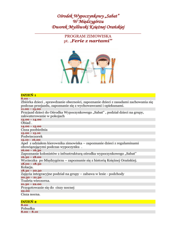 Ośrodek Wypoczynkowy „Sabat” W Międzygórzu Dworek Myśliwski Księżnej Orańskiej ________________________________________ PROGRAM ZIMOWISKA pt. „Ferie z nartami” DZIEŃ 1 8.00 – Zbiórka dzieci , sprawdzanie obecności, zapoznanie dzieci z zasadami zachowania się podczas przejazdu, zapoznanie się z wychowawcami i opiekunami. 11.00 – 13.00 Przyjazd dzieci do Ośrodka Wypoczynkowego „Sabat” , podział dzieci na grupy, zakwaterowanie w pokojach 13.00 – 14.00 Obiad . 14.00 – 15.00 Cisza poobiednia 15.00 – 15.10 Podwieczorek 15.10 - 16.00 Apel z udziałem kierownika zimowiska – zapoznanie dzieci z regulaminami obowiązującymi podczas wypoczynku . 16.00 – 16.30 Zapoznanie kolonistów z infrastrukturą ośrodka wypoczynkowego „Sabat” 16.30 – 18.00 Wycieczka po Międzygórzu – zapoznanie się z historią Księżnej Orańskiej. 18.00 – 18.30 Kolacja. 18.30 – 20.30 Zajęcia integracyjne podział na grupy – zabawa w lesie - podchody 20.30 – 21.30 Toaleta wieczorna. 21.30 – 22.00 Przygotowanie się do ciszy nocnej 22.00 Cisza nocna. DZIEŃ 2 8.00 Pobudka 8.00 – 8.10 Toaleta poranna. 8.10 – 8.30 Konkurs czystości - rywalizacja o nagrody oraz dyplomy – jury składa się z P.pielęgniarki oraz 3 przedstawicieli braci kolonijnej. 8.30 – 9.00 Śniadanie. 9.30 – 13.30 I. Zajęcia z instruktorem narciarstwa na wyciągu „u Bolka „ 14.00 – 14. 30 Obiad 14.30 – 15.30 Cisza poobiednia 15.30 – 15.40 Podwieczorek. 15.45 – 18.00 Wycieczka piesza nad „Wodospad Wilczki” w Międzygórzu. 18.00 – 19.00 Kolacja. 19.00 – 20.30 Zajęcia o charakterze aktywności twórczej - - zajęcia o charakterze krajoznawczym oraz o charakterze plastycznym - konkurs z rysunku pt. „Wodospad Wilczki” 20.30 – 21.30 Toaleta wieczorna 21.30 – 22.00 Przygotowanie się do snu. 22.00 Cisza nocna. DZIEŃ 3 8.00 Pobudka 8.00 – 8.10 Toaleta poranna. 8.10 – 8.30 Konkurs czystości - rywalizacja o nagrody oraz dyplomy – jury składa się z P.pielęgniarki oraz 3 przedstawicieli braci kolonijnej. 8.30 – 9.00 Śniadanie. 9.30 – 13.30 II. Zajęcia z instruktorem narciarstwa na wyciągu „u Bolka” 14.00 – 14.30 Obiad 14.30 – 15.30 Cisza poobiednia 15.30 – 15.40 Podwieczorek. 15.45 – 18.00 Gry zespołowe 18.00 – 18.30 Kolacja 18.30 – 21.30 Konkurs Mam Talent 2013 21.30 – 22.00 Przygotowanie do ciszy nocnej – toaleta wieczorna 22.00 Cisza nocna DZIEŃ 4 8.00 Pobudka 8.00 – 8.10 Toaleta poranna. 8.10 – 8.30 Konkurs czystości - rywalizacja o nagrody oraz dyplomy – jury składa się z P.pielęgniarki oraz 3 przedstawicieli braci kolonijnej. 8.30 – 9.00 Śniadanie. 9.30 – 13.30 III. Zajęcia z instruktorem narciarstwa na wyciągu „u Bolka” 14.00 – 14.30 Obiad 14.30 – 15.30 Cisza poobiednia 15.30 – 15.40 Podwieczorek. 15.45 – 18.00 Wycieczka piesza na Przełęcz Puchaczówka Parku Śnieżnickiego oraz przygotowania do konkursu fryzur. 18.00 – 18.30 Kolacja 18.30 – 21.30 Dyskoteka – konkurs fryzur - konkurs z nagrodami 21.30 – 22.00 Przygotowanie do ciszy nocnej – toaleta wieczorna 22.00 Cisza nocna DZIEŃ 5 8.00 Pobudka 8.00 – 8.30 Toaleta poranna 8.30 – 9.00 Konkurs czystości - rywalizacja o nagrody oraz dyplomy dla kolonistów – jury składa się z P.pielęgniarki oraz 3 przedstawicieli braci kolonijnej. 9.00 – 9.30 Śniadanie 9.30 – 12.30 Wycieczka do Ogrodu Bajek 13.00 – 13.30 Obiad 13.30 – 14.00 Cisza poobiednia. 14.00 – 14.10 Podwieczorek 14.00 – 18.00 Przygotowanie do konkursu „Karaoke Sing Star ” - wybór piosenek 18.00 – 18.30 Kolacja 18.30 – 21.30 Konkurs „Karaoke Sing Star” – konkurs z nagrodami 21.30 – 22.00 Toaleta wieczorna . 22.00 Cisza nocna DZIEŃ 6 8.00 Pobudka 8.00 – 8.30 Toaleta poranna. 8.30 – 9.00 Konkurs czystości - rywalizacja o nagrody oraz dyplomy – jury składa się z P.pielęgniarki oraz 3 przedstawicieli braci kolonijnej. 8.30 – 9.00 Śniadanie. 9.30 – 13.00 Wycieczka piesza nad Tamę w Międzygórzu 13.00 – 13. 30 Obiad 13.30 – 14.00 Cisza poobiednia 14.00 – 14.10 Podwieczorek. 14.00 – 18.00 Konkurs na pomysłowego bałwana. 18.00 – 18.30 Kolacja 18.30 – 21.30 Gry zespołowe – karty, warcaby, monopol, szachy itp. 21.30 – 22.00 Przygotowanie do ciszy nocnej 22.00 Cisza nocna DZIEŃ 7 8.00 Pobudka 8.00 – 8.30 Toaleta poranna. 8.30 – 9.00 Konkurs czystości - rywalizacja o nagrody oraz dyplomy – jury składa się z P.pielęgniarki oraz 3 przedstawicieli braci kolonijnej. 9.00 – 9.30 Śniadanie. 9.30 – 13.00 Wycieczka piesza do Sanktuarium Marii Śnieżnej na Górę Igliczną. 13.00 – 14.00 Obiad. 14.00 – 14.30 Cisza poobiednia 14.30 – 14.40 Podwieczorek 14.40 – 18.00 Zajęcia plastyczne w grupach – konkurs na pomysłowy plakat „ Sanktuarium Marii Śnieżnej” 18.00 – 18.30 Kolacja 18.30 – 22.00 Apel – wręczenie nagród oraz dyplomów dla wszystkich kolonistów. Rozstrzygnięcie konkursu czystości. Dyskoteka 22.00 – 22.30 Przygotowanie do ciszy nocnej 22.30 Cisza nocna DZIEŃ 8. 8.00 Pobudka 8.00 – 8.30 Toaleta poranna. 8.30 – 9.00 Przygotowania związane z powrotem do domów 9.00 – 9.30 Śniadanie + suchy prowiant 9.30 - 12.00 Powrót do domu. Zapraszamy!