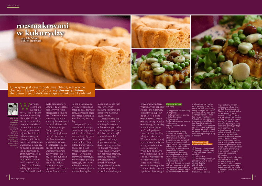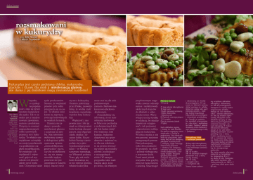 dobra karma rozsmakowani w kukurydzy Jola Słoma i Mirek Trymbulak tekst: Kukurydza jest często podstawą chleba, makaronów, placków i klusek dla osób z nietolerancją glutenu, ale dania z jej dodatkiem mogą zasmakować każdemu! W Jola Słoma & Mirek Trymbulak: projektanci mody, autorzy książek kucharskich oraz wegańskiego i bezglutenowego programu „Atelier Smaku” www. ateliersmaku.pl szystko, co zyskuje na popularności, staje się przedmiotem manipulacji dla zysku. Tak w zasadzie jest z każdym nowym zjawiskiem, nurtem i produktem. Dotyczy to rownież najpopularniejszych roślin uprawnych: pszenicy, soi i kukurydzy. To właśnie one wyjątkowo ucierpiały na swojej popularności i są poddawane ciągłym modyfikacjom, by zwiększyć ich wydajność i odporność, gdyż od wysokości ich plonów zależy życie wielu istot. Oczywiście także zyski producentów. Smutne, że większość plonów tych roślin przeznacza się na pasze. To właśnie nimi karmi się najwięcej zwierząt hodowlanych na wielkich fermach... Pszenicy nie jadamy z powodu nietolerancji glutenu i uczulenia na skrobię. Soję natomiast wybieramy zawsze z ekologicznej półki, opatrzoną opisem: „niemodyfikowana genetycznie” (na to, czy jest modyfikowana, czy nie, mamy niewielki wpływ, ponieważ nie jest uprawiana w naszym kraju). Inaczej rzecz się ma z kukurydzą. Ostatnio podróżując przez Polskę, zauważyliśmy, że wielką część krajobrazu wypełniają wysokie łany kukurydzy. Większość z nas pewnie zna i lubi jej smak w różnej postaci. Jedni kochają chrupać popcorn, inni obgryzać ciepłe, słodkie i soczyste kolby. Na południu Europy często podaje się ją jako wysokoenergetyczne danie – w Rumuni nazywane mamałygą, we Włoszech polentą. Teraz, gdy tak wielu ludzi dowiaduje się, że nie toleruje glutenu, właśnie kukurydza może stać się dla nich podstawowym ziarnem chlebowo-makaronowo-plackowo-kluskowym. Doszukaliśmy się informacji, że na razie odmiany hodowane w Polsce nie pochodzą z niebezpiecznych źródeł. Jak będzie dalej? Nie wiadomo. Jeśli kupując, będziemy dopytywać się sprzedawców i wybierać to, co dla nas właściwe, to na pewno stworzymy popyt na produkty zdrowe, pochodzące z wiarygodnych źródeł. W naszym przypadku takie małe lokalne akcje, krok po kroku, na własnym przydomowym targowisku zawsze odnosiły sukces i mobilizowały okolicznych kupców do dbałości o odpowiedni towar. Warto włożyć trochę wysiłku w edukację, by między innymi nie rezygnować z tak pożywnej i wartościowej rośliny, jaką jest kukurydza. W końcu można z niej wyczarować mnóstwo przepysznych potraw. Dziś pokazujemy tylko dwa podstawowe przepisy: na chleb i polentę wzbogaconą o sezonowe kurki. Przed nami jednak wszystkie inne grzyby, które też będą świetne z polentą. Smacznego! Polenta z kurkami 4–6 porcji 25 dag polenty kukurydzianej 30 dag kurek 4 łyżki czerwonej soczewicy 3 łyżki słonecznika 1 łyżeczka soli 0,5 łyżeczki czarnego pieprzu 1,5 l wrzątku Olej do smażenia (około 4 łyżki) Kurki dokładnie myjemy i kroimy na małe kawałki. Do garnka wsypujemy ziarna słonecznika i chwilkę je podprażamy. Gdy słonecznik lekko się przyrumieni, dolewamy olej, od razu dodajemy pokrojone wcześniej kurki i smażymy, ciągle mieszając. Doprawiamy pieprzem i odrobiną soli, dodajemy czerwoną soczewicę, całość chwilkę podprażamy i wlewamy wrzątek. Wszystko gotujemy kilka minut, następnie dosypujemy powoli polentę i energicznie mieszamy, ponieważ polenta bardzo szybko tężeje. Gotową polentę przekładamy do foremek i odstawiamy na chwilkę do przestygnięcia. W tym czasie na talerzach możemy ułożyć warzywa na sałatkę (kilka liści sałaty, bób, garść zielonego groszku – może być świeży strączkowy). Gdy polenta już przestygnie i stwardnieje, przekładamy ją z foremki na patelnię (na minutkę!), przesmażamy ją z obu stron i wykładamy na talerz. Sałatkę i polentę skrapiamy octem balsamicznym aromatyzowanym truflą i podajemy. Kukurydziany chleb z suszonymi pomidorami 40 dag mąki kukurydzianej 30 dag mąki ziemniaczanej 5 dag zmielonego siemienia lnianego 700 ml wrzątku 100 ml suszonych krojonych pomidorów wraz z oliwą 7,5 dag drożdży 200 ml wody 1 szczypta cukru 1–1,5 łyżeczki soli Siemię lniane zalewa- my wrzątkiem, dokładnie miksujemy i odstawiamy na bok do przestygnięcia. Następnie w ciepłej wodzie rozpuszczamy drożdże, dodając do nich odrobinę cukru i również odstawiamy na bok, by drożdże zapracowały. Wszystkie suche składniki łączymy ze sobą, dolewamy przestygniętego siemienia lnianego i powoli miksujemy. W trakcie miksowania dolewamy zaczyn, a na sam koniec dodajemy pokrojone suszone pomidory wraz z oliwą. Całość wyrabiamy ręcznie lub w maszynie do mieszania chleba przez kilka minut. Gdy ciasto będzie już dobrze wymieszane, przelewamy je do foremek i wstawiamy do nienagrzanego piekarnika. By ciasto wyrosło, włączamy piekarnik na termoobieg na temperaturę 40 st. C. na około 30 min. Następnie, gdy całość wyrośnie, włączamy piekarnik na 200 st. C i pieczemy chleb przez około 60 min. 14 15 www.vege.com.pl dobra karma