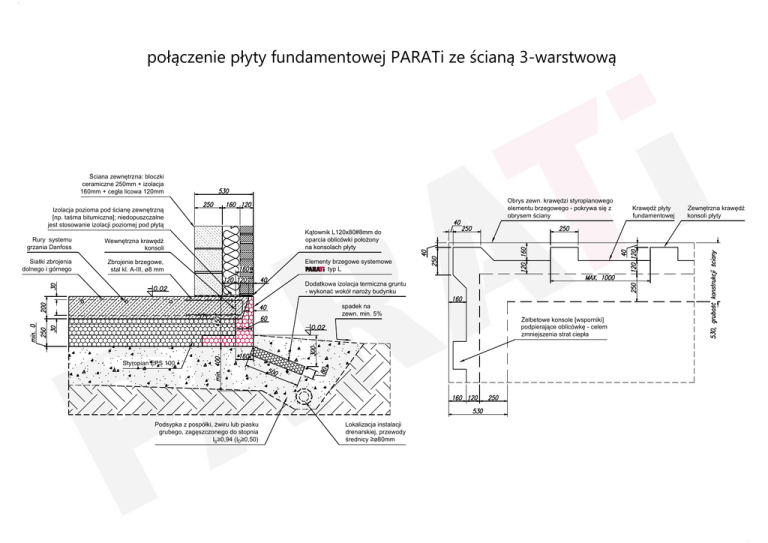 połączenie płyty fundamentowej PARATi ze ścianą 3-warstwową Ściana zewnętrzna: bloczki ceramiczne 250mm + izolacja 160mm + cegła licowa 120mm Obrys zewn. krawędzi styropianowego elementu brzegowego - pokrywa się z obrysem ściany Izolacja pozioma pod ścianę zewnętrzną [np. taśma bitumiczna]; niedopuszczalne jest stosowanie izolacji poziomej pod płytą Rury systemu grzania Danfoss Wewnętrzna krawędź konsoli Siatki zbrojenia dolnego i górnego Zbrojenie brzegowe, stal kl. A-III, ø8 mm Kątownik L120x80#8mm do oparcia oblicówki położony na konsolach płyty Elementy brzegowe systemowe typ L Dodatkowa izolacja termiczna gruntu - wykonać wokół naroży budynku spadek na zewn. min. 5% Żelbetowe konsole [wsporniki] podpierające oblicówkę - celem zmniejszenia strat ciepła Styropian EPS 100 Podsypka z pospółki, żwiru lub piasku grubego, zagęszczonego do stopnia IS≥0,94 (ID≥0,50) Lokalizacja instalacji drenarskiej, przewody średnicy ≥ø80mm Krawędź płyty fundamentowej Zewnętrzna krawędź konsoli płyty