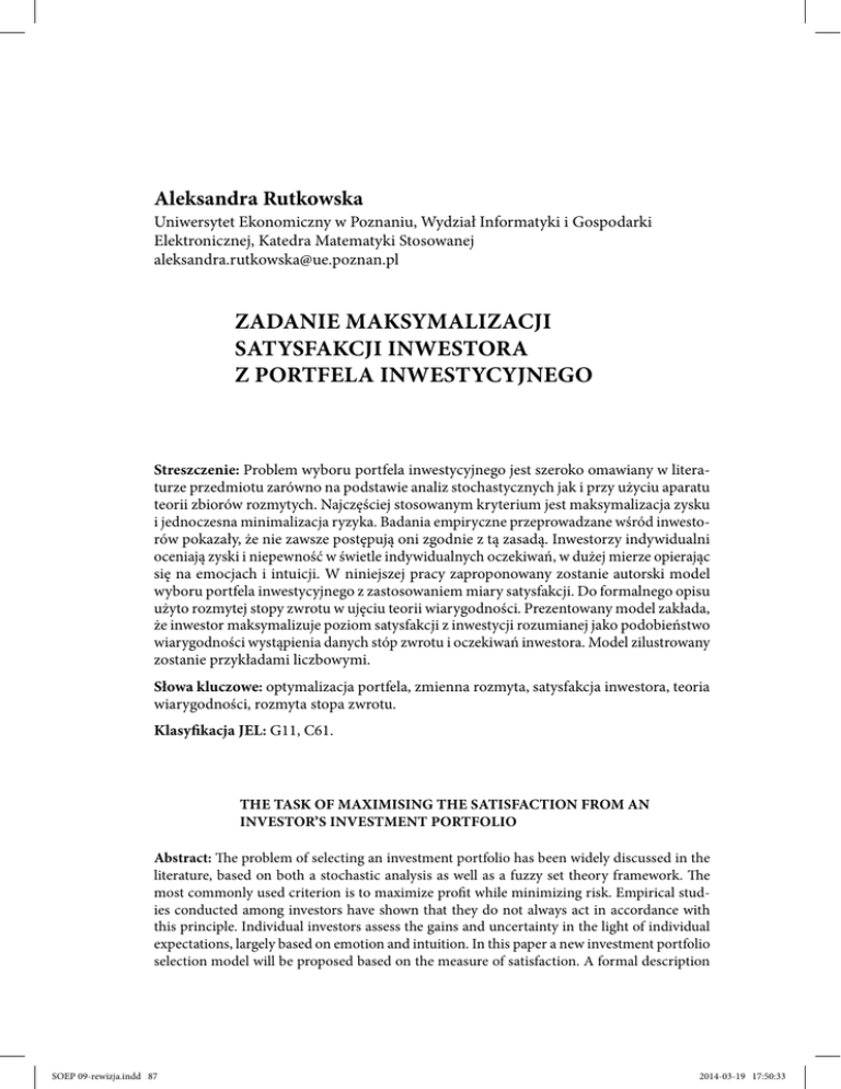 Aleksandra Rutkowska Uniwersytet Ekonomiczny w Poznaniu, Wydział Informatyki i Gospodarki Elektronicznej, Katedra Matematyki Stosowanej [email protected] ZADANIE MAKSYMALIZACJI SATYSFAKCJI INWESTORA Z PORTFELA INWESTYCYJNEGO Streszczenie: Problem wyboru portfela inwestycyjnego jest szeroko omawiany w literaturze przedmiotu zarówno na podstawie analiz stochastycznych jak i przy użyciu aparatu teorii zbiorów rozmytych. Najczęściej stosowanym kryterium jest maksymalizacja zysku i jednoczesna minimalizacja ryzyka. Badania empiryczne przeprowadzane wśród inwestorów pokazały, że nie zawsze postępują oni zgodnie z tą zasadą. Inwestorzy indywidualni oceniają zyski i niepewność w świetle indywidualnych oczekiwań, w dużej mierze opierając się na emocjach i intuicji. W niniejszej pracy zaproponowany zostanie autorski model wyboru portfela inwestycyjnego z zastosowaniem miary satysfakcji. Do formalnego opisu użyto rozmytej stopy zwrotu w ujęciu teorii wiarygodności. Prezentowany model zakłada, że inwestor maksymalizuje poziom satysfakcji z inwestycji rozumianej jako podobieństwo wiarygodności wystąpienia danych stóp zwrotu i oczekiwań inwestora. Model zilustrowany zostanie przykładami liczbowymi. Słowa kluczowe: optymalizacja portfela, zmienna rozmyta, satysfakcja inwestora, teoria wiarygodności, rozmyta stopa zwrotu. Klasyfikacja JEL: G11, C61. THE TASK OF MAXIMISING THE SATISFACTION FROM AN INVESTOR’S INVESTMENT PORTFOLIO Abstract: The problem of selecting an investment portfolio has been widely discussed in the literature, based on both a stochastic analysis as well as a fuzzy set theory framework. The most commonly used criterion is to maximize profit while minimizing risk. Empirical studies conducted among investors have shown that they do not always act in accordance with this principle. Individual investors assess the gains and uncertainty in the light of individual expectations, largely based on emotion and intuition. In this paper a new investment portfolio selection model will be proposed based on the measure of satisfaction. A formal description SOEP 09-rewizja.indd 87 2014-03-19 17:50:33 88 Aleksandra Rutkowska of the fuzzy environment is used based on the rate of return. This model assumes that an investor maximizes their level of satisfaction with an investment, understood as the similarity between the reliability of the fuzzy returns and the investor’s expectations. The model is illustrated with mathematical examples to illustrate the optimization idea and compare it to the mean-variance model. Keywords: portfolio optimization, fuzzy variable, investor satisfaction, credibility theory, fuzzy returns. Wstęp Zagadnienie optymalizacji portfela inwestycyjnego od czasów publikacji Markowitza [Markowitz 1952] jest szeroko omawianym problemem nowoczesnych finansów. Główny nurt badań opiera się na analizie probabilistycznej. Od lat 90. ubiegłego stulecia rozwijają się modele wyboru portfela wykorzystujące metody rozmyte. Zwolennicy podejścia rozmytego podkreślają brak precyzji i pełnej informacji o prawdopodobieństwie stóp zwrotu oraz trudne do spełnienia założenia teorii Markowitza. Aparat logiki wielowartościowej zaproponowany przez Zadeha pozwala na modelowanie niepewności i niejednoznaczności danych płynących z rynku, a także umożliwia modelowanie preferencji inwestorów. Modele wykorzystujące logikę rozmytą, nazywane rozmytymi lub nieostrymi, można podzielić na trzy rodzaje: stosujące teorię decyzji rozmytych; programowanie przedziałowe; teorię możliwości i wiarygodności1. Niezależnie od użytego aparatu matematycznego poszukiwanie optymalnego portfela polega na maksymalizowaniu zysku z inwestycji przy jednoczesnej minimalizacji niepewności. Dużo badań empirycznych prowadzonych na rynkach finansowych ujawniło istnienie wielu odstępstw od tej zasady [Bachmann i Hens 2008; Zielonka 2008]. Według Ogólnopolskiego Badania Inwestorów Indywidualnych (OBI) z 2012 roku inwestorzy kierują się przede wszystkim własnymi analizami (61,8%) oraz wyczuciem (57,4%). Największa grupa inwestorów (38%) przy podejmowaniu decyzji łączy ze sobą analizę techniczną i fundamentalną. Analiza techniczna jest preferowana przez 21,8%, a analiza fundamentalna przez 17,6%, podczas gdy 21,5% przyznaje, że nie potrafi analizować instrumentów finansowych2. Wyniki ukazują brak 1 Zaproponowana w 2004 r. przez Liu [Liu 2004] teoria wiarygodności może być traktowana jako rozwinięcie teorii możliwości. Teoria możliwości opiera się na pojęciu miary możliwości (possibility) i konieczności (necessity), teoria wiarygodności (credibility) na mierze wiarygodności będącej średnią arytmetyczną miar możliwości i konieczności. 2 http://www.sii.org.pl/edukacja,i,analizy/badania,i,rankingi/ogolnopolskie,badanie,inwestorow,-,obi,2012;4380.html. SOEP 09-rewizja.indd 88 2014-03-19 17:50:33 Zadanie maksymalizacji satysfakcji inwestora z portfela inwestycyjnego 89 praktycznych zastosowań analizy portfelowej. Przyczyną może być zbyt duża złożoność obliczeniowa, trudności w interpretacji lub brak znajomości metod opartych na analizie miar zysku i ryzyka. Ponadto behawioralna analiza portfelowa podkreśla, że cechą rzeczywistych portfeli jest ich silne uzależnienie od emocji. Inwestorzy starają się przede wszystkim ograniczyć potencjalne negatywne emocje i nasilić emocje pozytywne. Z tego powodu istotne i potrzebne jest określenie nowych kryteriów optymalizacji rozumianych intuicyjnie. W szerszej perspektywie może zaowocować to popularyzacją wśród inwestorów świadomego doboru aktywów do portfela. Próbą odpowiedzi na te potrzeby jest proponowane w artykule zadanie maksymalizacji satysfakcji inwestora. Kotler [Kotler 1967] zdefiniował satysfakcję klienta jako stan odczuwany przez jednostkę i związany z porównaniem postrzeganych cech oraz oczekiwań jednostki dotyczących tych cech. Analogic