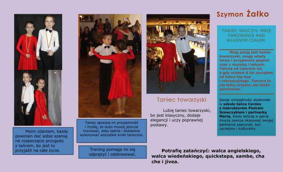 Szymon Żałko TANIEC NAUCZYŁ MNIE PANOWANIA NAD WŁASNYM CIAŁEM. Moją pasją jest taniec towarzyski, mogę wtedy łatwo i przyjemnie spędzić czas z muzyką i tańcem. Tańczę od czterech lat, a gdy miałem 6 lat zacząłem od tańca hip hop i rekreacyjnego. Tancerz to nie tylko artysta, ale także sportowiec. Taniec towarzyski Moim zdaniem, każdy powinien dać sobie szansę na rozpoczęcie przygody z tańcem, bo jest to przyjaźń na całe życie. Taniec sprawia mi przyjemność i myślę, że dużo muszę jeszcze trenować, żeby ładnie i dokładnie wykonywać wszystkie kroki taneczne. Trening pomaga mi się odprężyć i odstresować. Lubię taniec towarzyski, bo jest klasyczny, dodaje elegancji i uczy poprawnej postawy. Swoje umiejętności doskonale w szkole tańca Cordex z instruktorem Piotrem Szewczykiem i partnerką Martą. Kiedy tańczę w parze muszę zawsze okazywać swojej partnerce szacunek, być uprzejmy i kulturalny. Potrafię zatańczyć: walca angielskiego, walca wiedeńskiego, quickstepa, sambe, cha che i jivea. .