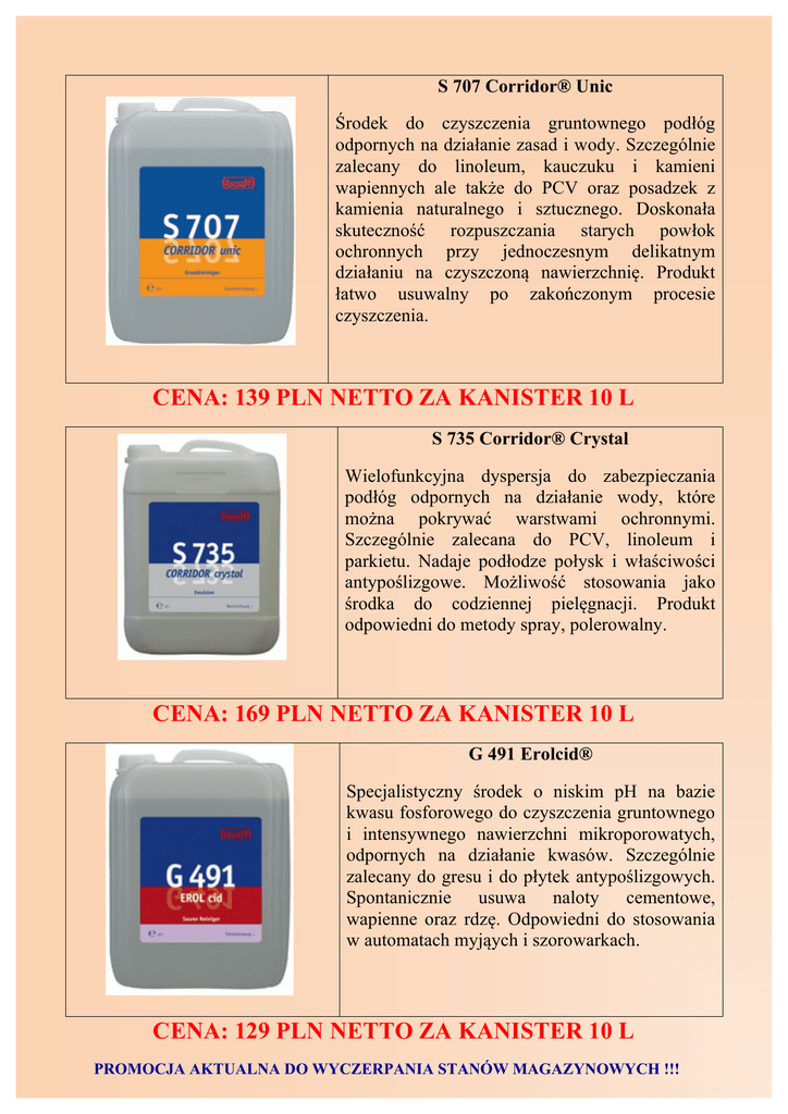 S 707 Corridor® Unic Środek do czyszczenia gruntownego podłóg odpornych na działanie zasad i wody. Szczególnie zalecany do linoleum, kauczuku i kamieni wapiennych ale także do PCV oraz posadzek z kamienia naturalnego i sztucznego. Doskonała skuteczność rozpuszczania starych powłok ochronnych przy jednoczesnym delikatnym działaniu na czyszczoną nawierzchnię. Produkt łatwo usuwalny po zakończonym procesie czyszczenia. CENA: 139 PLN NETTO ZA KANISTER 10 L S 735 Corridor® Crystal Wielofunkcyjna dyspersja do zabezpieczania podłóg odpornych na działanie wody, które można pokrywać warstwami ochronnymi. Szczególnie zalecana do PCV, linoleum i parkietu. Nadaje podłodze połysk i właściwości antypoślizgowe. Możliwość stosowania jako środka do codziennej pielęgnacji. Produkt odpowiedni do metody spray, polerowalny. CENA: 169 PLN NETTO ZA KANISTER 10 L G 491 Erolcid® Specjalistyczny środek o niskim pH na bazie kwasu fosforowego do czyszczenia gruntownego i intensywnego nawierzchni mikroporowatych, odpornych na działanie kwasów. Szczególnie zalecany do gresu i do płytek antypoślizgowych. Spontanicznie usuwa naloty cementowe, wapienne oraz rdzę. Odpowiedni do stosowania w automatach myjąych i szorowarkach. CENA: 129 PLN NETTO ZA KANISTER 10 L PROMOCJA AKTUALNA DO WYCZERPANIA STANÓW MAGAZYNOWYCH !!! T 464 Bucasan® Trendy Środek na bazie kwasu amidosulfonowego stosowany do czyszczenia w sanitariatach i pomieszczeniach mokrych/wilgotnych, nawierzchni odpornych na działanie kwasów takich jak pisuary, muszle WC, umywalki i płytki. Szczególnie zalecany do ceramiki sanitarnej, nawierzchni chromowanych i ze stali nierdzewnej. Skutecznie rozpuszcza naloty wapienne, brud, resztki mydła. W koncentracie produkt wykazuje działanie antybakteryjne, wysycha szybko bez pozostawiania smug i konieczności dosuszania (efekt skraplania). CENA: 99 PLN NETTO ZA KANISTER 10 L Vc-241 nano orange 1l Skoncentrowany, nowoczesny, antystatyczny środek do mycia wszelkich powierzchni odpornych na działanie wody, posiadający pomarańczowy, orzeźwiający zapach. Dzięki zawartości alkoholu szybko odparowuje, nie pozostawiając na mytej posadce żadnych smug i zabrudzeń. Szczególnie zalecany do marmuru, płytek szkliwionych, ceramiki, PCV i innych powierzchni z tworzyw sztucznych zarówno w myciu ręcznym jak i automatami czyszczącymi. CENA: 9,90 PLN NETTO ZA BUTELKĘ 1 L Glass Cleaner Red 5 l Skuteczny i ekonomiczny preparat do szybkiego oczyszczania powierzchni szklanych - okien, witryn, szyb samochodowych, luster oraz ceramiki, glazury, urządzeń sanitarnych, powierzchni malowanych, lakierowanych, nierdzewnych itp. z zanieczyszczeń tłuszczowych. Doskonale sprawdza się przy czyszczeniu okapów kuchennych, ościeżnic i drzwi, poręczy ze stali nierdzewnej itp. Bardzo szybko odparowuje, nie pozostawia smug CENA: 59 PLN NETTO ZA KANISTER 5 L PROMOCJA AKTUALNA DO WYCZERPANIA STANÓW MAGAZYNOWYCH !!!