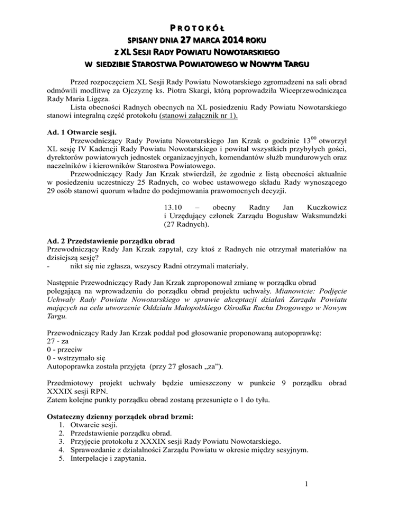 PROTOKÓŁ SPISANY DNIA 27 MARCA 2014 ROKU Z XL SESJI RADY POWIATU NOWOTARSKIEGO W SIEDZIBIE STAROSTWA POWIATOWEGO W NOWYM TARGU Przed rozpoczęciem XL Sesji Rady Powiatu Nowotarskiego zgromadzeni na sali obrad odmówili modlitwę za Ojczyznę ks. Piotra Skargi, którą poprowadziła Wiceprzewodnicząca Rady Maria Ligęza. Lista obecności Radnych obecnych na XL posiedzeniu Rady Powiatu Nowotarskiego stanowi integralną część protokołu (stanowi załącznik nr 1). Ad. 1 Otwarcie sesji. Przewodniczący Rady Powiatu Nowotarskiego Jan Krzak o godzinie 1300 otworzył XL sesję IV Kadencji Rady Powiatu Nowotarskiego i powitał wszystkich przybyłych gości, dyrektorów powiatowych jednostek organizacyjnych, komendantów służb mundurowych oraz naczelników i kierowników Starostwa Powiatowego. Przewodniczący Rady Jan Krzak stwierdził, że zgodnie z listą obecności aktualnie w posiedzeniu uczestniczy 25 Radnych, co wobec ustawowego składu Rady wynoszącego 29 osób stanowi quorum władne do podejmowania prawomocnych decyzji. 13.10 – obecny Radny Jan Kuczkowicz i Urzędujący członek Zarządu Bogusław Waksmundzki (27 Radnych). Ad. 2 Przedstawienie porządku obrad Przewodniczący Rady Jan Krzak zapytał, czy ktoś z Radnych nie otrzymał materiałów na dzisiejszą sesję? nikt się nie zgłasza, wszyscy Radni otrzymali materiały. Następnie Przewodniczący Rady Jan Krzak zaproponował zmianę w porządku obrad polegającą na wprowadzeniu do porządku obrad projektu uchwały. Mianowicie: Podjęcie Uchwały Rady Powiatu Nowotarskiego w sprawie akceptacji działań Zarządu Powiatu mających na celu utworzenie Oddziału Małopolskiego Ośrodka Ruchu Drogowego w Nowym Targu. Przewodniczący Rady Jan Krzak poddał pod głosowanie proponowaną autopoprawkę: 27 - za 0 - przeciw 0 - wstrzymało się Autopoprawka została przyjęta (przy 27 głosach „za”). Przedmiotowy projekt uchwały będzie umieszczony w punkcie 9 porządku obrad XXXIX sesji RPN. Zatem kolejne punkty porządku obrad zostaną przesunięte o 1 do tyłu. Ostateczny dzienny porządek obrad brzmi: 1. Otwarcie sesji. 2. Przedstawienie porządku obrad. 3. Przyjęcie protokołu z XXXIX sesji Rady Powiatu Nowotarskiego. 4. Sprawozdanie z działalności Zarządu Powiatu w okresie między sesyjnym. 5. Interpelacje i zapytania. 1 6. Podjęcie Uchwały Rady Powiatu zmiany Uchwały Budżetowej na rok 2014 nr 270/XXXVII/2013 Rady Powiatu Nowotarskiego z dnia 30 grudnia 2013 roku. 7. Podjęcie Uchwały Rady Powiatu Nowotarskiego w sprawie udzielenia pomocy finansowej na rzecz Gminy Miasta Nowy Targ. 8. Podjęcie Uchwały Rady Powiatu Nowotarskiego w sprawie rozpatrzenia wezwania do usunięcia naruszenia prawa złożonego przez Pana Jacka Sikorskiego. 9. Podjęcie Uchwały Rady Powiatu Nowotarskiego w sprawie akceptacji działań Zarządu Powiatu mających na celu utworzenie Oddziału Małopolskiego Ośrodka Ruchu Drogowego w Nowym Targu. 10. Podjęcie Uchwały Rady Powiatu Nowotarskiego w sprawie przyjęcia sprawozdań z działalności Komisji Rady Powiatu Nowotarskiego za rok 2013. 11. Podjęcie Uchwały Rady Powiatu Nowotarskiego w sprawie ustalenia planów pracy Komisji Rady Powiatu Nowotarskiego na rok 2014. 12. Sprawozdanie z działalności Rady Powiatu Nowotarskiego za 2013 rok. 13. Ocena Zasobów Pomocy Społecznej za rok 2013 Powiatowego Centrum Pomocy Rodzinie w Nowym Targu. 14. Sprawozdanie z działalności Powiatowego Centrum Pomocy Rodzinie w Nowym Targu za rok 2013. 15. Sprawozdanie z działalności Powiatowego Zarządu Dróg w Nowym Targu za rok 2013. 16. Analiza rynku pracy w Powiecie Nowotarskim – aktywizacja rynku pracy i efekty podejmowanych działań przez Powiatowy Urząd Pracy w Nowym Targu w roku 2013. 17. Odpowiedzi na interpelacje i zapytania. 18. Wolne wnioski. Ad. 3 Przyjęcie protokołu z XXXIX sesji Rady Powiatu Nowotarskiego. Przewodniczący Rady Jan Krzak poinformował, iż nikt z Radnych przed rozpoczęciem sesji nie zgłosił pisemnych uwag do protokołu. Następnie Przewodniczący Rady Jan Krzak poddał pod głosowanie protokół z XXXIX sesji Rady Powiatu Nowotarskiego IV kadencji: 27 - za 0 - przeciw 0 - wstrzymał się Protokół został przyjęty (przy 27 głosach „za”). 13.14 obecny Wicestarosta Maciej Jachymiak (28 radnych). Ad. 4 Sprawozdanie z działalności Zarządu Powiatu w okresie między sesyjnym. Sprawozdanie przedstawił Starosta Krzysztof Faber (stanowi załącznik nr 2). Przewodniczący Rady Jan Krzak zapytał Radnych, czy mają pytania do sprawozdania. Wiceprzewodnicząca Rady Maria Ligęza poprosiła, aby omówić szczegółowo temat związany z wprowadzeniem strefy płatnego parkowania w Nowym Targu. Starosta Krzysztof Faber odpowiedział, że stawki za parkowanie ustala Urząd Miasta Nowego Targu. Strefa ta będzie obejmowała również drogi powiatowe Dyrektor PZD w imieniu Zarządu Powiatu prowadzi rozmowy z Urzędem Miasta w zakresie rozwiązań, które są konieczne żeby strefa parkowania została wprowadzona. Wiceprzewodnicząca Rady Maria zapytała, do czyjego budżetu będą wpływać środki za parkowanie? 2 Starosta Krzysztof Faber odpowiedział, że środki pobierane z dróg powiatowych będą trafiały do budżetu Powiatu. Obecnie w tym zakresie również trwają rozmowy. 13.25 – obecny Radny Mirosław Kaczmarczyk (29 radnych). Radny Antoni Rapacz zapytał odnośnie Małopolskiego Ośrodka Ruchu Drogowego. Radny zapytał, kto przekazał 1 mln zł Marszałek Województwa Małopolskiego, czy Wojewoda Małopolski? Starosta Krzysztof Faber powiedział, ze wyjaśni temat w wprowadzonym punkcie do dzisiejszego porządku obrad tj. pkt 9 Podjęcie Uchwały Rady Powiatu Nowotarskiego w sprawie akceptacji działań Zarządu Powiatu mających na celu utworzenie Oddziału Małopolskiego Ośrodka Ruchu Drogowego w Nowym Targu. Ad. 5 Interpelacje i zapytania. Radny Władysław Tylka zgłoszona interpelacja stanowi załącznik nr 3. Radny Leszek Wołek zgłoszona interpel