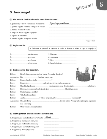 5 5 Smacznego! 1 Für welche Gerichte braucht man diese Zutaten? To jest zupa pomidorowa. 1. pomidory + rosół + śmietana + makaron .............................................................................................................................. 2. jabłka + jajka + masło + mąka* + cukier .............................................................................................................................. 3. buraki + rosół + uszka .............................................................................................................................. 4. mąka + woda + jajka + jagody .............................................................................................................................. 5. ogórki + śmietana .............................................................................................................................. 6. mleko + jajka + mąka + masło .............................................................................................................................. * mąka = Mehl 2 Ergänzen Sie. 0 śmietana 0 pieczeń 0 kapusta 0 kotlet 0 kasza 0 wino 0 zupa 0 napoje 0 1. .......................................... panierowany 5. kiszona 2. .......................................... gryczana 6. wytrawne 3. .......................................... grzybowa 7. bita 4. .......................................... wieprzowa 8. bezalkoholowe .................................................... ............................................... ............................................................ .................................... 3 Ergänzen Sie das Gespräch. Kelner: Dzień dobry, proszę, tu jest karta. Co podać do picia? Agnieszka: Dla ....................................... herbatę z cytryną. Kelner: Proszę bardzo. A dla .......................................? Jerzy: Proszę też ......................................., ale nie z cytryną, tylko z rumem. Kelner: Na obiad polecam ................................... z makaronem a na drugie danie ................................... schabowy. Jerzy: Dobrze, wezmę rosół, ale ja nie jem ........................................ Chciałbym rybę. Kelner: Może karp po polsku? Jerzy: Tak, bardzo dobrze. Kelner: A dla .......................................? Może krupnik, albo ....................................... z uszkami? Agnieszka: Nie, nie lubię ...................................... ..................................... też nie chcę. Proszę tylko pierogi z jagodami i ze śmietaną. Kelner: Oczywiście, proszę bardzo. 4 Wem gehören diese Sachen? Schreiben Sie. Jurka. 1. Czyja to jest karta kredytowa? (Jurek) ....................................... 2. Czyje to są pieniądze? (Ten pan) ....................................... ....................................... 3. Czyj to jest rachunek? (Tadeusz) ....................................... 4. Czyja to jest kawa? (Tamta pani) ....................................... ....................................... 5. Czyje to są dżinsy? (Gosia) ....................................... www.hueber.de . 05.5369 Max Hueber Verlag, Danuta Malota Dieses Blatt darf fotokopiert werden 6 6 Wszystkiego najlepszego! 1 Wie heißen die Wochentage? Notieren Sie diese in der chronologischen Reihenfolge. la 0 piąt 0 bo 0 ponie 0 rek 0 nie 0 dzia 0 wto 0 tek 0 so 0 ek 0 ta 0 łek 0 śro 0 czwar 0 dzie 0 da 0 0 0 1. ............................................... 2. ............................................... 3. ............................................... 5. ............................................... 6. ............................................... 7. ............................................... 4. ............................................... 2 Antworten Sie. 1. Co musisz robić jutro rano? ....................................................................................................................................... . 2. Co musisz zrobić w niedzielę? ....................................................................................................................................... . 3. Co chcesz robić we wtorek wieczorem? ....................................................................................................................................... . 4. Kiedy musisz sprzątać? ....................................................................................................................................... . 3 Was passt zusammen? Ergänzen Sie das Substantiv in der passenden Form. 0 kwiaty 0 wino 0 krawat 0 kino 0 szalik 0 kwiatów 1. bukiet ........................................................... 2. koszula i ........................................................... 3. rękawiczki i ........................................................... 4. lampka ........................................................... 5. bilety do ........................................................... 4 Ergänzen Sie – falls nötig – die Endungen. 1. Marta nie chce drog................ prezent................. 2. Tu nie ma niestety woln................ stolik................. 3. Muszę kupić siedem czerwon................ róż................. 4. Tomek ma dużo interesując................ kompakt................. 5. Chciałbym mieć kilka polsk................ książ................. 6. Muszę kupić pięć album................ o Krakowie dla moich gośc................ z Anglii. 7. Na przyjęcie imieninowe muszę kupić kilka szampan................. 8. Nie lubię naleśnik................ i pierog................. www.hueber.de . 05.5369 Max Hueber Verlag, Danuta Malota Dieses Blatt darf fotokopiert werden Lösungen 5 Smacznego! 6 Wszystkiego najlepszego! 1 1 2. To jest szarlotka. 3. To jest barszcz. 4. To są pierogi z jagodami. 5. To jest mizeria. 6. To są naleśniki. 1. poniedziałek, 2. wtorek, 3. środa, 4. czwartek, 5. piątek, 6. sobota, 7. niedziela 2 2 1. kotlet pani