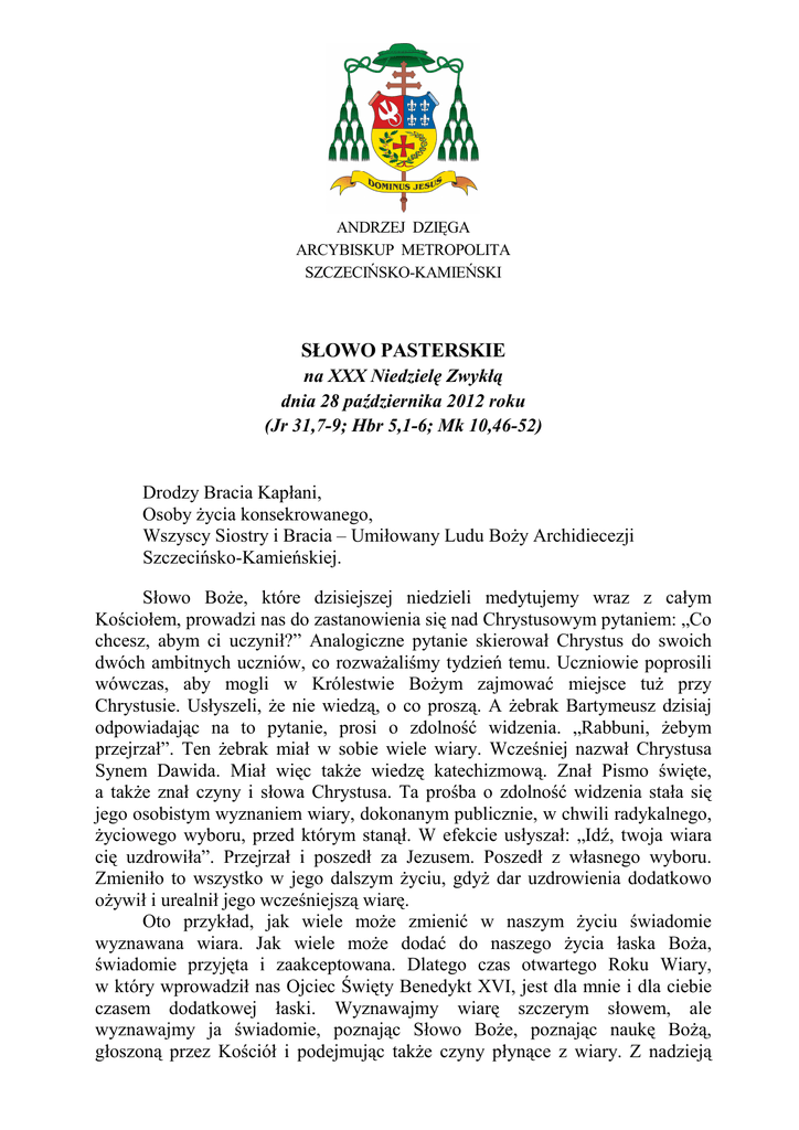 ANDRZEJ DZIĘGA ARCYBISKUP METROPOLITA SZCZECIŃSKO-KAMIEŃSKI SŁOWO PASTERSKIE na XXX Niedzielę Zwykłą dnia 28 października 2012 roku (Jr 31,7-9; Hbr 5,1-6; Mk 10,46-52) Drodzy Bracia Kapłani, Osoby Ŝycia konsekrowanego, Wszyscy Siostry i Bracia – Umiłowany Ludu BoŜy Archidiecezji Szczecińsko-Kamieńskiej. Słowo BoŜe, które dzisiejszej niedzieli medytujemy wraz z całym Kościołem, prowadzi nas do zastanowienia się nad Chrystusowym pytaniem: „Co chcesz, abym ci uczynił?” Analogiczne pytanie skierował Chrystus do swoich dwóch ambitnych uczniów, co rozwaŜaliśmy tydzień temu. Uczniowie poprosili wówczas, aby mogli w Królestwie BoŜym zajmować miejsce tuŜ przy Chrystusie. Usłyszeli, Ŝe nie wiedzą, o co proszą. A Ŝebrak Bartymeusz dzisiaj odpowiadając na to pytanie, prosi o zdolność widzenia. „Rabbuni, Ŝebym przejrzał”. Ten Ŝebrak miał w sobie wiele wiary. Wcześniej nazwał Chrystusa Synem Dawida. Miał więc takŜe wiedzę katechizmową. Znał Pismo święte, a takŜe znał czyny i słowa Chrystusa. Ta prośba o zdolność widzenia stała się jego osobistym wyznaniem wiary, dokonanym publicznie, w chwili radykalnego, Ŝyciowego wyboru, przed którym stanął. W efekcie usłyszał: „Idź, twoja wiara cię uzdrowiła”. Przejrzał i poszedł za Jezusem. Poszedł z własnego wyboru. Zmieniło to wszystko w jego dalszym Ŝyciu, gdyŜ dar uzdrowienia dodatkowo oŜywił i urealnił jego wcześniejszą wiarę. Oto przykład, jak wiele moŜe zmienić w naszym Ŝyciu świadomie wyznawana wiara. Jak wiele moŜe dodać do naszego Ŝycia łaska BoŜa, świadomie przyjęta i zaakceptowana. Dlatego czas otwartego Roku Wiary, w który wprowadził nas Ojciec Święty Benedykt XVI, jest dla mnie i dla ciebie czasem dodatkowej łaski. Wyznawajmy wiarę szczerym słowem, ale wyznawajmy ja świadomie, poznając Słowo BoŜe, poznając naukę BoŜą, głoszoną przez Kościół i podejmując takŜe czyny płynące z wiary. Z nadzieją 2 podejmujmy wielorakie propozycje duszpasterskie naszych duszpasterzy, katechetów i moderatorów na Rok Wiary. Nie bójmy się równieŜ własnych pomysłów, które dodatkowo pogłębią nasze osobiste doświadczenie Chrystusa Obecnego w Słowie, w Najświętszym Sakramencie, w drugim człowieku. Codzienne Ŝycie osobiste, rodzinne, a takŜe zawodowe przynosi nam ku temu wiele okazji. Wiara obejmuje bowiem doświadczenie całego Ŝycia, które – poddane realnie Chrystusowi – nabiera dodatkowego sensu oraz mocy miłości. Za kilka dni staniemy nad grobami naszych bliskich, a często takŜe nad symbolicznymi mogiłami tych, co polegli za Ojczyznę; tych, co nie powrócili z morza; tych, którym nie było dane się narodzić; tych, co zginęli w wypadkach drogowych. Odnajdywać będziemy groby zapomniane, a takŜe kryjące tajemnicę dramatycznej śmierci ludzi zabitych, ofiar prześladowań, takŜe samobójców. Pomyślimy równieŜ o duszach tych, których ciałom ludzie nie pozwolili się rozwinąć, czy to przez dramat aborcji, czy to z racji na nonszalancję procedur in vitro. W kaŜdym przypadku darem naszej szczerej modlitwy próbujmy dopełniać ewentualne braki ich miłości, które jeszcze nie pozwalają tym siostrom i braciom naszym wejść do chwały nieba. Jeśli zaś są juŜ przed Bogiem, o co takŜe prosimy w modlitwie, to nasz dar modlitwy mogą przekazywać innym duszom czyśćcowym w tajemnicy świętych obcowania. Przypominam to tym bardziej, Ŝe pierwsze osiem dni listopada to czas juŜ od wielu pokoleń wyposaŜony przez Kościół Święty w przywilej moŜliwości uzyskania daru odpustu zupełnego dla określonej duszy czyśćcowej. Nasze nawiedzenia cmentarzy, szczególnie od dnia pierwszego listopada, nie są więc jedynie wspominaniem zmarłych osób, ale w tajemnicy BoŜego Miłosierdzia są szansą na obdarowanie ich naszym duchowym darem. Są to więc dni pełne miłości i pełne nadziei na Ŝycie wieczne. W tym kontekście powracam jednak do pewnych treści, na które starałem się Was, Umiłowani, wyczulić juŜ rok temu. śycie pokazuje, Ŝe warto te sprawy przypominać. Ze smutkiem bowiem obserwujemy narastającą w Polsce od kilku lat falę inicjatyw w ramach tzw. obchodów helloween. Szczególny niepokój budzą takie inicjatywy na obszarze szkoły, gdzie dopiero kształtuje się dojrzała postawa społeczna, intelektualna i duchowa młodego pokolenia. To pokolenie samo nie jest jeszcze w stanie w pełni samodzielnie decydować. To odpowiedzialni dorośli powinni prowadzić zawierzone im dzieci i młodzieŜ po drogach wzrastania w mądrości i w łasce u Boga i u ludzi. A tymczasem dorośli teŜ zaczynają się bawić w helloween, nie rozumiejąc duchowego zagroŜenia. Proponowane są znowu imprezy szkolne i środowiskowe, w tym bale i zabawy połączone z przebieraniem się dzieci i młodzieŜy za istoty ze świata ciemności, w tym za diabły, wampiry i demony. Ta „niby zabawa”, kusząca równieŜ dzieci łatwym cukierkiem, niesie teŜ realną moŜliwość wielkiej duchowej szkody, wręcz zniszczenia Ŝycia duchowego. Pod niewinną nazwą „psikusów” wobec tych, którzy odmawiają współudziału w tej „niby zabawie”, mogą się umacniać postawy szkodzenia drugiemu człowiekowi. Te złośliwości i perspektywę bezkarnego szkodzenia moŜna juŜ interpretować wprost jako oznakę postaw diabolicznych. Gorąco proszę wszystkich Was, dorośli katolicy, nie organizujcie 3 tych „niby zabaw”, które nic nie wnoszą pozytywnego do duszy dzieci i młodzieŜy, a wręcz rujnują ich duchowość. Proszę Was, drodzy rodzice katoliccy, nie lekcewaŜcie tego duchowego zagroŜenia dla Waszych dzieci. Proszę Was, katoliccy nauczyciele, a szczególnie katecheci, przestrzegajcie swoich uczniów przed nieodpowiedzialną i antychrześcijańską zabawą. Proszę Was, ludzie mediów, nie promujcie negatywnych wzorców zachowań. Proszę takŜe Was, drogie katolickie dzieci i droga młodzi