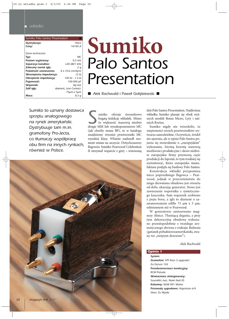 20-22 wkladka gram 3 9/3/09 6:06 PM Page 20 wk∏adka Sumiko Palo Santos Presentation Dystrybucja: Ceny: Voice 10100 z∏ Dane techniczne: Typ: MC Poziom wyjÊciowy: 0,5 mV Separacja kana∏ów: >30 dB/1 kHz Zalecany nacisk ig∏y: 2g PodatnoÊç zawieszenia: 8 x 10-6 cm/dyne Wewn´trzna impedancja: 12 Ω Obcià˝enie impedancjà: 100 Ω – 1 k Ω PojemnoÊç: 100-300 pF Wspornik: lity bor Szlif ig∏y: diament, Line Contact, 75µm x 5µm Masa: 8,3 g Sumiko to uznany dostawca sprz´tu analogowego na rynek amerykaƒski. Dystrybuuje tam m.in. gramofony Pro-Jecta, co t∏umaczy wspó∏prac´ obu firm na innych rynkach, równie˝ w Polsce. Sumiko Palo Santos Presentation ■ƒAlek Rachwald i Pawe∏ Go∏´biewskiƒ■ S umiko oferuje stosunkowo bogatà kolekcj´ wk∏adek. Mimo ˝e wi´kszoÊç stanowià niezbyt drogie MM lub wysokopoziomowe MC (jak choçby znana BP), to w katalogu znajdziemy równie˝ przetworniki MC wysokiej klasy. W∏aÊnie nadszed∏ moment zmian na szczycie. Dotychczasowy flagowiec Sumiko Pearwood Celebration II otrzyma∏ wsparcie z góry – testowanà dziÊ Palo Santos Presentation. Najdro˝sza wk∏adka Sumiko plasuje si´ obok wy˝szych modeli Benza Micro, Lyry i taƒszych Koetsu. Sumiko nigdy nie twierdzi∏o, ˝e wn´trznoÊci swoich przetworników wytwarza samodzielnie. OczywiÊcie, êróde∏ nie ujawnia, ale w opisie Palo Santos pojawia si´ stwierdzenie o „europejskim” wykonaniu. Istotnà kwesti´ stanowià mo˝liwoÊci produkcyjne i skoro niektóre europejskie firmy przenoszà cz´Êç produkcji do Japonii, to tym trudniej si´ zorientowaç, która europejska manufaktura podj´∏a si´ budowy Palo Santos. Konstrukcja wk∏adki przypomina nieco poprzedniego flagowca – Pearwood, jednak w przeciwieƒstwie do niego drewniana obudowa jest otwarta od do∏u, ukazujàc generator. Nowe jest zawieszenie wspornika z syntetycznego kauczuku. Sam wspornik zrobiono z pr´ta boru, a ig∏a to diament o zaawansowanym szlifie 75 µm x 5 µm, odmiennym ni˝ w Pearwood. W generatorze zastosowano magnesy Alnico. T∏umiàcà drgania, a przy tym dekoracyjnà obudow´ wykonano prawdopodobnie z twardego aromatycznego drewna z rodzaju Bulnesia (gatunek po∏udniowoamerykaƒski, zwany te˝ „Êwi´tym drzewem”). Alek Rachwald Opinia 1 System Gramofon: VPI Aries 3 upgrade/ Zu Denon 103 Przedwzmacniacz korekcyjny: RCM Prelude Wzmacniacz zintegrowany: SoundArt Jazz, Naim Nait XS Kolumny: B&W 801 Matrix Przewody sygna∏owe: Argentum 6/4 Silver, Zu Wylde 20 magazyn hi-fi 3/09 20-22 wkladka gram 3 9/3/09 6:06 PM Page 21 wk∏adka Przewody g∏oÊnikowe: Argentum 6/4 Przewody zasilajàce: Zu Mother, IsoTek Optimum Filtr sieciowy: IsoTek Sigmas P odoba mi si´ ergonomia Palo Santos. Pokrojem przypomina Koetsu i ma podobne, równoleg∏e kraw´dzie obudowy. Mimo ˝e ig∏a jest dobrze ukryta pod drewnianà skrzynkà i nie∏atwo nià trafiç w punkt na szablonie, to jednak utrzymanie równoleg∏oÊci kraw´dzi wk∏adki wobec linii szablonu okazuje si´ ∏atwe. Równie˝ si∏a nacisku (2 g) jest typowa dla wspó∏czesnych wk∏adek MC i w po∏àczeniu z masà przetwornika stanowi kombinacj´ przyjaznà wi´kszoÊci ramion i przeciwwag. JeÊli tylko ktoÊ nie dosta∏ trwa∏ego zeza podczas wielokrotnie ponawianych prób umieszczenia koƒca ig∏y w punkcie „zero”, reszta to drobiazg i mo˝na przystàpiç do s∏uchania. Zaczà∏em nietypowo – od wokalu solo z p∏yty „Favorite Voices”. To test zarówno na kobiecy g∏os, jak i akustyczne basisko, w które ten album obfituje. Pod wzgl´dem równowagi mi´dzy wysokimi a niskimi tonami Palo Santos lokuje si´ troch´ poni˝ej wk∏adek Lyry. Pokazuje mniej najsubtelniejszych detali, ale za to mocniejszy bas. Nie jest to z∏y interes, tym bardziej ˝e Sumiko i tak cechuje zwiewny dêwi´k. Jest tu du˝o powietrza, przestrzeni i delikatnych drgnieƒ przekazanych w sposób godny zaawansowanego szlifu ig∏y. Uwag´ zwraca silny i raczej mi´kki bas, naturalna Êrednica i obfite, lecz nieagresywne szczegó∏y. Stereofonia równie˝ pozostaje dobra, tak˝e w pionowym wymiarze sceny. PrzejÊcie do utworów instrumentalnych (g∏ównie symfoniki) potwierdzi∏o wczeÊniejsze spostrze˝enia, zw∏aszcza jeÊli chodzi o jakoÊç i rozdzielczoÊç wysokich tonów. Skrzypce Perlmana oraz inne instrumenty smyczkowe zosta∏y zaprezentowane doprawdy wspaniale – lekko, po∏yskliwie i barwnie. Ârednica brzmia∏a pe∏nie, z wystarczajàcà dozà naturalnego ciep∏a, ale bez zaokràglenia czy przegrzania. Bas pod wzgl´dem mocy, rozciàgni´cia i zró˝nicowania lokuje t´ wk∏adk´ wÊród najlepszych. Nagrania symfoniczne by∏y tymi, po które si´ga∏em z najwi´kszà przyjemnoÊcià i najcz´Êciej. Od koncertów Vivaldiego, przez Beethovena, Haydna, po Mendelssohna, ka˝da p∏yta zosta∏a przekazana wiernie i precyzyjnie, z satysfakcjonujàcym oddaniem tutti, zarówno pod wzgl´dem rozdzielczoÊci, jak i dynamiki. Poszukiwanie niedostatków lub cech charakterystycznych dêwi´ku Palo Santos kontynuowa∏em nast´pnie przy nagraniach operowych („¸askawoÊç Tytusa” Mozarta, „Aida” Verdiego i „Carmen” Bizeta). Niedostatków nie wychwyci∏em. Charakter brzmienia samej wk∏adki zaznacza∏ si´ s∏abo. Mo˝na mówiç o dêwi´ku szczegó∏owym, ale nie rozjaÊnionym; z dobrze rozciàgni´tym basem i ∏agodnà Êrednicà. Wk∏ad- ki nie cechuje bezlitosna, high-endowa detalicznoÊç Lyry (choç nie jest do niej daleko); nie ma te˝ ciep∏a Sheltera – a mimo to nie odczuwa si´ jego dojmujàcego braku. Przeprowadzone na koniec badania p∏ytà testowà wykaza∏y równie˝ zalety czysto mechaniczne: dobre trzymanie si´ rowka i odpornoÊç na rezonanse. Flagowa Sumiko to przetwornik o neutralnym, dojrza∏ym i smacznym dêwi´ku. Z pewnoÊcià jest zdolna ukazaç zalety najlepszych nap´dów analogowych. Ch´tnie widzia∏bym jà w moim systemie. Alek Rachwald Opinia 2 System Gramofony: Garrard 