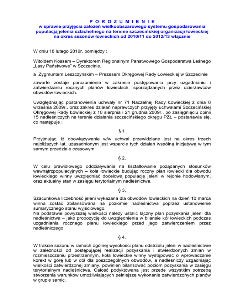 P O R O Z U M I E N I E w sprawie przyjęcia założeń wielkoobszarowego systemu gospodarowania populacją jelenia szlachetnego na terenie szczecińskiej organizacji łowieckiej na okres sezonów łowieckich od 2010/11 do 2012/13 włącznie W dniu 18 lutego 2010r. pomiędzy : Witoldem Kossem – Dyrektorem Regionalnym Państwowego Gospodarstwa Leśnego „Lasy Państwowe” w Szczecinie, a Zygmuntem Leszczyńskim – Prezesem Okręgowej Rady Łowieckiej w Szczecinie zawarte zostaje porozumienie w zakresie postępowania przy uzgadnianiu i zatwierdzaniu rocznych planów łowieckich, sporządzanych przez dzierżawców obwodów łowieckich. Uwzględniając postanowienia uchwały nr 71 Naczelnej Rady Łowieckiej z dnia 8 września 2009r., oraz zakres działań naprawczych przyjęty uchwałami Szczecińskiej Okręgowej Rady Łowieckiej z 10 sierpnia i 21 grudnia 2009r., po zasięgnięciu opinii 15 nadleśniczych na terenie działania szczecińskiego okręgu PZŁ – postanawia się, co następuje : § 1. Przyjmując, iż obowiązywanie w/w uchwał przewidziane jest na okres trzech najbliższych lat, uzasadnionym jest wsparcie tych działań wspólną inicjatywą w tym samym przedziale czasowym. § 2. W celu prawidłowego oddziaływania na kształtowanie pożądanych stosunków wewnątrzpopulacyjnych – koła łowieckie budując roczny plan łowiecki dla obwodu łowieckiego winny uwzględniać docelową populację jeleni w rejonie hodowlanym, oraz aktualny stan w zasięgu terytorialnym nadleśnictwa. § 3. Szacunkowa liczebność jeleni wykazana dla obwodów łowieckich na dzień 10 marca winna zostać zbilansowana na poziomie nadleśnictwa poprzez ustanowienie sumarycznego stanu wyjściowego. Na podstawie powyższej wielkości należy ustalić łączny plan pozyskania jeleni dla nadleśnictwa – jako propozycję do uwzględnienia w bilansie kół łowieckich podczas uzgadniania rocznego planu łowieckiego przed jego zatwierdzeniem przez nadleśniczego. § 4. W trakcie sezonu w ramach ogólnej wysokości planu odstrzału jeleni w nadleśnictwie w zależności od postępującej realizacji pozyskania i stwierdzonych zmian w rozmieszczeniu przestrzennym, koła łowieckie winny występować o wprowadzanie korekt w górę lub w dół dla poszczególnych obwodów, a nadleśniczy uzgadniając wielkości zatwierdzonej zmiany, powinien bilansować poziom pozyskania w zasięgu terytorialnym nadleśnictwa. Całość podyktowana jest przede wszystkim potrzebą stworzenia warunków umożliwiających pełniejsze wykonanie zatwierdzonych planów w grupie samic. -2- § 5. Jako priorytetowe dla określania odstrzału jeleni byków, tak dla nadleśnictw jak i wchodzących w ich skład obwodów łowieckich, wprowadza się rozliczenie ze strukturalnego wykonania planu za poprzedni sezon łowiecki. Przekroczenie pozyskania I klasy wieku jeleni byków winno skutkować pomniejszeniem wysokości planu odstrzału w roku następnym i być uwzględnione w projekcie rocznego planu łowieckiego, przedstawionego przez koło łowieckie. Odstąpienie od tej zasady może być podstawą do odmowy zatwierdzenia planu w tej części przez nadleśniczego. W krótkim czasie zasada ta stworzy system samoczynnej regulacji dla prowadzonych odstrzałów - proporcjonalnie do potencjalnych możliwości łowisk. Natomiast jako faktyczny mechanizm oddziaływania na rozmiar populacji jeleni należy traktować dostosowanie wielkości odstrzału łań, odpowiednio do stwierdzonych stanów liczebności. § 6. Przy realizacji uchwały nr 71 NRŁ - w części dot. redukcji odstrzału byków o co najmniej 30 % w porównaniu do średniorocznego wykonania za trzy ostatnie lata, z uwagi na fakt, że na tut. terenie proces pomniejszania tych planów jest już zaawansowany i trwa już kilka lat, w oparciu o sporządzone przez Zarząd Okręgowy PZŁ wieloletnie analizy, jako bazę dla ustalenia planu odstrzału byków przyjmuje się wskaźnikowo 834 sztuki. § 7. Czynność wstępnego zestawienia planu odstrzału byków, w oparciu o uzyskane wyniki oceny trofeów, powierza się wspólnie Komisji Hodowlanej SORŁ i Zarządowi Okręgowemu PZŁ. Tak przedstawione propozycje podlegają pierwotnie wzajemnym uzgodnieniom na szczeblu rejonów hodowlanych i ostatecznej akceptacji właściwych nadleśniczych. Dalsze bilansowanie odbywa się w obrębie nadleśnictw. Negocjacje te przewiduje się w terminie od 1 do 20 marca każdego roku. § 8. Ogólne wskaźniki budowy planów odstrzału jeleni winny być stosowane w układzie : - do 30 % byków, minimum 60 % łań i do 10 % cieląt, - byki w klasach wieku : I – do 25 %, II – 60-70 %, III – minimum 15 %. Na bieżąco należy badać skutki podjętych działań celem dalszych ewentualnych korekt dla osiągnięcia właściwych parametrów populacyjnych. Prezes ORŁ w Szczecinie Dyrektor RDLP Szczecin Zygmunt Leszczyński Witold Koss