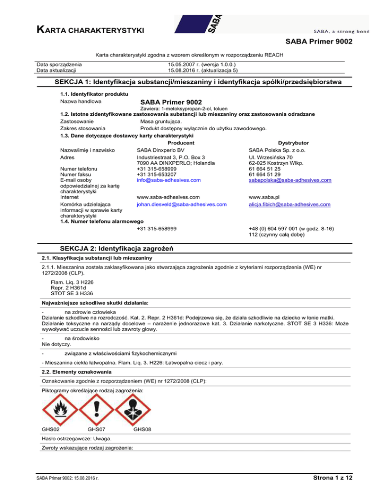 KARTA CHARAKTERYSTYKI SABA Primer 9002 Karta charakterystyki zgodna z wzorem określonym w rozporządzeniu REACH Data sporządzenia Data aktualizacji 15.05.2007 r. (wersja 1.0.0.) 15.08.2016 r. (aktualizacja 5) SEKCJA 1: Identyfikacja substancji/mieszaniny i identyfikacja spółki/przedsiębiorstwa 1.1. Identyfikator produktu Nazwa handlowa SABA Primer 9002 Zawiera: 1-metoksypropan-2-ol, toluen 1.2. Istotne zidentyfikowane zastosowania substancji lub mieszaniny oraz zastosowania odradzane Zastosowanie Masa gruntująca. Zakres stosowania Produkt dostępny wyłącznie do użytku zawodowego. 1.3. Dane dotyczące dostawcy karty charakterystyki Producent Dystrybutor Nazwa/imię i nazwisko SABA Dinxperlo BV SABA Polska Sp. z o.o. Adres Industriestraat 3, P.O. Box 3 Ul. Wrzesińska 70 7090 AA DINXPERLO; Holandia 62-025 Kostrzyn Wlkp. Numer telefonu +31 315-658999 61 664 51 25 Numer faksu +31 315-653207 61 664 51 29 E-mail osoby [email protected] [email protected] odpowiedzialnej za kartę charakterystyki Internet www.saba-adhesives.com www.saba.pl Komórka udzielająca [email protected] [email protected] informacji w sprawie karty charakterystyki 1.4. Numer telefonu alarmowego +31 315-658999 +48 (0) 604 597 001 (w godz. 8-16) 112 (czynny całą dobę) SEKCJA 2: Identyfikacja zagrożeń 2.1. Klasyfikacja substancji lub mieszaniny 2.1.1. Mieszanina została zaklasyfikowana jako stwarzająca zagrożenia zgodnie z kryteriami rozporządzenia (WE) nr 1272/2008 (CLP). Flam. Liq. 3 H226 Repr. 2 H361d STOT SE 3 H336 Najważniejsze szkodliwe skutki działania: na zdrowie człowieka Działanie szkodliwe na rozrodczość. Kat. 2. Repr. 2 H361d: Podejrzewa się, że działa szkodliwie na dziecko w łonie matki. Działanie toksyczne na narządy docelowe – narażenie jednorazowe kat. 3. Działanie narkotyczne. STOT SE 3 H336: Może wywoływać uczucie senności lub zawroty głowy. na środowisko Nie dotyczy. - związane z właściwościami fizykochemicznymi - Mieszanina ciekła łatwopalna. Flam. Liq. 3. H226: Łatwopalna ciecz i pary. 2.2. Elementy oznakowania Oznakowanie zgodnie z rozporządzeniem (WE) nr 1272/2008 (CLP): Piktogramy określające rodzaj zagrożenia: GHS02 GHS07 GHS08 Hasło ostrzegawcze: Uwaga. Zwroty wskazujące rodzaj zagrożenia: SABA Primer 9002: 15.08.2016 r. Strona 1 z 12 KARTA CHARAKTERYSTYKI SABA Primer 9002 SEKCJA 2: Identyfikacja zagrożeń H226: Łatwopalna ciecz i pary. H361d: Podejrzewa się, że działa szkodliwie na dziecko w łonie matki. H336: Może wywoływać uczucie senności lub zawroty głowy. Zwroty wskazujące środki ostrożności: P210: Przechowywać z dala od źródeł ciepła, gorących powierzchni, iskrzenia, otwartego ognia i innych źródeł zapłonu. Palenie wzbronione, P263: Unikać kontaktu w czasie ciąży/karmienia piersią. P281: Stosować wymagane środki ochrony indywidualnej. P370+P378: W przypadku pożaru: Użyć CO2, proszek gaśniczy lub strumień wody do gaszenia. P403 + P235: Przechowywać w dobrze wentylowanym miejscu. Przechowywać w chłodnym miejscu. P501: Zawartość/pojemnik usuwać na składowiska odpadów niebezpiecznych, zgodnie z przepisami miejscowymi/regionalnymi/narodowymi/międzynarodowymi. Informacje uzupełniające o zagrożeniach: Nie dotyczy. Etykieta powinna zawierać identyfikator produktu, o którym mowa w art. 18 rozp. CLP oraz nazwę, adres i telefon dostawcy danej mieszaniny. Dane identyfikujące wszystkie substancje w mieszaninie , które decydują o jej zaklasyfikowaniu zgodnie z Art. 18 pkt. 3b. Zawiera: 1-metoksypropan-2-ol, toluen 2.3. Inne zagrożenia 2.3.1 Ocena PBT lub vPvB zgodnie z zał. XIII REACH – substancje zawarte w mieszaninie nie zostały zakwalifikowane jako PBT lub vPvB. Kryteria PBT i vPvB zawarte są w Aneksie XIII REACH. 2.3.2. Informacje dotyczące innych zagrożeń, które nie powodują zaklasyfikowania, a które mogą przyczynić się do ogólnych zagrożeń powodowanych przez mieszaninę. Nie dotyczy. SEKCJA 3: Skład/informacja o składnikach 3.1. Substancje Nie dotyczy. 3.2. Mieszaniny Spis substancji w mieszaninie: a) Substancje stanowiące zagrożenie dla zdrowia lub środowiska: 1-Metoksypropan-2-ol: Zawartość: Nr CAS: Nr WE: Nr rejestracji: Klasyfikacja substancji zgodnie z rozporządzeniem (WE) nr 1272/2008 77,26% 107-98-2 203-539-1 01-2119457435-35-xxxx Flam. Liq. 3 H226 STOT SE 3 H336 Toluen: Zawartość: Nr CAS: Nr WE: Nr rejestracji: Klasyfikacja substancji zgodnie z rozporządzeniem (WE) nr 1272/2008 Bis[[2,2’,2”-nitrylotris[etanolanto]](1-)-N,O]bis(propan-2-olato) tytanium: Zawartość: Nr CAS: Nr WE: Nr rejestracji: Klasyfikacja substancji zgodnie z rozporządzeniem (WE) nr 1272/2008 8,73% 108-88-3 203-625-9 01-2119471310-51-xxxx Flam. Liq. 2 H225 Repr. 2 H361d STOT RE 2 H373 Asp. Tox. 1 H304 Skin Irrit. 2 H315 STOT SE 3 H336 1,23% 36673-16-2 253-153-2 Nie podano Flam. Liq. 2 H225 b) Substancje, dla których istnieją wspólnotowe najwyższe dopuszczalne stężenia w środowisku pracy, które nie SABA Primer 9002: 15.08.2016 r. Strona 2 z 12 KARTA CHARAKTERYSTYKI SABA Primer 9002 SEKCJA 3: Skład/informacja o składnikach zostały zawarte w lit. a): Wszystkie substancje dla których istnieją wspólnotowe najwyższe dopuszczalne stężenia w środowisku pracy wymieniono w lit. a) c) substancje trwałe, wykazujące zdolność do bioakumulacji i toksyczne lub bardzo trwałe i wykazujące bardzo dużą zdolność do bioakumulacji zgodnie z kryteriami zawartymi w załączniku XIII lub substancje zawarte w wykazie sporządzonym zgodnie z art. 59 ust. 1 z powodów innych niż zagrożenia, o których mowa w lit. a): W mieszaninie nie występują ww. substancje. Objaśnienia stosowanych skrótów podano w sekcji 16. SEKCJA 4: Środki pierwszej pomocy 4.1. Opis środków pierwszej pomocy Narażenie przez drogi oddechowe Wyprowadzić lub wynieść poszkodowanego z zatrutej atmosfery na świeże powietrze. W przypadku utrzymujących się dolegliwości wezwać lekarza. W przypadku zatr