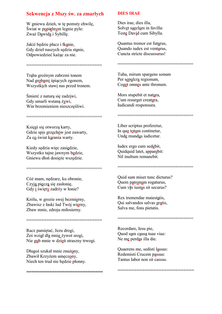Sekwencja z Mszy św. za zmarłych DIES IRAE W gniewu dzień, w tę pomsty chwilę, Świat w popielnym legnie pyle: Zważ Dawida i Sybillę. Dies irae, dies illa, Solvet saeclum in favilla: Teste David cum Sibylla. Jakiż będzie płacz i łkanie, Gdy dzieł naszych sędzia stanie, Odpowiedzieć każąc za nie. Quantus tremor est futurus, Quando iudex est venturus, Cuncta stricte discussurus! ============================== ============================== Trąba groźnym zabrzmi tonem Nad grobami śpiących zgonem, Wszystkich stawi nas przed tronem. Tuba, mirum spargens sonum Per sepulcra regionum, Coget omnes ante thronum. Śmierć z naturą się zadziwi, Gdy umarli wstaną żywi, Win brzemieniem nieszczęśliwi. Mors stupebit et natura, Cum resurget creatura, Iudicandi responsura. ============================== ============================== Księgi się otworzą karty, Gdzie spis grzechów jest zawarty, Za co świat karania warty. Liber scriptus proferetur, In quo totum continetur, Unde mundus iudicetur. Kiedy sędzia więc zasiędzie, Wszystko tajne jawnym będzie, Gniewu dłoń dosięże wszędzie. Iudex ergo cum sedebit, Quidquid latet, apparebit: Nil inultum remanebit. ============================== ============================== Cóż mam, nędzarz, ku obronie, Czyją pieczą się zasłonię, Gdy i święty zadrży w łonie? Quid sum miser tunc dicturus? Quem patronum rogaturus, Cum vix iustus sit securus? Królu, w grozie swej bezmierny, Zbawisz z łaski lud Twój wierny, Zbaw mnie, zdroju miłosierny. Rex tremendae maiestatis, Qui salvandos salvas gratis, Salva me, fons pietatis. ============================== ============================== Racz pamiętać, Jezu drogi, Żeś wziął dla mnie żywot srogi, Nie gub mnie w dzień straszny trwogi. Recordare, Iesu pie, Quod sum causa tuae viae: Ne me perdas illa die. Długoś szukał mnie znużony, Zbawił Krzyżem umęczony, Niech ten trud nie będzie płonny. Quaerens me, sedisti lassus: Redemisti Crucem passus: Tantus labor non sit cassus. ============================== ============================ Sędzio pomsty sprawiedliwy, Bądź mym grzechom litościwy, Zanim przyjdzie sąd straszliwy. Iuste iudex ultionis, Donum fac remissionis Ante diem rationis. Jęczę pomnąc grzechów morze, Wstydem me oblicze gorze, Żebrzącemu przebacz, Boże. Ingemisco, tamquam reus: Culpa rubet vultus meus: Supplicanti parce, Deus. ============================== ============================== Ty, co Marii grzech zmazałeś, Łotra modłów wysłuchałeś, I mnie też nadzieję dałeś. Qui Mariam absolvisti, Et latronem exaudisti, Mihi quoque spem dedisti. Choć niegodne me błaganie, Nie daj mi, dobroci Panie, W ognia wieczne wpaść otchłanie. Preces meae non sunt dignae: Sed tu bonus fac benigne, Ne perenni cremer igne. ============================== ============================== Między owce Twe wliczony I od kozłów odłączony, Daj, niech z prawej stanę strony. Inter oves locum praesta, Et ab haedis me sequestra, Statuens in parte dextra. Gdy odtrącisz potępionych, Srogim żarom przeznaczonych, Weź mnie do błogosławionych. Confutatis maledictis, Flammis acribus addictis: Voca me cum benedictis. ============================== ============================== Błagam z czołem pochylonym, Z sercem z żalu w proch skruszonym, Pieczę miej nad moim zgonem. Oro supplex et acclinis, Cor contritum quasi cinis:, Gere curam mei finis. O dniu jęku, o dniu szlochu, Kiedy z popielnego prochu Człowiek winny na sąd stanie. Lacrimosa dies illa, Qua resurget ex favilla Iudicandus homo reus: Dobry Jezu, a nasz Panie, Daj im wieczne spoczywanie. Amen. Huic ergo parce, Deus. Pie Iesu Domine, Dona eis requiem. Amen.
