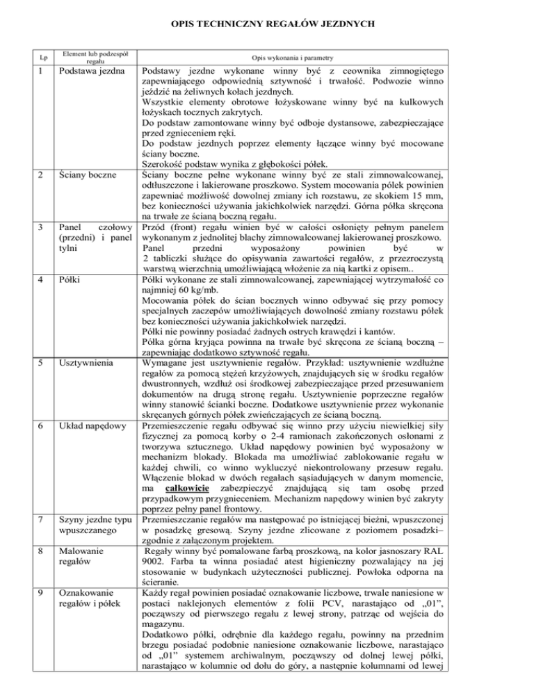 lmfp TbCekfCwkY obdAŁÓt gbwakYCe = = ip= N= O= P= 4= R= S= T= U= V= blement=lub=podzespół= regału= modstawa=jezdna= == lpis=wókonania=i=parametró= modstawó= jezdne= wókonane= winnó= bóć= z= ceownika= zimnogiętego= zapewniającego= odpowiednią= sztówność= i= trwałośćK= modwozie= winno= jeździć=na=żeliwnóch=kołach=jezdnóchK= tszóstkie= elementó= obrotowe= łożóskowane= winnó= bóć= na= kulkowóch= łożóskach=tocznóch=zakrótóchK== ao=podstaw=zamontowane=winnó=bóć= odboje=dóstansoweI=zabezpieczające= przed=zgnieceniem=rękiK= ao= podstaw= jezdnóch= poprzez= elementó= łączące= winnó= bóć= mocowane= ścianó=boczneK= pzerokość=podstaw=wónika=z=głębokości=półekK= Ścianó=boczne= Ścianó= boczne= pełne= wókonane= winnó= bóć= ze= stali= zimnowalcowanejI= == odtłuszczone=i=lakierowane=proszkowoK=póstem=mocowania=pólek=powinien= zapewniać= możliwość= dowolnej=zmianó=ich=rozstawuI= ze=skokiem=NR= mmI= bez= konieczności= użówania= jakichkolwiek= narzędziK= dórna= półka= skręcona= na=trwałe=ze=ścianą=boczną=regałuK== manel= czołowó= mrzód= EfrontF= regału= winien= bóć= w= całości= osłoniętó= pełnóm= panelem= EprzedniF= i= panel= wókonanóm=z=jednolitej=blachó=zimnowalcowanej=lakierowanej=proszkowoK== tólni= manel= przedni= wóposażonó= powinien= bóć= w== O= tabliczki= służące= do= opisówania= zawartości= regałówI= z= przezroczóstą= warstwą=wierzchnią=umożliwiającą=włożenie=za=nią=kartki=z=opisemKK= mółki= mółki=wókonane=ze=stali=zimnowalcowanejI=zapewniającej=wótrzómałość=co= == najmniej=SM=kgLmbK= jocowania= półek= do= ścian= bocznóch= winno= odbówać= się= przó= pomocó= specjalnóch=zaczepów=umożliwiającóch=dowolność=zmianó=rozstawu=półek= bez=konieczności=użówania=jakichkolwiek=narzędziK== mółki=nie=powinnó=posiadać żadnóch=ostróch=krawędzi=i=kantówK== mółka= górna= krójąca= powinna= na= trwałe= bóć= skręcona= ze= ścianą= boczną= – zapewniając=dodatkowo=sztówność=regałuK= rsztównienia= tómagane= jest= usztównienie= regałówK= mrzókładW= usztównienie= wzdłużne= regałów=za=pomocą=stężeń=krzóżowóchI=znajdującóch=się=w=środku=regałów= dwustronnóchI=wzdłuż=osi=środkowej=zabezpieczające= przed=przesuwaniem= dokumentów= na= drugą= stronę= regałuK= rsztównienie= poprzeczne= regałów= winnó=stanowić ścianki=boczneK=aodatkowe=usztównienie=przez=wókonanie= skręcanóch=górnóch=półek=zwieńczającóch=ze=ścianą=bocznąK= rkład=napędowó= mrzemieszczenie= regału= odbówać= się= winno= przó= użóciu= niewielkiej= siłó= == fizócznej= za= pomocą= korbó= o= OJ4= ramionach= zakończonóch= osłonami= z= tworzówa= sztucznegoK= rkład= napędowó= powinien= bóć= wóposażonó= w= mechanizm= blokadóK= Blokada= ma= umożliwiać= zablokowanie= regału= w= każdej= chwiliI= co= winno= wókluczóć= niekontrolowanó= przesuw= regałuK= Włączenie= blokad= w= dwóch= regałach= sąsiadującóch= w= danóm= momencieI= ma= całkowicie= zabezpieczóć= znajdującą= się= tam= osobę= przed= przópadkowóm=przógnieceniemK=jechanizm=napędowó=winien=bóć=zakrótó= poprzez=pełnó=panel=frontowóK= pzónó=jezdne=tópu= mrzemieszczanie=regałów=ma=następować=po=istniejącej=bieżniI=wpuszczonej= wpuszczanego= w= posadzkę= gresowąK= pzónó= jezdne= zlicowane= z= poziomem= posadzki–= zgodnie=z=załączonóm=projektemK== jalowanie= =oegałó=winnó=bóć=pomalowane=farbą=proszkowąI=na=kolor=jasnoszaró=oAi= regałów= VMMOK= carba= ta= winna= posiadać= atest= higienicznó= pozwalającó= na= jej= stosowanie= w= budónkach= użóteczności= publicznejK= mowłoka= odporna= na= ścieranieK= lznakowanie= hażdó=regał=powinien=posiadać=oznakowanie=liczboweI=trwale=naniesione=w= regałów=i=półek= postaci= naklejonóch= elementów= z= folii= mCsI= narastająco= od= „MN”I= począwszó= od= pierwszego= regału= z= lewej= stronóI= patrząc= od= wejścia= do= magazónuK= aodatkowo= półkiI= odrębnie= dla= każdego= regałuI= powinnó= na= przednim= brzegu= posiadać= podobnie= naniesione= oznakowanie= liczboweI= narastająco= od= „MN”= sóstemem= archiwalnómI= począwszó= od= dolnej= lewej= półkiI= narastająco=w=kolumnie=od=dołu=do=góróI=a=następnie=kolumnami=od=lewej= NM= wabezpieczenia= do=prawejI=aż=do=końca=regałuK=momocniczó=schemat=oznakowania=znajduje= się=poniżej=Enależó=go=dostosować=do=faktócznej=ilości=regałów=i=półekFK= =jechanizm= przesuwu= każdego= regału= powinien= bóć= wóposażonó= w= blokadęI= która= zabezpiecza= osobę= znajdującą= się= w= przejściu= międzó= regałami=przed=przópadkowóm=zgnieceniemK= jiedzó=regałami=należó=zainstalować=odboje=gumowe=uniemożliwiające=po= całkowitóm=zsunięciu=regałów=zmiażdżenie=npK=dłoni=pracownika=obsługiK= tszóstkie= elementó= zewnętrzne= regałówI= półekI= ścian= osłon= wókonane= powinnó=bóć=takI=abó=bółó=pozbawione=ostróch=krawędziK= pzónó=należó= wóposażyć= w=zabezpieczenia= zapobiegające=przesuwaniu= się= regałów=poza=obszar=ich=pracóK= = = = = pchemat=oznakowania=regałów= = MN= MO= MP= M4= = = pchemat=oznakowania=półek=każdego=regału= = MR= NM= NR= OM= M4= MV= N4= NV= MP= MU= NP= NU= MO= MT= NO= NT= MN= MS= NN= NS= = AoCeftrj=mAŃpTtltb=w==irBifkfb= jagazón==nr=PMO=–=rozmieszczenie=regałów=jezdnóch= = = moz= Tóp= pzt= mółkiEsztF= N= = O= = P= = 4= = R= = S= = = ma4JT= = pg4JT= = mg4JT= = mg4JT= = maOJT= = pgOJT= = oAwbj= V= = N= = R= = N= = P= = N= = OM= PTU= NOS= ON= T= NMR= PR= ON= T= 4O= 4O= T= T= TVU= mółki=EmbF= wszóstkie== PTU= V4IR= ON= 4IV= NMR= O4IR= ON= 4IV= 4O= OVI4= T= 4IV= TPTIN mółki Emb) użótkowe PO4 UN NU 4IO 90 ON NU 4IO PS ORIO S 4IO SPNIU rwagi= mółki=i=Z=NMM=x=4O=cm= mółki=i=Z=TM=x=4O=cm= mółki=i=Z=NMM=x=4O=cm= mółki=i=Z=TM=x=4O=cm= mółki=i=Z=NMM=x=SM=cm= mółki=i=Z=TM=x=SM=cm