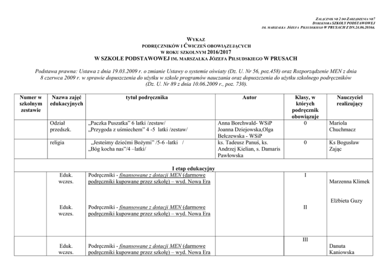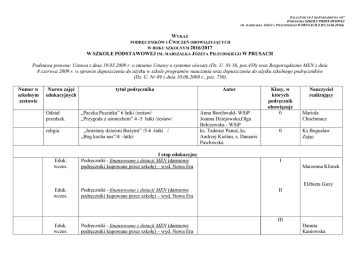 ZAŁĄCZNIK NR 2 DO ZARZĄDZENIA NR7 DYREKTORA SZKOŁY PODSTAWOWEJ IM. MARSZAŁKA JÓZEFA PIŁSUDSKIEGO W PRUSACH Z DN.24.06.2016R. WYKAZ PODRĘCZNIKÓW I ĆWICZEŃ OBOWIĄZUJĄCYCH W ROKU SZKOLNYM 2016/2017 W SZKOLE PODSTAWOWEJ IM. MARSZAŁKA JÓZEFA PIŁSUDSKIEGO W PRUSACH Podstawa prawna: Ustawa z dnia 19.03.2009 r. o zmianie Ustawy o systemie oświaty (Dz. U. Nr 56, poz.458) oraz Rozporządzenie MEN z dnia 8 czerwca 2009 r. w sprawie dopuszczenia do użytku w szkole programów nauczania oraz dopuszczenia do użytku szkolnego podręczników (Dz. U. Nr 89 z dnia 10.06.2009 r., poz. 730). Numer w szkolnym zestawie Nazwa zajęć edukacyjnych tytuł podręcznika Odział przedszk. „Paczka Puszatka” 6 latki /zestaw/ „Przygoda z uśmiechem” 4 -5 latki /zestaw/ religia „Jesteśmy dziećmi Bożymi” /5-6 -latki / „Bóg kocha nas”/4 –latki/ Eduk. wczes. Eduk. wczes. Eduk. wczes. I etap edukacyjny Podręczniki - finansowane z dotacji MEN (darmowe podręczniki kupowane przez szkołę) – wyd. Nowa Era Podręczniki - finansowane z dotacji MEN (darmowe podręczniki kupowane przez szkołę) – wyd. Nowa Era Podręczniki - finansowane z dotacji MEN (darmowe podręczniki kupowane przez szkołę) – wyd. Nowa Era Autor Anna Borchwald- WSiP Joanna Dziejowska,Olga Bełczewska - WSiP ks. Tadeusz Panuś, ks. Andrzej Kielian, s. Damaris Pawłowska Klasy, w których podręcznik obowiązuje 0 0 I II III Nauczyciel realizujący Mariola Chuchmacz Ks Bogusław Zając Marzenna Klimek Elżbieta Guzy Danuta Kaniowska j. angielski Podręczniki - finansowane z dotacji MEN (darmowe podręczniki kupowane przez szkołę) j. angielski Podręczniki - finansowane z dotacji MEN (darmowe podręczniki kupowane przez szkołę) j. angielski „Jesteśmy w rodzinie Pana Jezusa” religia „Kochamy Pana Jezusa” „Przyjmujemy Pana Jezusa” Zdzisława Cygan Zdzisława Cygan II Podręczniki - finansowane z dotacji MEN (darmowe podręczniki kupowane przez szkołę) religia religia I III ks. Tadeusz Panuś, ks. Andrzej Kielian, s. Damaris Pawłowska: ks. Tadeusz Panuś, ks. Andrzej Kielian, Damaris Pawłowska s. ks. Tadeusz Panuś, ks. Andrzej Kielian, Adam Berski I II III Zdzisława Cygan Ks Bogusław Zając Ks Bogusław Zając Ks Bogusław Zając język angielski język angielski język angielski język polski język polski język polski II etap edukacyjny Podręczniki - finansowane z dotacji MEN (darmowe podręczniki kupowane przez szkołę) „Today” cz. 1 - podręcznik i zeszyt ćwiczeń T. Thompson, D.Todd Podręczniki - finansowane z dotacji MEN (darmowe podręczniki kupowane przez szkołę) „Today” cz. 2 - podręcznik i zeszyt ćwiczeń Podręcznik dla szkoły podstawowej New Maxi Taxi 3 Wydawnictwo Szkolne PWN Zeszyt ćwiczeń- New Maxi Taxi kl.VI Podręczniki - finansowane z dotacji MEN (darmowe podręczniki kupowane przez szkołę) „Jutro pójdę w świat. „ Podręcznik do kształcenia literackiego, kulturowego i językowego dla szkoły podstawowej. „Jutro pójdę w świat. Zeszyt ćwiczeń ” Podręczniki - finansowane z dotacji MEN (darmowe podręczniki kupowane przez szkołę) „Jutro pójdę w świat”. Podręcznik do kształcenia literackiego, kulturowego i językowego dla szkoły podstawowej „Jutro pójdę w świat. Zeszyt ćwiczeń ” T. Thompson, D.Todd Agnieszka Otwinowska Kasztelanic, Anna Walewska IV Zdzisława Cygan V Zdzisława Cygan VI Zdzisława Cygan IV Beata Walczak V Beata Walczak Hanna Dobrowolska Urszula Dobrowolska Hanna Dobrowolska Urszula Dobrowolska „Czarowanie słowem” .Podręcznik do kształcenia literackiego, kulturowego i językowego. Klasa 6 „Czarowanie słowem” Zeszyt ćwiczeń do języka polskiego dla szkoły podstawowej . Klasa 6 Część 1 i 2 Do nowej podstawy programowej. WSiP historia historia historia Podręczniki - finansowane z dotacji MEN (darmowe podręczniki kupowane przez szkołę) „My i historia”. Historia i społeczeństwo. Podręcznik. Klasa 4 Szkoła podstawowa. My i historia”. Historia i społeczeństwo. Zeszyt ćwiczeń. Klasa 4. Szkoła podstawowa. Podręczniki - finansowane z dotacji MEN (darmowe podręczniki kupowane przez szkołę) „My i historia”. Historia i społeczeństwo. Podręcznik. Klasa 5 Szkoła podstawowa. „My i historia”. Historia i społeczeństwo. Zeszyt ćwiczeń. Klasa 5. Szkoła podstawowa. Agnieszka Kania, Karolina Kwak, Joanna Majchrzak Broda VI Beata Walczak Bogumiła Olszewska, Wiesława Surdyk- Fertsch IV Beata Walczak Bogumiła Olszewska, Wiesława Surdyk- Fertsch V Beata Walczak VI Beata Walczak IV Marzenna Klimek Bogumiła Olszewska, Wiesława Surdyk- Fertsch „My i historia”. Historia i społeczeństwo. Podręcznik. Klasa 6. Szkoła podstawowa. „My i historia”. Historia i społeczeństwo. Zeszyt ćwiczeń. Klasa 6. Szkoła podstawowa. Do nowej podstawy programowej muzyka muzyka Podręczniki - finansowane z dotacji MEN (darmowe podręczniki kupowane przez szkołę) „Ciekawi świata 4” . Podręcznik dla klasy IV szkoły podstawowej. wyd. Operon Podręczniki - finansowane z dotacji MEN (darmowe podręczniki kupowane przez szkołę) „ Ciekawi świata 5”. Podręcznik dla klasy V szkoły podstawowej. wyd. Operon Justyna Górska- Guzik Justyna Górska- Guzik V Marzenna Klimek muzyka „ Ciekawi świata 6”. Podręcznik dla klasy VI szkoły podstawowej. wyd. Operon Justyna Górska- Guzik Marzenna Klimek VI „ Ciekawi świata 6”. Zeszyt ćwiczeń matematyka Podręczniki - finansowane z dotacji MEN (darmowe podręczniki kupowane przez szkołę) Matematyka 2001 podręcznik ,zeszyt ćw.1 i 2 Anna Bazyluk, Jerzy Chodnicki IV Agata Żurawska matematyka Podręczniki - finansowane z dotacji MEN (darmowe podręczniki kupowane przez szkołę) Matematyka 2001 podręcznik ,zeszyt ćw.1 i 2 Anna Bazyluk, Jerzy Chodnicki V Agata Żurawska matematyka Matematyka 2001- podręcznik ,zeszyt ćw.1 i 2 Anna Bazyluk, Jerzy Chodnicki VI Agata Żurawska IV Krystyna Tworzydło przyroda przyroda pr