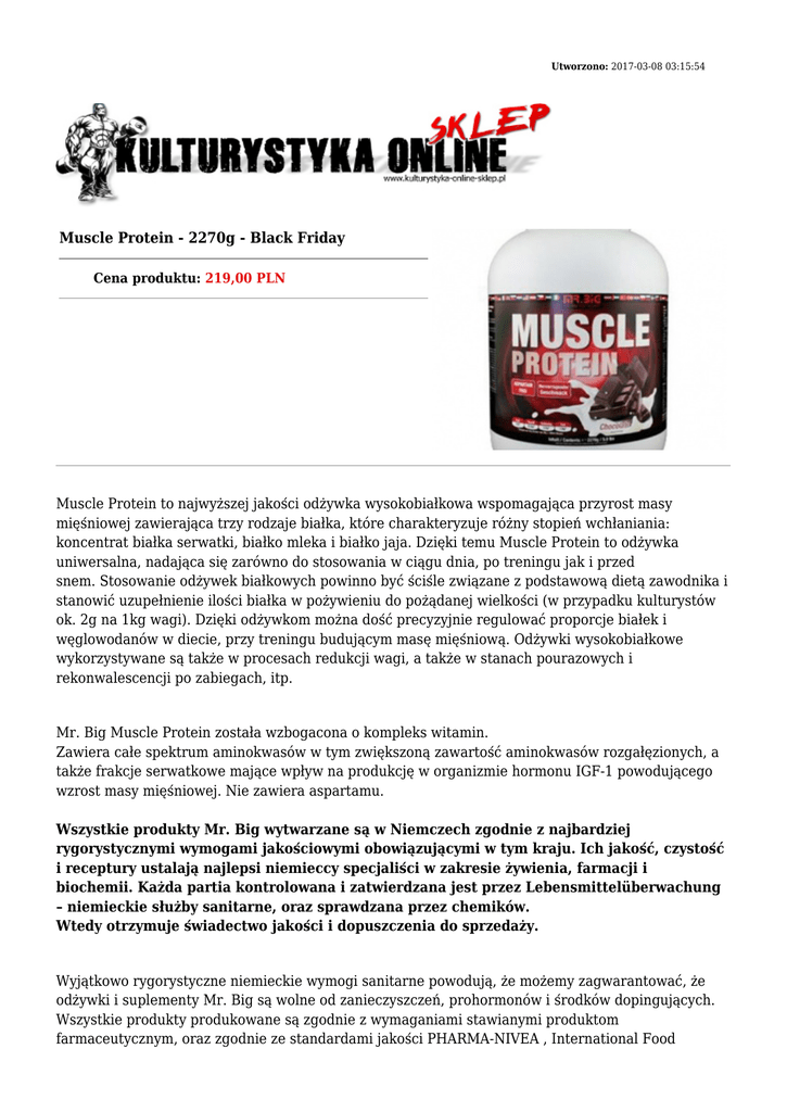 Utworzono: 2017-03-08 03:15:54 Muscle Protein - 2270g - Black Friday Cena produktu: 219,00 PLN Muscle Protein to najwyższej jakości odżywka wysokobiałkowa wspomagająca przyrost masy mięśniowej zawierająca trzy rodzaje białka, które charakteryzuje różny stopień wchłaniania: koncentrat białka serwatki, białko mleka i białko jaja. Dzięki temu Muscle Protein to odżywka uniwersalna, nadająca się zarówno do stosowania w ciągu dnia, po treningu jak i przed snem. Stosowanie odżywek białkowych powinno być ściśle związane z podstawową dietą zawodnika i stanowić uzupełnienie ilości białka w pożywieniu do pożądanej wielkości (w przypadku kulturystów ok. 2g na 1kg wagi). Dzięki odżywkom można dość precyzyjnie regulować proporcje białek i węglowodanów w diecie, przy treningu budującym masę mięśniową. Odżywki wysokobiałkowe wykorzystywane są także w procesach redukcji wagi, a także w stanach pourazowych i rekonwalescencji po zabiegach, itp. Mr. Big Muscle Protein została wzbogacona o kompleks witamin. Zawiera całe spektrum aminokwasów w tym zwiększoną zawartość aminokwasów rozgałęzionych, a także frakcje serwatkowe mające wpływ na produkcję w organizmie hormonu IGF-1 powodującego wzrost masy mięśniowej. Nie zawiera aspartamu. Wszystkie produkty Mr. Big wytwarzane są w Niemczech zgodnie z najbardziej rygorystycznymi wymogami jakościowymi obowiązującymi w tym kraju. Ich jakość, czystość i receptury ustalają najlepsi niemieccy specjaliści w zakresie żywienia, farmacji i biochemii. Każda partia kontrolowana i zatwierdzana jest przez Lebensmittelüberwachung – niemieckie służby sanitarne, oraz sprawdzana przez chemików. Wtedy otrzymuje świadectwo jakości i dopuszczenia do sprzedaży. Wyjątkowo rygorystyczne niemieckie wymogi sanitarne powodują, że możemy zagwarantować, że odżywki i suplementy Mr. Big są wolne od zanieczyszczeń, prohormonów i środków dopingujących. Wszystkie produkty produkowane są zgodnie z wymaganiami stawianymi produktom farmaceutycznym, oraz zgodnie ze standardami jakości PHARMA-NIVEA , International Food Standard (IFS), ISO 9001 : 2000, HACCP : Hazzard Analysis Critical Control Point System, GMP DAWKOWANIE : 2-3x dziennie 30g (ok. 3 łyżki stołowe) zmieszać w 200-250 ml wody lub mleka. Pić pomiędzy posiłkami lub do posiłków ubogich w białko oraz na noc przed snem. SKŁAD: koncentrat białka serwatki, białko mleka, białko jaja, witamina C, niacyna, witamina E, kwas pantotenowy, witamina B6, witamina B2, witamina B1, biotyna, kwas foliowy, witamina B12, aromaty i substancje smakowe Wszystkie smaki (z wyjątkiem naturalnego), obejmują również: zagęszczacz guma guar, substancje słodzące (acesulfam K, cyklaminian sodu, sacharyna) w 100 g preparatu: w 1 porcji (30 g)* WARTOŚĆ ENERGETYCZNA 1731kJ/ 414 kcal 519 kJ / 124 kcal WARTOŚĆ ODŻYWCZA w 100 g preparatu: w 1 porcji (30 g)* Białko 78,0 g 23,5 g w tym BCAA 16,0 g 4,8 g Węglowodany 8,4 g 2,0 g w tym cukry 4,1 g 1,9 g w tym laktoza 3,9 g 1,07 g Tłuszcze 4,8 g 1,8 g w tym nasycone kwasy tłuszczowe 2,4 g 1,2 g Błonnik 2,4 g 0,72 g Witamina C 180 mg 54 mg Niacyna 54,0 mg 16,2 mg Witamina E 30,0 mg 9 mg Kwas pantotenowy 18,0 mg 5,4 mg Witamina B6 6,0 mg 1,8 mg Witamina B2 (Ryboflawina) 14,8 mg 4,44 mg Witamina B1 (Tiamina) 4,2 mg 1,26 mg Kwas foliowy 600 µg 180 µg Biotyna 450 μg 135 μg Witamina B12 10,6 μg 3,18 μg Witaminy * porcja 30 g produktu + 250 ml wody Adres: http://www.ko.sklep.pl/ Telefon: kom. 782 010 880 Email: [email protected]