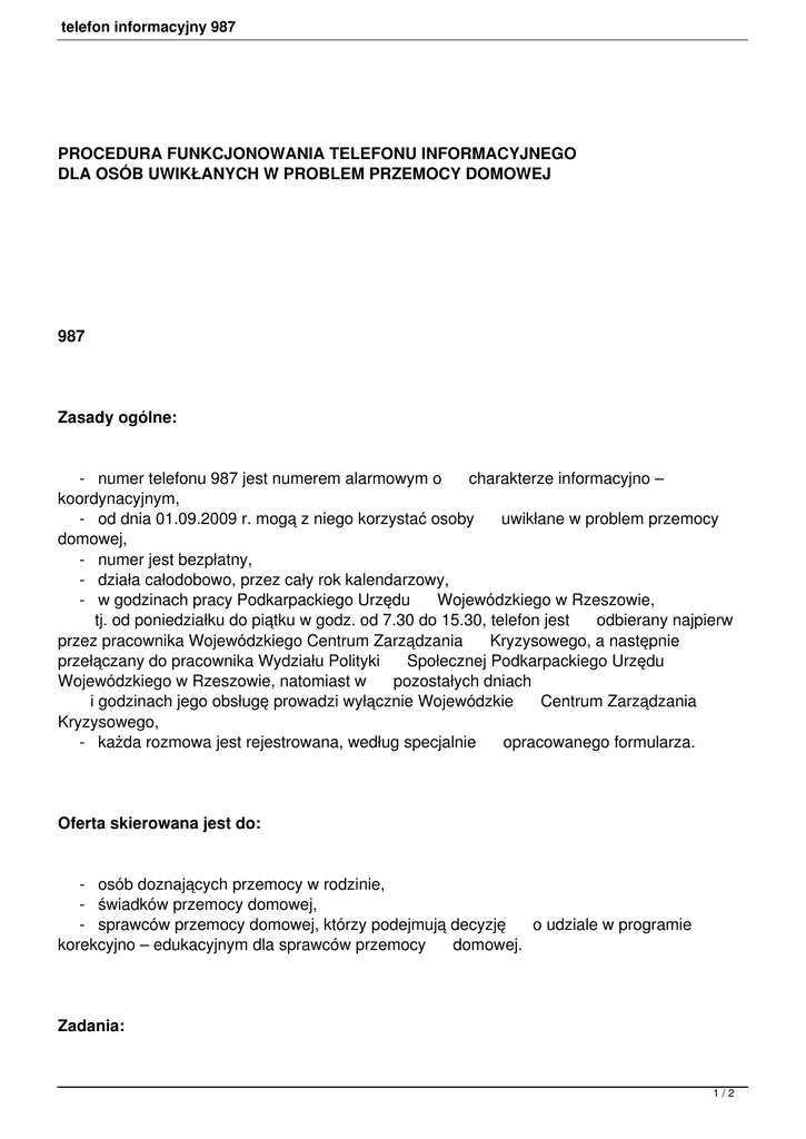 telefon informacyjny 987 PROCEDURA FUNKCJONOWANIA TELEFONU INFORMACYJNEGO DLA OSÓB UWIKŁANYCH W PROBLEM PRZEMOCY DOMOWEJ 987 Zasady ogólne: - numer telefonu 987 jest numerem alarmowym o charakterze informacyjno – koordynacyjnym, - od dnia 01.09.2009 r. mogą z niego korzystać osoby uwikłane w problem przemocy domowej, - numer jest bezpłatny, - działa całodobowo, przez cały rok kalendarzowy, - w godzinach pracy Podkarpackiego Urzędu Wojewódzkiego w Rzeszowie, tj. od poniedziałku do piątku w godz. od 7.30 do 15.30, telefon jest odbierany najpierw przez pracownika Wojewódzkiego Centrum Zarządzania Kryzysowego, a następnie przełączany do pracownika Wydziału Polityki Społecznej Podkarpackiego Urzędu Wojewódzkiego w Rzeszowie, natomiast w pozostałych dniach i godzinach jego obsługę prowadzi wyłącznie Wojewódzkie Centrum Zarządzania Kryzysowego, - każda rozmowa jest rejestrowana, według specjalnie opracowanego formularza. Oferta skierowana jest do: - osób doznających przemocy w rodzinie, - świadków przemocy domowej, - sprawców przemocy domowej, którzy podejmują decyzję o udziale w programie korekcyjno – edukacyjnym dla sprawców przemocy domowej. Zadania: 1/2 telefon informacyjny 987 - informowanie o instytucjach i organizacjach świadczących pomoc osobom doświadczającym przemocy, - informowanie o możliwościach uzyskania pomocy hostelowej, psychologicznej, socjalnej, prawnej i in., - informowanie o instytucjach i organizacjach pracujących ze sprawcami przemocy domowej. Zakres udzielanych informacji: Udziela się informacji o instytucjach pomagających osobom doświadczającym przemocy domowej oraz świadkom – zgodnie z bazą danych, którą dysponuje Wydział Polityki Społecznej Podkarpackiego Urzędu Wojewódzkiego w Rzeszowie. Wskazywane są również miejsca, gdzie prowadzona jest praca ze sprawcami przemocy – w ramach programów korekcyjno – edukacyjnych dla sprawców przemocy. Udostępniane są następujące informacje: - Nazwa jednostki udzielającej pomocy osobom doświadczającym przemocy, - Nazwa jednostki pracującej ze sprawcami przemocy, W odniesieniu do w/w: - Nr telefonu, Adres, Dni i godziny pracy, Zakres udzielanej pomocy. 2/2