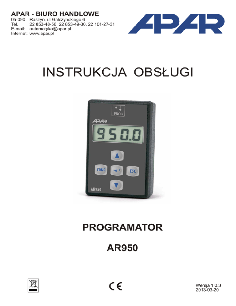 APAR - BIURO HANDLOWE 05-090 Tel. E-mail: Internet: Raszyn, ul Gałczyńskiego 6 22 853-48-56, 22 853-49-30, 22 101-27-31 [email protected] www.apar.pl INSTRUKCJA OBSŁUGI PROGRAMATOR AR950 Wersja 1.0.3 2013-03-20 SPIS TREŚCI 1. ZASADY BEZPIECZEŃSTWA ........................................................................ 2 2. OGÓLNA CHARAKTERYSTYKA PROGRAMATORA ................................. 2 3. DANE TECHNICZNE ...................................................................................... 2 4. WYMIARY I OPIS ELEMENTÓW ZEWNĘTRZNYCH ..................................... 3 5. FUNKCJE PRZYCISKÓW ............................................................................... 3 6. PROGRAMOWANIE PARAMETRÓW KONFIGURACJI .............................. 3 7. LISTA KOMUNIKATÓW I BŁĘDÓW ............................................................... 4 8. NOTATKI WŁASNE ......................................................................................... 4 Producent zastrzega sobie prawo do dokonywania zmian w konstrukcji i oprogramowaniu urządzenia bez pogorszenia parametrów technicznych. 1. ZASADY BEZPIECZEŃSTWA ! n przed rozpoczęciem użytkowania urządzenia należy dokładnie przeczytać niniejszą instrukcję, n zapewnić właściwe warunki pracy, zgodne ze specyfikacją urządzenia (wilgotność, temperatura). 2 . OGÓLNA CHARAKTERYSTYKA PROGRAMATORA n autonomiczny programator z wyświetlaczem LCD do konfiguracji przetworników programowalnych serii AR5xx (np. AR592, AR593, AR594, AR580, AR581) oraz przełącznika sygnałów AR921 n wyświetlanie bieżącej wartości pomiaru oraz podgląd i edycja parametrów n programowanie rodzaju wejścia, zakresów przetwarzania, alarmów oraz innych danych konfiguracyjnych n obudowa ręczna IP20 n w zestawie kabel połączeniowy USB o długości 2m n zasilanie przez kabel USB z programowanego urządzenia 3. DANE TECHNICZNE Odczyt cyfrowy.............................................................. LCD, 7-segmentowy - ilość cyfr ................................................................. 4 - wysokość cyfr ......................................................... 10 mm - zakres wskazań ...................................................... -1999÷9999 Częstotliwość odświeżania wartości pomiaru............4 Hz Interfejs komunikacyjny................................................cyfrowy TTL, gniazdo typu USB, protokół z sumą kontrolną CRC Kabel połączeniowy.......................................................typu USB o długości 2m, rozłączny Zasilanie......................................................................... przez kabel USB z programowanego urządzenia Zakres temperatur pracy ..............................................0 ÷ 65 °C Zakres wilgotności względnej ..................................... 0 ÷ 90 % (bez kondensacji) Obudowa ....................................................................... ręczna, materiał ABS Wymiary.......................................................................... 57 x 92 x 25,4 mm Stopień ochrony............................................................ IP50 (obudowa), IP20 (gniazdo USB) Pozycja pracy.................................................................dowolna Masa - bez kabla połączeniowego............................ ~75g - z kablem........................................................ ~120g Kompatybilność elektromagnetyczna (EMC) - odporność : wg normy PN-EN 61000-6-2:2002(U) - emisyjność : wg normy PN-EN 61000-6-4:2002(U) -2- 4. WYMIARY I OPIS ELEMENTÓW ZEWNĘTRZNYCH gniazdo typu USB 57 mm 25,4 mm 92 mm wyświetlacz LCD Wymiary ! UWAGA : Podłączenie do gniazda PROG urządzeń innych niż przetworniki programowalne serii AR5xx grozi zniszczeniem podłączanego sprzętu oraz programatora AR950 klawiatura 5. FUNKCJE PRZYCISKÓW Przycisk Funkcja wejście w tryb konfiguracji parametrów (po czasie przytrzymania większym niż 2 sek, w trybie wyświetlania wartości mierzonej), - edycja bieżącego parametru w trybie konfiguracji (wyświetlenie wartości parametru), - zatwierdzenie wartości edytowanego parametru, (w tekście oznaczany jako SET), - zwiększenie wartości parametru w trybie konfiguracji, (w tekście oznaczany jako t ), - przejście do następnego parametru, - zmniejszenie wartości parametru w trybie konfiguracji, (w tekście oznaczany jako s ), - przejście do poprzedniego parametru , - anulowanie zmian edytowanego parametru (powrót do wyświetlania nazwy parametru), - wyjście z trybu konfiguracji parametrów (po czasie przytrzymania większym niż 1 sek) 6. PROGRAMOWANIE PARAMETRÓW KONFIGURACJI n połączyć kablem znajdującym się w zestawie programator AR950 z urządzeniem konfigurowanym (przetwornikiem z serii AR5xx), n podłączenie programatora może odbywać sie zarówno przed włączeniem zasilania jak i w trakcie pracy urządzenia, n wejść w tryb programowania parametrów konfiguracyjnych poprzez naciśnięcie (na ok 2s) przycisku CONF do czasu pojawienia się na wyświetlaczu chwilowego komunikatu C o n F , następnie wyświetlana jest mnemoniczna nazwa pierwszego parametru ( : i n P ), n przycisk s powoduje przejście do następnego parametru, a t cofnięcie do poprzedniego (: i n P « F i L t « : d o t « ...), lista parametrów konfiguracyjnych opisana jest w instrukcji obsługi konfigurowanego urządzenia, n w celu zmiany lub podglądu wartości bieżącego parametru wcisnąć przycisk SET (edycja parametru), n przycisk s lub t powoduje zmianę wartości aktualnego parametru, n ponowne wciśniecie SET powoduje zapis edytowanej wartości i powrót do wyświetlania nazwy parametru (np. F i L t ), n w trybie edycji parametru krótkie wciśnięcie przycisku ESC powoduje anulowanie zmian i powrót do trybu wyświetlania nazwy parametru, n wyjście z trybu programowania parametrów konfiguracyjnych następuje poprzez długie (ok.1s) wciśnięcie przycisku ESC lub samoczynnie po o