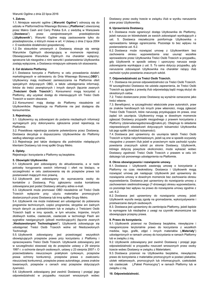 Warunki Ogólne z dnia 22 lipca 2016 1. Zakres. 1.1. Niniejsze warunki ogólne („Warunki Ogólne”) odnoszą się do udziału w PlatformieDnia Własnego Biznesu („Platforma”) stworzonej przez Makro Cash and Carry Polska S.A. z siedzibą w Warszawie („Dostawca”) przez zarejestrowanych przedsiębiorców („Użytkownik”). Warunki Ogólne mają zastosowanie tylko do przedsiębiorców, o których mowa w art. 4 Ustawy z dnia 2 lipca 2004 r. O swobodzie działalności gospodarczej. 1.2. Do stosunków umownych z Dostawcą stosuje się wersję Warunków Ogólnych obowiązującą w momencie rejestracji. Obowiązywanie Warunków Ogólnych ma charakter wyłączny; sprzeczne lub niezgodne z nimi warunki i postanowienia Użytkownika zostają wyłączone, a Dostawca niniejszym odmawia ich stosowania. 2. Cel działania Platformy. 2.1. Dostawca korzysta z Platformy w celu prowadzenia działań marketingowych w odniesieniu do Dnia Własnego Biznesu(„OBD”). Użytkownicy mają możliwość zamieszczania na Platformie ofert specjalnych dotyczących OBD, a także udostępniania informacji, linków do treści zewnętrznych i innych danych (łącznie zwanych „Treściami Osób Trzecich”). Konsumenci mogą korzystać z Platformy, aby uzyskać dostęp do interesujących ich Treści Osób Trzecich w swoim obszarze. 2.2. Konsumenci mają dostęp do Platformy niezależnie od Użytkowników. Rejestracja na Platformie nie jest dostępna dla konsumentów. 3. Rejestracja. 3.1. Użytkownicy są zobowiązani do podania niezbędnych informacji wymaganych przy dokonywaniu zgłoszenia przed rejestracją na Platformie. 3.2. Prawidłowa rejestracja zostanie potwierdzona przez Dostawcę. Dostawca decyduje o dopuszczeniu Użytkowników do Platformy według własnego uznania. 3.3. Rejestracja jest także dostępna dla podmiotów niebędących klientami Dostawcy lub innej spółki Grupy Metro. 4. Opłaty. Rejestracja i korzystanie z Platformy są bezpłatne. 5. Obowiązki Użytkownika 5.1. Użytkownik jest zobowiązany do aktualizowania, a w razie potrzeby korygowania swoich informacji i ofert na bieżąco, w szczególności w celu zastosowania się do przepisów prawa lub postanowień mających moc prawną. 5.2. Użytkownik jest zobowiązany do wyznaczenia osoby do kontaktów z Dostawcą. Przy zgłoszeniu osoba kontaktowa zobowiązana jest podać Dostawcy aktualny adres e-mail. 5.3. Użytkownik może promować OBD niezależnie od Treści Osób Trzecich wyłącznie przy użyciu materiałów promocyjnych dostarczonych przez Dostawcę lub inną spółkę Grupy Metro. 5.4. Użytkownik nie może instalować ani udostępniać do pobierania programów technicznych, części programów, skryptów ani żadnych innych danych za pośrednictwem lub w związku z Treściami Osób Trzecich bądź w inny sposób, w tym wirusów, trojanów, innych złośliwych kodów, ciasteczek, ciasteczek w technologii Flash ani sygnałów nawigacyjnych (pikseli monitorujących) (łącznie zwanych „Niedozwolonymi Technologiami”). Użytkownik zobowiązuje się udostępniać Treści Osób Trzecich wolne od Niedozwolonych Technologii. 5.5. Użytkownik zobowiązany jest przestrzegać wszystkich obowiązujących przepisów prawa przy korzystaniu z Platformy i opracowywaniu Treści Osób Trzecich. Użytkownik zobowiązany jest w szczególności stosować się do przepisów ustawy z 29 sierpnia 1997 r. o ochronie danych osobowych, ustawy z 23 sierpnia 2007 r. O przeciwdziałaniu nieuczciwym praktykom rynkowym, przepisów prawa ochrony konkurencji, przepisów prawa o zwalczaniu nieuczciwej konkurencji, przepisów prawa autorskiego, prawa znaków towarowych, przepisów o cenach oraz przepisów dotyczących żywności. 5.6. Użytkownik zobowiązany jest zwolnić Dostawcę i przejąć jego odpowiedzialność w przypadku roszczeń wnoszonych wobec Dostawcy przez osoby trzecie w związku i/lub w wyniku naruszenia praw przez Użytkownika. 6. Uprawnienia Dostawcy. 6.1. Dostawca może ograniczyć dostęp Użytkownika do Platformy, jeżeli narusza on którekolwiek ze swoich zobowiązań wynikających z ust. 5. Dostawca niezwłocznie poinformuje Użytkownika o wprowadzeniu takiego ograniczenia. Pozostaje to bez wpływu na postanowienia ust. 6.2. 6.2. Dostawca może rozwiązać umowę z Użytkownikiem bez zachowania okresu wypowiedzenia oraz usunąć wszelkie wprowadzone przez Użytkownika Treści Osób Trzecich w przypadku, gdy Użytkownik w sposób celowy i uporczywy narusza swoje zobowiązania wynikające z ust. 5. To samo dotyczy przypadku, gdy naruszenie zobowiązań Użytkownika ma charakter rażący i/lub zachodzi ryzyko powstania znacznych szkód. 7. Odpowiedzialność za Treści Osób Trzecich. 7.1. Dostawca nie ponosi odpowiedzialności za Treści Osób Trzecich. W szczególności Dostawca nie udziela zapewnienia, że Treści Osób Trzecich są zgodne z prawdą i/lub odpowiadają bądź mogą służyć do określonych celów. 7.2. Treści dostarczane przez Dostawcę są wyraźnie oznaczone jako treści własne. 7.3. Beneficjenci, w szczególności właściciele praw autorskich, praw ze znaków handlowych lub innych praw własności, mogą zgłaszać Treści Osób Trzecich, które naruszają przysługujące im prawa, oraz żądać ich usunięcia. Użytkownicy mogą w dowolnym momencie zgłaszać Dostawcy przypadki niezgodnego z prawem korzystania z Platformy ([email protected]). Obejmuje to składanie nieprawdziwych oświadczeń dotyczących tożsamości Użytkownika lub jego spółki (kradzież tożsamości). 7.4. Dostawca jest uprawniony do usunięcia takich Treści Osób Trzecich w trybie natychmiastowym, jeżeli są one w sposób oczywisty niezgodne z prawem i/lub jeżeli w przeciwnym razie zachodzi ryzyko powstania znacznych szkód po stronie Dostawcy. Użytkownik, którego dotyczą powyższe okoliczności, może wykazać wobec Dostawcy zgodność Treści Osób Trzecich z prawem w celu ich dalszego lub ponownego udostępnienia na Platformie.