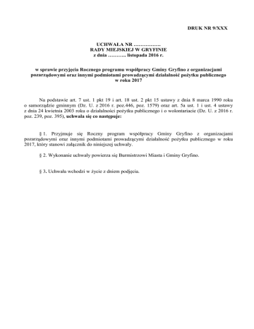 DRUK NR 9/XXX UCHWAŁA NR ……………. RADY MIEJSKIEJ W GRYFINIE z dnia ……….. listopada 2016 r. w sprawie przyjęcia Rocznego programu współpracy Gminy Gryfino z organizacjami pozarządowymi oraz innymi podmiotami prowadzącymi działalność pożytku publicznego w roku 2017 Na podstawie art. 7 ust. 1 pkt 19 i art. 18 ust. 2 pkt 15 ustawy z dnia 8 marca 1990 roku o samorządzie gminnym (Dz. U. z 2016 r. poz.446, poz. 1579) oraz art. 5a ust. 1 i ust. 4 ustawy z dnia 24 kwietnia 2003 roku o działalności pożytku publicznego i o wolontariacie (Dz. U. z 2016 r. poz. 239, poz. 395), uchwala się co następuje: § 1. Przyjmuje się Roczny program współpracy Gminy Gryfino z organizacjami pozarządowymi oraz innymi podmiotami prowadzącymi działalność pożytku publicznego w roku 2017, który stanowi załącznik do niniejszej uchwały. § 2. Wykonanie uchwały powierza się Burmistrzowi Miasta i Gminy Gryfino. § 3. Uchwała wchodzi w życie z dniem podjęcia. UZASADNIENIE Niniejsza uchwała stanowi realizację zapisów ustawy o działalności pożytku publicznego i o wolontariacie (Dz. U. z 2016 r. poz. 239 z późn. zm.), która to nakłada na gminę obowiązek uchwalenia rocznego programu współpracy z organizacjami pozarządowymi oraz podmiotami wymienionymi w art. 3 ust. 3 ww. ustawy. Efektywna współpraca samorządu z podmiotami III sektora, jest jednym z elementów pozwalających na skuteczniejsze realizowanie celów nadrzędnych, takich jak: rozwój społecznoekonomiczny gminy, zaspokajanie potrzeb społecznych oraz podnoszenie poziomu życia mieszkańców. Dążyć należy do tego, aby działania podejmowane przez samorząd i ww. podmioty były komplementarne i oparte na zasadach partnerstwa, jawności, pomocniczości, efektywności, suwerenności stron oraz uczciwej konkurencji. Program ten ma na celu lepsze wykonywanie zadań na rzecz gminy poprzez możliwe jak największe wykorzystanie potencjału organizacji pozarządowych, zwiększenie skuteczności i efektywności działań związanych z wykonywaniem zadań publicznych i dalszy wzrost partycypacji społecznej w rozwiązywaniu problemów. W związku z powyższym podjęcie niniejszej uchwały jest w pełni uzasadnione. Sporządziła: Barbara Lefik-Żarczyńska Załącznik do Uchwały ……………… Rady Miejskiej w Gryfinie z dnia ……….. listopada 2016 r. Roczny Program współpracy Gminy Gryfino z organizacjami pozarządowymi oraz innymi podmiotami prowadzącymi działalność pożytku publicznego w roku 2017 Organizacje pozarządowe, obok sektora publicznego i prywatnego są trzecim sektorem działającym na rzecz dobra publicznego. Stanowią one bazę dla rozwoju lokalnych społeczności i podejmują cenne działania dla dobra mieszkańców oraz integrują i aktywizują społeczność lokalną. Roczny program współpracy jest propozycją dla wszystkich organizacji pozarządowych i innych podmiotów, o których mowa w art. 3 ust. 3 ustawy o działalności pożytku publicznego i o wolontariacie, wyrażających wolę i gotowość współpracy w realizacji ustawowych zadań Gminy Gryfino w roku 2017. Dzięki coraz większej aktywności, organizacje pozarządowe stały się cennym partnerem dla samorządu. Główną cechą tych relacji jest współpraca, która w konsekwencji pozwoli na pobudzenie i wspieranie przez Gminę Gryfino działalności organizacji i podmiotów oraz realizację przez nie zadań publicznych na rzecz Gminy. Intencją samorządu jest bowiem zapewnienie ww. podmiotom jak najlepszych warunków do działania oraz wspieranie ich funkcjonowania i wykorzystanie ich społecznego potencjału. Postanowienia ogólne § 1. Podstawą Rocznego programu współpracy Gminy Gryfino z organizacjami pozarządowymi oraz innymi podmiotami prowadzącymi działalność pożytku publicznego, zwanego dalej „Programem” jest ustawa z dnia 24 kwietnia 2003 r. o działalności pożytku publicznego i o wolontariacie (Dz.U. z 2016 r. poz. 239 z późn. zm.). 1) 2) 3) 4) 5) 6) § 2. Ilekroć w Programie jest mowa o: ustawie – rozumie się przez to ustawę o działalności pożytku publicznego i o wolontariacie (Dz. U. z 2016 r. poz. 239 z późn. zm.), organizacjach – rozumie się przez to organizacje pozarządowe oraz inne podmioty, o których mowa w art. 3 ust. 3 ustawy o działalności pożytku publicznego i wolontariacie, Gminie – rozumie się przez to Gminę Gryfino, Burmistrzu – rozumie się przez to Burmistrza Miasta i Gminy Gryfino, komisjach – rozumie się przez to komisje konkursowe ds. opiniowania ofert na realizację zadań publicznych, konkursie ofert – rozumie się przez to otwarty konkurs ofert na realizację zadań publicznych, o którym mowa w art. 11 ust. 2 ustawy o działalności pożytku publicznego i o wolontariacie. Cel główny i cele szczegółowe § 3. Celem głównym Programu jest kształtowanie społeczeństwa obywatelskiego oraz budowanie i umacnianie partnerstwa pomiędzy Gminą a organizacjami, służącego zaspokajaniu potrzeb mieszkańców. § 4. Celami szczegółowymi Programu są: 1) poprawa jakości życia, poprzez pełniejsze zaspokajanie potrzeb mieszkańców Gminy, 2) 3) 4) 5) integracja podmiotów realizujących zadania publiczne, prezentacja dorobku organizacji i promowanie ich osiągnięć, wzmocnienie potencjału organizacji, umacnianie w świadomości społecznej poczucia odpowiedzialności za siebie, swoje otoczenie, wspólnotę lokalną oraz jej tradycje, 6) aktywizowanie organizacji do pozyskiwania środków finansowych ze źródeł pozabudżetowych na realizację zadań służących mieszkańcom gminy, 7) promocja miasta i gminy Gryfino. Zasady współpracy 1) 2) 3) 4) 5) 6) § 5. Współpraca pomiędzy Gminą a organizacjami odbywa się na zasadach: pomocniczości – zgodnie, z którą Gmina współpracuje z organizacjami, umożliwiając im realizację zadań publicznych na zasadach określonych w ustawie, suwerenności stron – oznaczającej respe