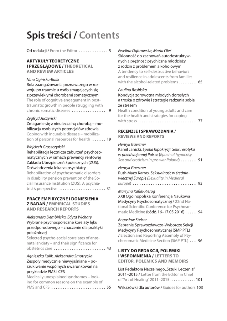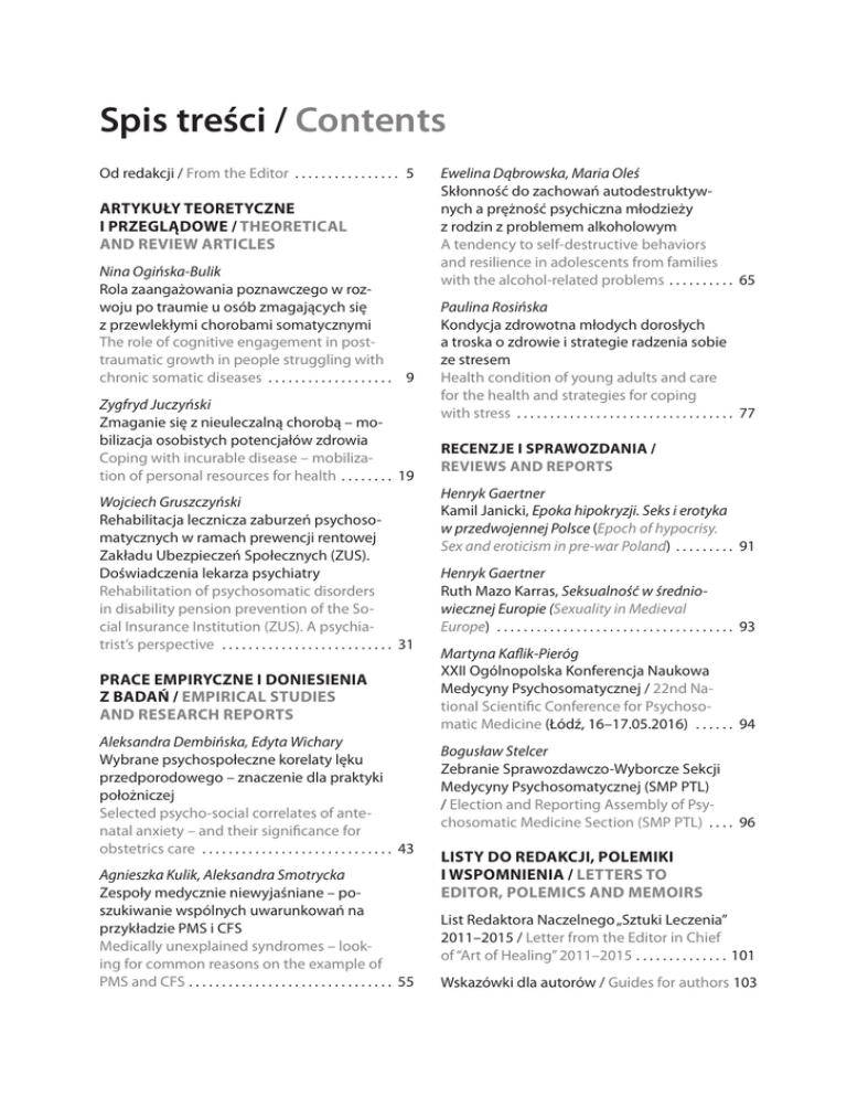 Spis treści / Contents Od redakcji / From the Editor . . . . . . . . . . . . . . . . 5 ARTYKUŁY TEORETYCZNE I PRZEGLĄDOWE / THEORETICAL AND REVIEW ARTICLES Nina Ogińska-Bulik Rola zaangażowania poznawczego w rozwoju po traumie u osób zmagających się z przewlekłymi chorobami somatycznymi The role of cognitive engagement in posttraumatic growth in people struggling with chronic somatic diseases . . . . . . . . . . . . . . . . . . . 9 Zygfryd Juczyński Zmaganie się z nieuleczalną chorobą – mobilizacja osobistych potencjałów zdrowia Coping with incurable disease – mobilization of personal resources for health . . . . . . . . 19 Wojciech Gruszczyński Rehabilitacja lecznicza zaburzeń psychosomatycznych w ramach prewencji rentowej Zakładu Ubezpieczeń Społecznych (ZUS). Doświadczenia lekarza psychiatry Rehabilitation of psychosomatic disorders in disability pension prevention of the Social Insurance Institution (ZUS). A psychiatrist’s perspective . . . . . . . . . . . . . . . . . . . . . . . . . . 31 PRACE EMPIRYCZNE I DONIESIENIA Z BADAŃ / EMPIRICAL STUDIES AND RESEARCH REPORTS Aleksandra Dembińska, Edyta Wichary Wybrane psychospołeczne korelaty lęku przedporodowego – znaczenie dla praktyki położniczej Selected psycho-social correlates of antenatal anxiety – and their significance for obstetrics care . . . . . . . . . . . . . . . . . . . . . . . . . . . . . 43 Agnieszka Kulik, Aleksandra Smotrycka Zespoły medycznie niewyjaśniane – poszukiwanie wspólnych uwarunkowań na przykładzie PMS i CFS Medically unexplained syndromes – looking for common reasons on the example of PMS and CFS . . . . . . . . . . . . . . . . . . . . . . . . . . . . . . . 55 Ewelina Dąbrowska, Maria Oleś Skłonność do zachowań autodestruktywnych a prężność psychiczna młodzieży z rodzin z problemem alkoholowym A tendency to self-destructive behaviors and resilience in adolescents from families with the alcohol-related problems . . . . . . . . . . 65 Paulina Rosińska Kondycja zdrowotna młodych dorosłych a troska o zdrowie i strategie radzenia sobie ze stresem Health condition of young adults and care for the health and strategies for coping with stress . . . . . . . . . . . . . . . . . . . . . . . . . . . . . . . . . 77 RECENZJE I SPRAWOZDANIA / REVIEWS AND REPORTS Henryk Gaertner Kamil Janicki, Epoka hipokryzji. Seks i erotyka w przedwojennej Polsce (Epoch of hypocrisy. Sex and eroticism in pre-war Poland) . . . . . . . . . 91 Henryk Gaertner Ruth Mazo Karras, Seksualność w średniowiecznej Europie (Sexuality in Medieval Europe) . . . . . . . . . . . . . . . . . . . . . . . . . . . . . . . . . . . . 93 Martyna Kaflik-Pieróg XXII Ogólnopolska Konferencja Naukowa Medycyny Psychosomatycznej / 22nd National Scientific Conference for Psychosomatic Medicine (Łódź, 16–17.05.2016) . . . . . . 94 Bogusław Stelcer Zebranie Sprawozdawczo-Wyborcze Sekcji Medycyny Psychosomatycznej (SMP PTL) / Election and Reporting Assembly of Psychosomatic Medicine Section (SMP PTL) . . . . 96 LISTY DO REDAKCJI, POLEMIKI I WSPOMNIENIA / LETTERS TO EDITOR, POLEMICS AND MEMOIRS List Redaktora Naczelnego „Sztuki Leczenia” 2011–2015 / Letter from the Editor in Chief of “Art of Healing” 2011–2015 . . . . . . . . . . . . . . 101 Wskazówki dla autorów / Guides for authors 103