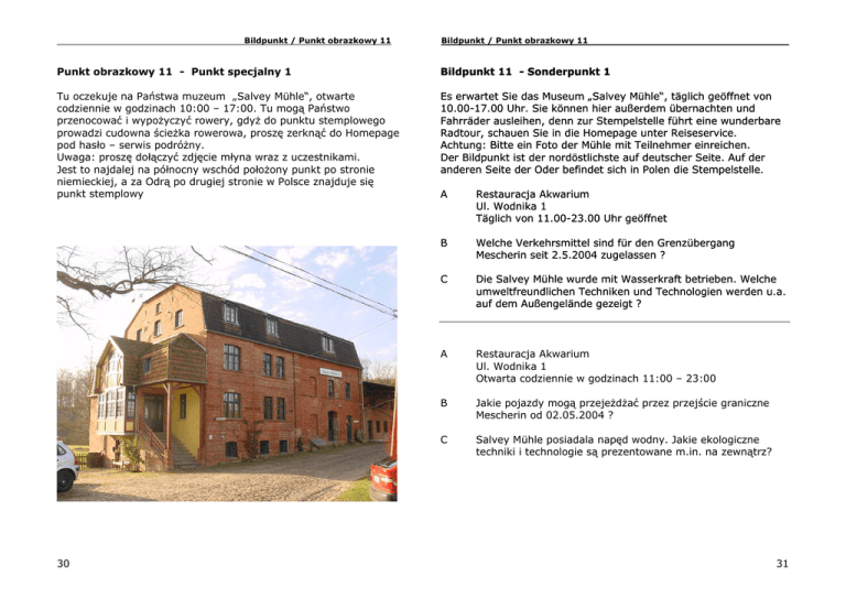 Bildpunkt / Punkt obrazkowy 11 Bildpunkt / Punkt obrazkowy 11 Punkt obrazkowy 11 - Punkt specjalny 1 Bildpunkt 11 - Sonderpunkt 1 Tu oczekuje na Państwa muzeum „Salvey Mühle“, otwarte codziennie w godzinach 10:00 – 17:00. Tu mogą Państwo przenocować i wypożyczyć rowery, gdyż do punktu stemplowego prowadzi cudowna ścieżka rowerowa, proszę zerknąć do Homepage pod hasło – serwis podróżny. Uwaga: proszę dołączyć zdjęcie młyna wraz z uczestnikami. Jest to najdalej na północny wschód położony punkt po stronie niemieckiej, a za Odrą po drugiej stronie w Polsce znajduje się punkt stemplowy Es erwartet Sie das Museum „Salvey Mühle“, täglich geöffnet von 10.00-17.00 Uhr. Sie können hier außerdem übernachten und Fahrräder ausleihen, denn zur Stempelstelle führt eine wunderbare Radtour, schauen Sie in die Homepage unter Reiseservice. Achtung: Bitte ein Foto der Mühle mit Teilnehmer einreichen. Der Bildpunkt ist der nordöstlichste auf deutscher Seite. Auf der anderen Seite der Oder befindet sich in Polen die Stempelstelle. 30 A Restauracja Akwarium Ul. Wodnika 1 Täglich von 11.00-23.00 Uhr geöffnet B Welche Verkehrsmittel sind für den Grenzübergang Mescherin seit 2.5.2004 zugelassen ? C Die Salvey Mühle wurde mit Wasserkraft betrieben. Welche umweltfreundlichen Techniken und Technologien werden u.a. auf dem Außengelände gezeigt ? A Restauracja Akwarium Ul. Wodnika 1 Otwarta codziennie w godzinach 11:00 – 23:00 B Jakie pojazdy mogą przejeżdżać przez przejście graniczne Mescherin od 02.05.2004 ? C Salvey Mühle posiadala napęd wodny. Jakie ekologiczne techniki i technologie są prezentowane m.in. na zewnątrz? 31