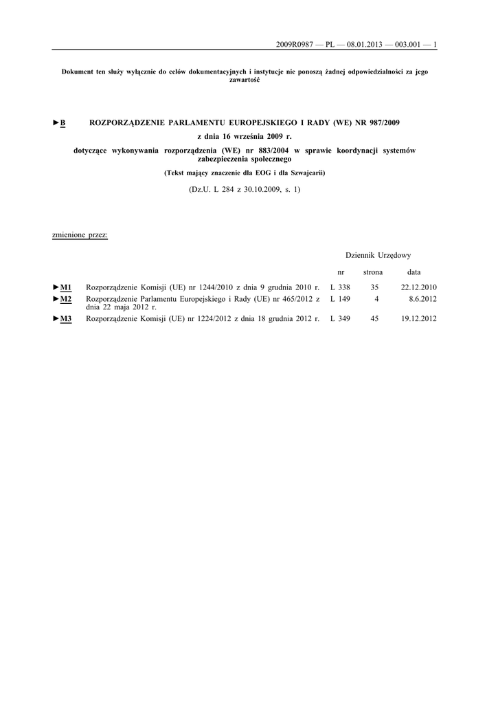2009R0987 — PL — 08.01.2013 — 003.001 — 1 Dokument ten służy wyłącznie do celów dokumentacyjnych i instytucje nie ponoszą żadnej odpowiedzialności za jego zawartość ►B ROZPORZĄDZENIE PARLAMENTU EUROPEJSKIEGO I RADY (WE) NR 987/2009 z dnia 16 września 2009 r. dotyczące wykonywania rozporządzenia (WE) nr 883/2004 w sprawie koordynacji systemów zabezpieczenia społecznego (Tekst mający znaczenie dla EOG i dla Szwajcarii) (Dz.U. L 284 z 30.10.2009, s. 1) zmienione przez: Dziennik Urzędowy ►M1 ►M2 ►M3 Rozporządzenie Komisji (UE) nr 1244/2010 z dnia 9 grudnia 2010 r. Rozporządzenie Parlamentu Europejskiego i Rady (UE) nr 465/2012 z dnia 22 maja 2012 r. Rozporządzenie Komisji (UE) nr 1224/2012 z dnia 18 grudnia 2012 r. nr strona L 338 L 149 35 4 22.12.2010 8.6.2012 L 349 45 19.12.2012 data 2009R0987 — PL — 08.01.2013 — 003.001 — 2 ▼B ROZPORZĄDZENIE PARLAMENTU EUROPEJSKIEGO I RADY (WE) NR 987/2009 z dnia 16 września 2009 r. dotyczące wykonywania rozporządzenia (WE) nr 883/2004 w sprawie koordynacji systemów zabezpieczenia społecznego (Tekst mający znaczenie dla EOG i dla Szwajcarii) PARLAMENT EUROPEJSKI I RADA UNII EUROPEJSKIEJ, uwzględniając Traktat ustanawiający Wspólnotę Europejską, w szczegól ności jego art. 42 i 308, uwzględniając rozporządzenie (WE) nr 883/2004 Parlamentu Europej skiego i Rady z dnia 29 kwietnia 2004 r. w sprawie koordynacji systemów zabezpieczenia społecznego (1), w szczególności jego art. 89, uwzględniając wniosek Komisji, uwzględniając opinię Ekonomiczno-Społecznego (2), Europejskiego Komitetu stanowiąc zgodnie z procedurą określoną w art. 251 Traktatu (3), a także mając na uwadze, co następuje: (1) Rozporządzenie (WE) nr 883/2004 unowocześnia zasady koordy nacji systemów zabezpieczenia społecznego państw członkow skich, określając środki i procedury wprowadzania tych zasad w życie i upraszczając te zasady dla wszystkich zaangażowanych podmiotów. Należy ustanowić przepisy wykonawcze. (2) Ściślejsza i skuteczniejsza współpraca między instytucjami zabez pieczenia społecznego jest głównym warunkiem, aby osoby objęte rozporządzeniem (WE) nr 883/2004 mogły korzystać ze swoich praw w sposób możliwie szybki i optymalny. (3) Właściwym środkiem szybkiej i niezawodnej wymiany danych między instytucjami państw członkowskich jest komunikacja drogą elektroniczną. Dzięki elektronicznemu przetwarzaniu danych procedury powinny zostać przyspieszone dla wszystkich zaangażowanych podmiotów. Ponadto zainteresowani powinni zostać objęci wszystkimi gwarancjami przewidzianymi w przepi sach wspólnotowych dotyczących ochrony osób fizycznych w zakresie przetwarzania danych osobowych i do swobodnego przepływu tych danych. (4) Dostępność szczegółowych danych (w tym szczegółowych danych elektronicznych) tych podmiotów krajowych, które będą prawdopodobnie uczestniczyć w wykonywaniu rozporządze nia (WE) nr 883/2004, w formie umożliwiającej ich bieżącą aktualizację, powinno ułatwić wymianę informacji między państwami członkowskimi. Podejście, zgodnie z którym infor macje czysto faktograficzne mają być przede wszystkim przy datne i bezpośrednio dostępne dla obywateli, jest cennym uprosz czeniem, które powinno zostać wprowadzane przez niniejsze rozporządzenie. (1) Dz.U. L 166 z 30.4.2004, s. 1. (2) Dz.U. C 324 z 30.12.2006, s. 59. (3) Opinia Parlamentu Europejskiego z dnia 9 lipca 2008 r. (dotychczas nieopub likowana w Dzienniku Urzędowym), wspólne stanowisko Rady z dnia 17 grudnia 2008 r. (Dz.U. C 38 E z 17.2.2009, s. 26) oraz stanowisko Parlamentu Europejskiego z dnia 22 kwietnia 2009 r. Decyzja Rady z dnia 27 lipca 2009 r. 2009R0987 — PL — 08.01.2013 — 003.001 — 3 ▼B (5) Osiągnięcie jak najbardziej płynnego funkcjonowania złożonych procedur wdrażających przepisy dotyczące koordynacji systemów zabezpieczenia społecznego i skutecznego zarządzania tymi procedurami wymaga systemu pozwalającego na natychmiastową aktualizację załącznika 4. Przygotowanie i stosowanie przepisów w tym celu wymaga bliskiej współpracy pomiędzy państwami członkowskimi a Komisją, a ich wdrażanie powinno odbywać się szybko z uwagi na konsekwencje opóźnień dotykające zarówno obywateli, jak i organy administracyjne. Komisja powinna zatem uzyskać uprawnienia do utworzenia bazy danych i zarządzania nią, a także zapewnienia jej operacyjności przynaj mniej od daty wejścia w życie niniejszego rozporządzenia. Komisja powinna w szczególności podjąć niezbędne kroki w celu zintegrowania w tej bazie danych informacji wymienio nych w załączniku 4. (6) Wzmocnienie niektórych procedur powinno zapewnić użytkow nikom rozporządzenia (WE) nr 883/2004 większą pewność prawną i przejrzystość. Na przykład ustalenie wspólnych terminów wykonania niektórych obowiązków lub zakończenia niektórych czynności administracyjnych powinno pomóc w wyjaś nieniu i w organizacji stosunków między osobami ubezpieczo nymi a instytucjami. (7) Osoby objęte niniejszym rozporządzeniem powinny otrzymywać w odpowiednim czasie od właściwej instytucji odpowiedź na swoje wnioski. Odpowiedzi należy udzielać najpóźniej w termi nach określonych w ustawodawstwie dotyczącym zabezpieczenia społecznego danego państwa członkowskiego, w przypadku gdy takie terminy w nim obowiązują. Pożądane jest, aby te państwa członkowskie, których ustawodawstwo dotyczące zabezpieczenia społecznego nie przewiduje takich terminów, rozważyły ich przy jęcie oraz udostępnienie ich w razie potrzeby zainteresowanym. (8) Państwa członkowskie, ich właściwe władze oraz instytucje zabezpieczenia społecznego powinny mieć możliwość uzgad niania między sobą uproszczonych procedur i ustaleń administra cyjnych, które uznają za bardziej skuteczne i lepiej dostosowane do uwarunkowań ich własnych systemów zabezpieczenia społecz nego. Ta