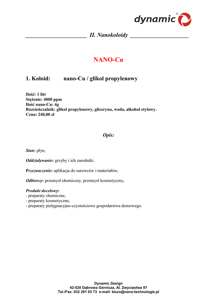 ________________________ II. Nanokoloidy _______________________ NANO-Cu 1. Koloid: nano-Cu / glikol propylenowy Ilość: 1 litr Stężenie: 4000 ppm Ilość nano-Cu: 4g Rozcieńczalnik: glikol propylenowy, gliceryna, woda, alkohol etylowy. Cena: 240,00 zł Opis: Stan: płyn, Oddziaływanie: grzyby i ich zarodniki. Przeznaczenie: aplikacja do surowców i materiałów, Odbiorcy: przemysł chemiczny, przemysł kosmetyczny, Produkt docelowy: - preparaty chemiczne, - preparaty kosmetyczne, - preparaty pielęgnacyjno-czystościowe gospodarstwa domowego. Dynamic Design 42-520 Dąbrowa Górnicza, Al. Zwycięstwa 97 Tel./Fax: 032 291 03 73 e-mail: [email protected] 2. Koloid: nano-Cu / gliceryna Ilość: 1 litr Stężenie: 4000 ppm Ilość nano-Cu: 4g Rozcieńczalnik: gliceryna, glikol propylenowy, woda, alkohol etylowy. Cena: 240,00 zł Opis: Stan: płyn, Oddziaływanie: grzyby i ich zarodniki. Przeznaczenie: aplikacja do surowców i materiałów, Odbiorcy: przemysł chemiczny, przemysł kosmetyczny, Produkt docelowy: - preparaty chemiczne, - preparaty kosmetyczne, - preparaty pielęgnacyjno-czystościowe gospodarstwa domowego. Dynamic Design 42-520 Dąbrowa Górnicza, Al. Zwycięstwa 97 Tel./Fax: 032 291 03 73 e-mail: [email protected] 3. Koloid: nano-Cu / PVA Ilość: 1 litr Stężenie: 4000 ppm Ilość nano-Cu: 4g Rozcieńczalnik: woda destylowana Cena: 240,00 zł Opis: Stan: płyn, Oddziaływanie: grzyby i ich zarodniki. Przeznaczenie: aplikacja do surowców i materiałów, preparat gotowy do impregnacji, Odbiorcy: przemysł chemiczny, budownictwo, przemysł drzewny, przemysł tekstylny. Produkt docelowy: - preparaty chemiczne, - produkty chemii gospodarczej - preparaty pielęgnacyjno-czystościowe gospodarstwa domowego, - impregnaty do: mas tynkarskich, materiałów ocieplających, materiałów izolacyjnych, mas wypełniających, mas uszczelniających, fug, preparatów gruntujących, - impregnaty do drewna, - impregnaty do tkanin syntetycznych i naturalnych, Dynamic Design 42-520 Dąbrowa Górnicza, Al. Zwycięstwa 97 Tel./Fax: 032 291 03 73 e-mail: [email protected] 4. Koloid: nano-Cu /Izopropanol / H2O Ilość: 1 litr Stężenie: 4000 ppm Ilość nano-Cu: 4g Rozcieńczalnik: woda destylowana Cena: 240,00 zł Opis: Stan: płyn, Oddziaływanie: grzyby i ich zarodniki. Przeznaczenie: aplikacja do surowców i materiałów, preparat gotowy do impregnacji. Odbiorcy: przemysł chemiczny, budownictwo, przemysł drzewny, przemysł tekstylny, dezynfekcja, ochrona zabytków. Produkt docelowy: - preparaty chemiczne, - produkty chemii gospodarczej - preparaty pielęgnacyjno-czystościowe gospodarstwa domowego, - impregnaty do: mas tynkarskich, materiałów ocieplających, materiałów izolacyjnych, mas wypełniających, mas uszczelniających, fug, preparatów gruntujących, - impregnaty do drewna, - impregnaty do tkanin syntetycznych i naturalnych, - preparaty do dezynfekcji pomieszczeń, - preparaty do dezynfekcji drewna, - preparaty do dezynfekcji obiektów i urządzeń hodowli roślin i zwierząt Dynamic Design 42-520 Dąbrowa Górnicza, Al. Zwycięstwa 97 Tel./Fax: 032 291 03 73 e-mail: [email protected] 5. Koloid: nano-Cu / SiO2 / H2O Ilość: 1 litr Stężenie: 4000 ppm Ilość nano-Cu: 4g Rozcieńczalnik: woda destylowana Cena: 210,00 zł Opis: Stan: płyn, Oddziaływanie: grzyby i ich zarodniki. Przeznaczenie: aplikacja do surowców i materiałów, preparat gotowy do impregnacji. Odbiorcy: przemysł chemiczny, budownictwo, przemysł drzewny, przemysł papierniczy i produkcji opakowań. Produkt docelowy: - preparaty chemiczne, - produkty chemii gospodarczej - impregnaty do: mas tynkarskich, materiałów ocieplających, materiałów izolacyjnych, mas wypełniających, mas uszczelniających, fug, preparatów gruntujących. - impregnaty do papieru i tektury. Dynamic Design 42-520 Dąbrowa Górnicza, Al. Zwycięstwa 97 Tel./Fax: 032 291 03 73 e-mail: [email protected] NANO-Ag 1. Koloid: nano-Ag / glikol propylenowy Ilość: 1 litr Stężenie: 4000 ppm Ilość nano-Ag: 4g Rozcieńczalnik: glikol propylenowy, gliceryna, woda, alkohol etylowy. Cena: 280,00 zł Opis: Stan: płyn, Oddziaływanie: bakterie, grzyby i ich zarodniki. Przeznaczenie: aplikacja do surowców i materiałów, Odbiorcy: przemysł chemiczny, przemysł kosmetyczny, Produkt docelowy: - preparaty chemiczne, - preparaty kosmetyczne, - preparaty pielęgnacyjno-czystościowe gospodarstwa domowego. Dynamic Design 42-520 Dąbrowa Górnicza, Al. Zwycięstwa 97 Tel./Fax: 032 291 03 73 e-mail: [email protected] 2. Koloid: nano-Ag / gliceryna Ilość: 1 litr Stężenie: 4000 ppm Ilość nano-Ag: 4g Rozcieńczalnik: gliceryna, glikol propylenowy, woda, alkohol etylowy. Cena: 280,00 zł Opis: Stan: płyn, Oddziaływanie: bakterie, grzyby i ich zarodniki. Przeznaczenie: aplikacja do surowców i materiałów, Odbiorcy: przemysł chemiczny, przemysł kosmetyczny, Produkt docelowy: - preparaty chemiczne, - preparaty kosmetyczne, - preparaty pielęgnacyjno-czystościowe gospodarstwa domowego. Dynamic Design 42-520 Dąbrowa Górnicza, Al. Zwycięstwa 97 Tel./Fax: 032 291 03 73 e-mail: [email protected] 3. Koloid: nano-Ag / PVA Ilość: 1 litr Stężenie: 4000 ppm Ilość nano-Ag: 4g Rozcieńczalnik: woda destylowana Cena: 280,00 zł Opis: Stan: płyn, Oddziaływanie: bakterie, grzyby i ich zarodniki. Przeznaczenie: aplikacja do surowców i materiałów, preparat gotowy do impregnacji, Odbiorcy: przemysł chemiczny, budownictwo, przemysł drzewny, przemysł tekstylny. Produkt docelowy: - preparaty chemiczne, - produkty chemii gospodarczej - preparaty pielęgnacyjno-czystościowe gospodarstwa domowego, - impregnaty do: mas tynkarskich, materiałów ocieplających, materiałów izolacyjnych, mas wypełniających, mas uszczelniających, fug, preparatów gruntujących, - impregnaty do drewna, - impregnaty do tkanin syntetycznych i naturalnych, Dynamic Design 42-520 Dąbrowa Górnicza, Al. Zwycięstwa 97 Tel./Fax: 032 291 03 73 e-mail: [email protected] 4.