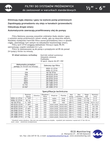 "#$% & ' ( ' % ) *& ) +, # ' - / 0 1 20 . Eliminuj mgł olejow i gazy na wylocie pomp pró niowych Zapobiegaj gromadzeniu si oleju w kanałach (przewodach) Odzyskuj drogie smary Automatycznie zawracaj przefiltrowany olej do pompy % & ' ' () ' ' * + , + ($ - " ! " " -. / + $+ ') ' ( ! ' * ( + ( , * +. ' $ ! + ) '" '-0 )$1 " () ! ' ! ! + '* * ' $ '! % ' 2 ' )$ () + *1 + ,3 ( 4+ 55 56 ! () )' * * , µ! % + ' ' ') + " ! " " "1 +7 + " + '4 ! 4 +. *1 + ! '* 8 * , 9 +*1 +* " ( 1) + % : 55 2 55 ; 2 7 7 2 <= ; 2 <= 2 <= 2 <= 7 2 <= 7 2 <= ;7 2 <= 7 2 7 ;; 7 ;; 7 5 ; ! = 55 2 55 ; 2 7 7 2 <= ; 2 <= 2 <= 2 <= 7 2 <= 7 2 <= ;7 2 <= 7 2 G ! ! 1) A B : 9C % ; E B : 9C F : 9C A B : 9C F : 9C F : 9C F%$ F%$ ;F % $ ' * ,3 ' ! ( 0 + + H ! ! ?0 + >1 >+ ( ' + ' ' ' ' ' ' ' ' ' ' ' ' ' ' ' ! 4 ' ! ! ! ! ! ! ! ' (* H ! !" # @ !" °D °D °D °D °D °D °D °D °D °D 9 !0 0 * 0 * ' + + + + + + + 0 0 0 0 0 0 0 ' * ,3 ( ' ! ' $" @ , 0 0 0 0 0 0 0 0 0 0 ' + ! $ *$ *$ *$ *$ *$ *$ 7 *$ *$ *$ *$ ;7 *$ $ $ $ $ $ $ $ $ $ $ + ! ! 5 5 7 5 5 7 7 7 ! $ ! 7 ; 5G 5G 5G 3 J 55 " * ' J 0 + , 9 * * ' * " ( " ( 55 2 55 ; 2 2 <= 8 ' * 55 2 55 ; 2 2 7 6 7 I !0 ! $ *1 +- 2 55 ; 7 0 / 4 5 ; 2 <= 2 <= 2 <= 7 2 <= 7 2 <= ;7 2 <= 2 7 ! ; 2 2 2 7 2 " 5 7 " 5 7 " 5 ; " 5 ; 7 2 7 2 7 2 ; K - + '* 8 * 9 +' ? '1 ! - ; , $ , !" # ! $" ! $ !