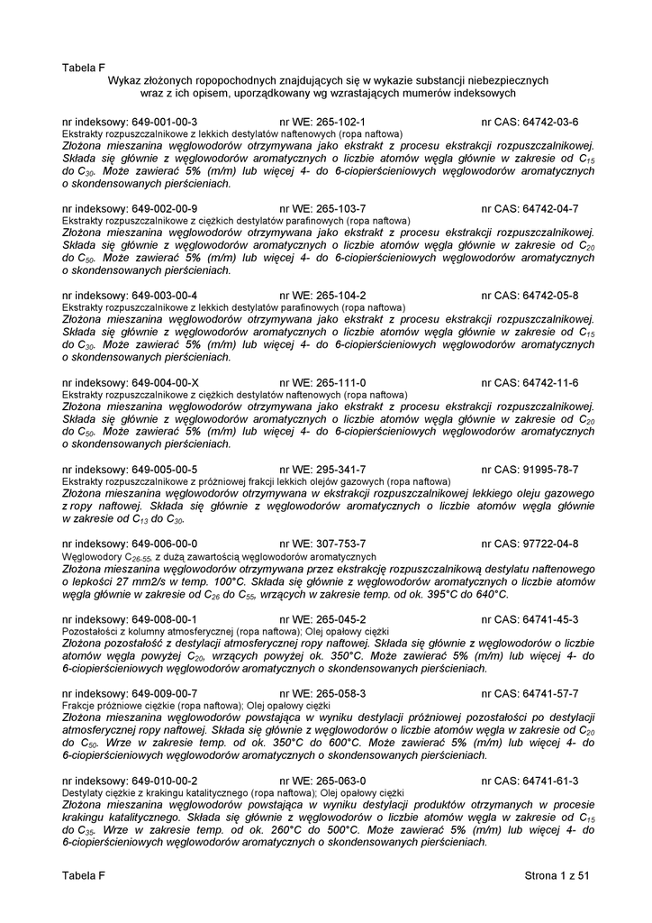 Tabela F Wykaz złożonych ropopochodnych znajdujących się w wykazie substancji niebezpiecznych wraz z ich opisem, uporządkowany wg wzrastających mumerów indeksowych nr indeksowy: 649-001-00-3 nr WE: 265-102-1 nr CAS: 64742-03-6 Ekstrakty rozpuszczalnikowe z lekkich destylatów naftenowych (ropa naftowa) Złożona mieszanina węglowodorów otrzymywana jako ekstrakt z procesu ekstrakcji rozpuszczalnikowej. Składa się głównie z węglowodorów aromatycznych o liczbie atomów węgla głównie w zakresie od C15 do C30. Może zawierać 5% (m/m) lub więcej 4- do 6-ciopierścieniowych węglowodorów aromatycznych o skondensowanych pierścieniach. nr indeksowy: 649-002-00-9 nr WE: 265-103-7 nr CAS: 64742-04-7 Ekstrakty rozpuszczalnikowe z ciężkich destylatów parafinowych (ropa naftowa) Złożona mieszanina węglowodorów otrzymywana jako ekstrakt z procesu ekstrakcji rozpuszczalnikowej. Składa się głównie z węglowodorów aromatycznych o liczbie atomów węgla głównie w zakresie od C20 do C50. Może zawierać 5% (m/m) lub więcej 4- do 6-ciopierścieniowych węglowodorów aromatycznych o skondensowanych pierścieniach. nr indeksowy: 649-003-00-4 nr WE: 265-104-2 nr CAS: 64742-05-8 Ekstrakty rozpuszczalnikowe z lekkich destylatów parafinowych (ropa naftowa) Złożona mieszanina węglowodorów otrzymywana jako ekstrakt z procesu ekstrakcji rozpuszczalnikowej. Składa się głównie z węglowodorów aromatycznych o liczbie atomów węgla głównie w zakresie od C15 do C30. Może zawierać 5% (m/m) lub więcej 4- do 6-ciopierścieniowych węglowodorów aromatycznych o skondensowanych pierścieniach. nr indeksowy: 649-004-00-X nr WE: 265-111-0 nr CAS: 64742-11-6 Ekstrakty rozpuszczalnikowe z ciężkich destylatów naftenowych (ropa naftowa) Złożona mieszanina węglowodorów otrzymywana jako ekstrakt z procesu ekstrakcji rozpuszczalnikowej. Składa się głównie z węglowodorów aromatycznych o liczbie atomów węgla głównie w zakresie od C20 do C50. Może zawierać 5% (m/m) lub więcej 4- do 6-ciopierścieniowych węglowodorów aromatycznych o skondensowanych pierścieniach. nr indeksowy: 649-005-00-5 nr WE: 295-341-7 nr CAS: 91995-78-7 Ekstrakty rozpuszczalnikowe z próżniowej frakcji lekkich olejów gazowych (ropa naftowa) Złożona mieszanina węglowodorów otrzymywana w ekstrakcji rozpuszczalnikowej lekkiego oleju gazowego z ropy naftowej. Składa się głównie z węglowodorów aromatycznych o liczbie atomów węgla głównie w zakresie od C13 do C30. nr indeksowy: 649-006-00-0 nr WE: 307-753-7 nr CAS: 97722-04-8 Węglowodory C26-55, z dużą zawartością węglowodorów aromatycznych Złożona mieszanina węglowodorów otrzymywana przez ekstrakcję rozpuszczalnikową destylatu naftenowego o lepkości 27 mm2/s w temp. 100°C. Składa się głównie z węglowodorów aromatycznych o liczbie atomów węgla głównie w zakresie od C26 do C55, wrzących w zakresie temp. od ok. 395°C do 640°C. nr indeksowy: 649-008-00-1 nr WE: 265-045-2 nr CAS: 64741-45-3 Pozostałości z kolumny atmosferycznej (ropa naftowa); Olej opałowy ciężki Złożona pozostałość z destylacji atmosferycznej ropy naftowej. Składa się głównie z węglowodorów o liczbie atomów węgla powyżej C20, wrzących powyżej ok. 350°C. Może zawierać 5% (m/m) lub więcej 4- do 6-ciopierścieniowych węglowodorów aromatycznych o skondensowanych pierścieniach. nr indeksowy: 649-009-00-7 nr WE: 265-058-3 nr CAS: 64741-57-7 Frakcje próżniowe ciężkie (ropa naftowa); Olej opałowy ciężki Złożona mieszanina węglowodorów powstająca w wyniku destylacji próżniowej pozostałości po destylacji atmosferycznej ropy naftowej. Składa się głównie z węglowodorów o liczbie atomów węgla w zakresie od C20 do C50. Wrze w zakresie temp. od ok. 350°C do 600°C. Może zawierać 5% (m/m) lub więcej 4- do 6-ciopierścieniowych węglowodorów aromatycznych o skondensowanych pierścieniach. nr indeksowy: 649-010-00-2 nr WE: 265-063-0 nr CAS: 64741-61-3 Destylaty ciężkie z krakingu katalitycznego (ropa naftowa); Olej opałowy ciężki Złożona mieszanina węglowodorów powstająca w wyniku destylacji produktów otrzymanych w procesie krakingu katalitycznego. Składa się głównie z węglowodorów o liczbie atomów węgla w zakresie od C15 do C35. Wrze w zakresie temp. od ok. 260°C do 500°C. Może zawierać 5% (m/m) lub więcej 4- do 6-ciopierścieniowych węglowodorów aromatycznych o skondensowanych pierścieniach. Tabela F Strona 1 z 51 nr indeksowy: 649-011-00-8 nr WE: 265-064-6 nr CAS: 64741-62-4 Oleje sklarowane z krakingu katalitycznego (ropa naftowa); Olej opałowy ciężki Złożona mieszanina węglowodorów otrzymywana jako pozostałość po destylacji produktów z procesu krakingu katalitycznego. Składa się głównie z węglowodorów o liczbie atomów węgla powyżej C20. Wrze powyżej ok. 350°C. Może zawierać 5% (m/m) lub więcej 4- do 6-ciopierścieniowych węglowodorów aromatycznych o skondensowanych pierścieniach. nr indeksowy: 649-012-00-3 nr WE: 265-076-1 nr CAS: 64741-75-9 Pozostałości z hydrokrakingu (ropa naftowa); Olej opałowy ciężki Złożona mieszanina węglowodorów otrzymywana jako pozostałość po destylacji produktów z procesu hydrokrakingu. Składa się głównie z węglowodorów o liczbie atomów węgla powyżej C20. Wrze powyżej ok. 350°C. nr indeksowy: 649-013-00-9 nr WE: 265-081-9 nr CAS: 64741-80-6 Pozostałości z krakingu termicznego (ropa naftowa); Olej opałowy ciężki Złożona mieszanina węglowodorów otrzymywana jako pozostałość po destylacji produktu z procesu krakingu termicznego. Składa się głównie z węglowodorów o liczbie atomów węgla powyżej C20. Wrze powyżej ok. 350°C. Może zawierać 5% (m/m) lub więcej 4- do 6-ciopierścieniowych węglowodorów aromatycznych o skondensowanych pierścieniach. nr indeksowy: 649-014-00-4 nr WE: 265-082-4 nr CAS: 64741-81-7 Destylaty ciężkie z krakingu termicznego (ropa naftowa); Olej opał