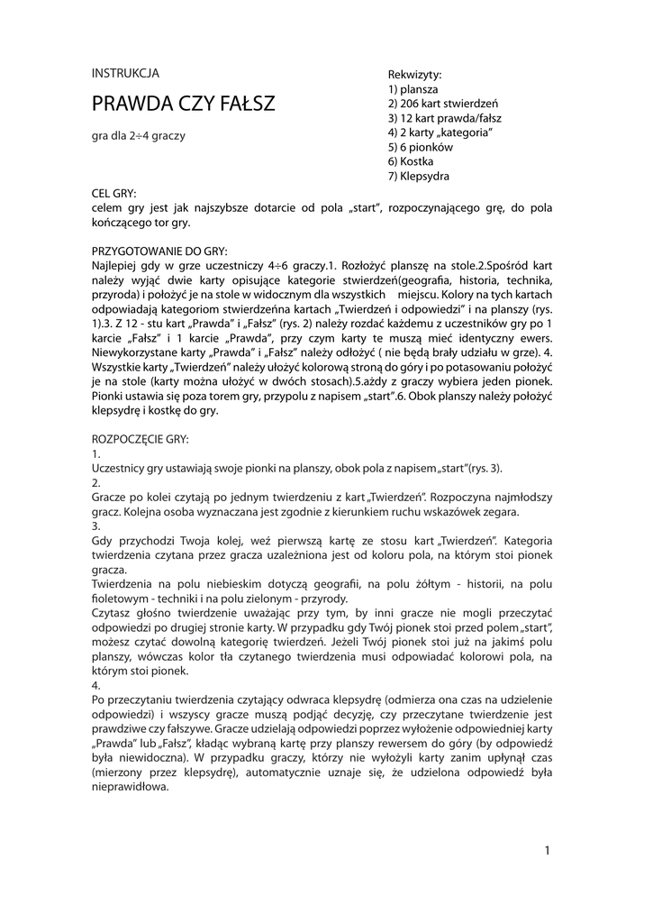 INSTRUKCJA PRAWDA CZY FAŁSZ gra dla 2÷4 graczy Rekwizyty: 1) plansza 2) 206 kart stwierdzeń 3) 12 kart prawda/fałsz 4) 2 karty „kategoria” 5) 6 pionków 6) Kostka 7) Klepsydra CEL GRY: celem gry jest jak najszybsze dotarcie od pola „start”, rozpoczynającego grę, do pola kończącego tor gry. PRZYGOTOWANIE DO GRY: Najlepiej gdy w grze uczestniczy 4÷6 graczy.1. Rozłożyć planszę na stole.2.Spośród kart należy wyjąć dwie karty opisujące kategorie stwierdzeń(geografia, historia, technika, przyroda) i położyć je na stole w widocznym dla wszystkich miejscu. Kolory na tych kartach odpowiadają kategoriom stwierdzeńna kartach „Twierdzeń i odpowiedzi” i na planszy (rys. 1).3. Z 12 - stu kart „Prawda” i „Fałsz” (rys. 2) należy rozdać każdemu z uczestników gry po 1 karcie „Fałsz” i 1 karcie „Prawda”, przy czym karty te muszą mieć identyczny ewers. Niewykorzystane karty „Prawda” i „Fałsz” należy odłożyć ( nie będą brały udziału w grze). 4. Wszystkie karty „Twierdzeń” należy ułożyć kolorową stroną do góry i po potasowaniu położyć je na stole (karty można ułożyć w dwóch stosach).5.ażdy z graczy wybiera jeden pionek. Pionki ustawia się poza torem gry, przypolu z napisem „start”.6. Obok planszy należy położyć klepsydrę i kostkę do gry. ROZPOCZĘCIE GRY: 1. Uczestnicy gry ustawiają swoje pionki na planszy, obok pola z napisem „start”(rys. 3). 2. Gracze po kolei czytają po jednym twierdzeniu z kart „Twierdzeń”. Rozpoczyna najmłodszy gracz. Kolejna osoba wyznaczana jest zgodnie z kierunkiem ruchu wskazówek zegara. 3. Gdy przychodzi Twoja kolej, weź pierwszą kartę ze stosu kart „Twierdzeń”. Kategoria twierdzenia czytana przez gracza uzależniona jest od koloru pola, na którym stoi pionek gracza. Twierdzenia na polu niebieskim dotyczą geografii, na polu żółtym - historii, na polu fioletowym - techniki i na polu zielonym - przyrody. Czytasz głośno twierdzenie uważając przy tym, by inni gracze nie mogli przeczytać odpowiedzi po drugiej stronie karty. W przypadku gdy Twój pionek stoi przed polem „start”, możesz czytać dowolną kategorię twierdzeń. Jeżeli Twój pionek stoi już na jakimś polu planszy, wówczas kolor tła czytanego twierdzenia musi odpowiadać kolorowi pola, na którym stoi pionek. 4. Po przeczytaniu twierdzenia czytający odwraca klepsydrę (odmierza ona czas na udzielenie odpowiedzi) i wszyscy gracze muszą podjąć decyzję, czy przeczytane twierdzenie jest prawdziwe czy fałszywe. Gracze udzielają odpowiedzi poprzez wyłożenie odpowiedniej karty „Prawda” lub „Fałsz”, kładąc wybraną kartę przy planszy rewersem do góry (by odpowiedź była niewidoczna). W przypadku graczy, którzy nie wyłożyli karty zanim upłynął czas (mierzony przez klepsydrę), automatycznie uznaje się, że udzielona odpowiedź była nieprawidłowa. 1