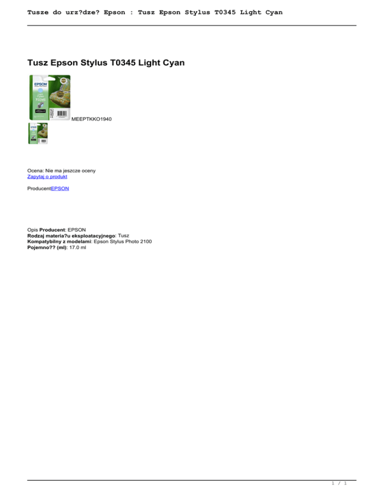 Tusze do urządzeń Epson : Tusz Epson Stylus T0345 Light Cyan