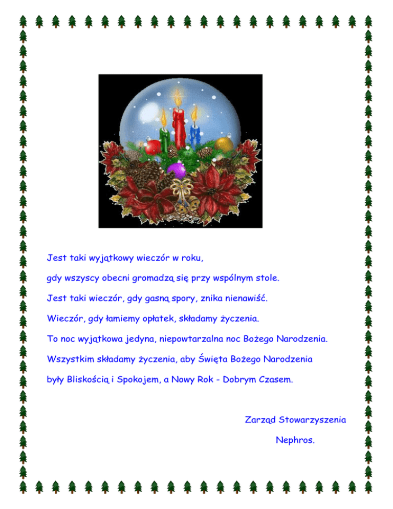 Jest taki wyjątkowy wieczór w roku, gdy wszyscy obecni gromadzą się przy wspólnym stole. Jest taki wieczór, gdy gasną spory, znika nienawiść. Wieczór, gdy łamiemy opłatek, składamy życzenia. To noc wyjątkowa jedyna, niepowtarzalna noc Bożego Narodzenia. Wszystkim składamy życzenia, aby Święta Bożego Narodzenia były Bliskością i Spokojem, a Nowy Rok - Dobrym Czasem. Zarząd Stowarzyszenia Nephros.