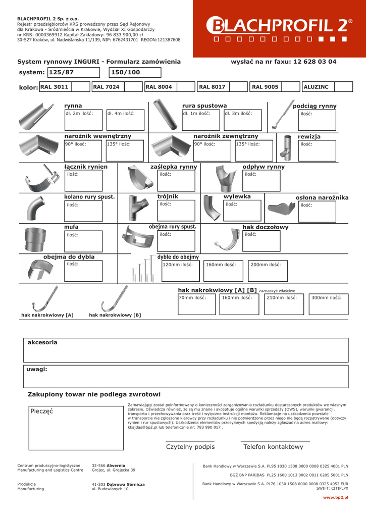 BLACHPROFIL 2 Sp. z o.o. Rejestr przedsiębiorców KRS prowadzony przez Sąd Rejonowy dla Krakowa - Śródmieścia w Krakowie, Wydział XI Gospodarczy nr KRS: 0000369912 Kapitał Zakładowy: 96 833 900,00 zł 30-527 Kraków, ul. Nadwiślańska 11/139, NIP: 6762431701 REGON:121387608 System rynnowy INGURI - Formularz zamówienia system: 125/87 kolor: RAL 3011 wysłać na nr faxu: 12 628 03 04 150/100 RAL 7024 RAL 8004 RAL 8017 RAL 9005 rura spustowa rynna dł. 2m ilość: dł. 4m ilość: dł. 1m ilość: podciąg rynny dł. 3m ilość: narożnik wewnętrzny narożnik zewnętrzny 90° ilość: 90° ilość: 135° ilość: łącznik rynien wylewka ilość: obejma do dybla ilość: hak doczołowy ilość: ilość: ilość: dyble do obejmy ilość: 120mm ilość: 160mm ilość: 200mm ilość: hak nakrokwiowy [A] [B] 70mm ilość: hak nakrokwiowy [A] osłona narożnika ilość: obejma rury spust. mufa ilość: ilość: trójnik ilość: rewizja odpływ rynny ilość: kolano rury spust. ilość: 135° ilość: zaślepka rynny ilość: ALUZINC 160mm ilość: zaznaczyć właściwe 210mm ilość: 300mm ilość: hak nakrokwiowy [B] akcesoria uwagi: Zakupiony towar nie podlega zwrotowi Pieczęć Zamawiający został poinformowany o konieczności zorganizowania rozładunku dostarczonych produktów we własnym zakresie. Oświadcza również, że są mu znane i akceptuje ogólne warunki sprzedaży (OWS), warunki gwarancji, transportu i przechowywania oraz treść i wytyczne instrukcji montażu. Reklamacje na uszkodzenia powstałe w transporcie nie zgłoszone kierowcy przy rozładunku i nie potwierdzone przez niego nie będą rozpatrywane (dotyczy rynien i rur spustowych). Uszkodzenia elementów przesyłanych spedycją należy zgłaszać na adres mailowy: [email protected] lub telefonicznie nr: 783 990 017 . Czytelny podpis Centrum produkcyjno-logistyczne Manufacturing and Logistics Centre 32-566 Alwernia Grojec, ul. Grojecka 39 Telefon kontaktowy Bank Handlowy w Warszawie S.A. PL95 1030 1508 0000 0008 0325 4001 PLN BGŻ BNP PARIBAS PL25 1600 1013 0002 0011 6205 5001 PLN Produkcja Manufacturing 41-303 Dąbrowa Górnicza ul. Budowlanych 10 Bank Handlowy w Warszawie S.A. PL76 1030 1508 0000 0008 0325 4052 EUR SWIFT: CITIPLPX www.bp2.pl BLACHPROFIL 2 Sp. z o.o. Rejestr przedsiębiorców KRS prowadzony przez Sąd Rejonowy dla Krakowa - Śródmieścia w Krakowie, Wydział XI Gospodarczy nr KRS: 0000369912 Kapitał Zakładowy: 96 833 900,00 zł 30-527 Kraków, ul. Nadwiślańska 11/139, NIP: 6762431701 REGON:121387608 Ilości elementów w opakowaniu (system 125/87): ASORTYMENT Łącznik rynny Hak nakr. 70 Hak nakr. 160 Hak nakr. 210 Hak nakr. 300 Kolano Wylewka Trójnik Hak doczołowy Mufa Zaślepka Obejma rury z dyblem Obejma rury spustowej Narożnik zewn. i wewn. Odpływ Centrum produkcyjno-logistyczne Manufacturing and Logistics Centre ILOŚĆ SZT 80 50 50 40 40 24 24 10 36 25 50 100 100 18 30 32-566 Alwernia Grojec, ul. Grojecka 39 Bank Handlowy w Warszawie S.A. PL95 1030 1508 0000 0008 0325 4001 PLN BGŻ BNP PARIBAS PL25 1600 1013 0002 0011 6205 5001 PLN Produkcja Manufacturing 41-303 Dąbrowa Górnicza ul. Budowlanych 10 Bank Handlowy w Warszawie S.A. PL76 1030 1508 0000 0008 0325 4052 EUR SWIFT: CITIPLPX www.bp2.pl