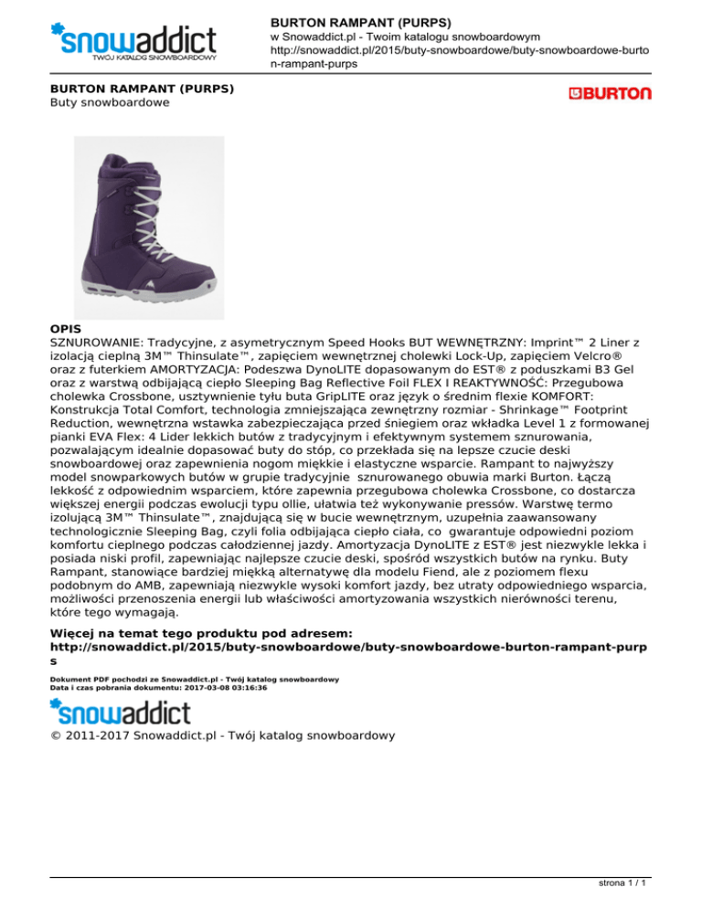 BURTON RAMPANT (PURPS) w Snowaddict.pl - Twoim katalogu snowboardowym http://snowaddict.pl/2015/buty-snowboardowe/buty-snowboardowe-burto n-rampant-purps BURTON RAMPANT (PURPS) Buty snowboardowe OPIS SZNUROWANIE: Tradycyjne, z asymetrycznym Speed Hooks BUT WEWNĘTRZNY: Imprint™ 2 Liner z izolacją cieplną 3M™ Thinsulate™, zapięciem wewnętrznej cholewki Lock-Up, zapięciem Velcro® oraz z futerkiem AMORTYZACJA: Podeszwa DynoLITE dopasowanym do EST® z poduszkami B3 Gel oraz z warstwą odbijającą ciepło Sleeping Bag Reflective Foil FLEX I REAKTYWNOŚĆ: Przegubowa cholewka Crossbone, usztywnienie tyłu buta GripLITE oraz język o średnim flexie KOMFORT: Konstrukcja Total Comfort, technologia zmniejszająca zewnętrzny rozmiar - Shrinkage™ Footprint Reduction, wewnętrzna wstawka zabezpieczająca przed śniegiem oraz wkładka Level 1 z formowanej pianki EVA Flex: 4 Lider lekkich butów z tradycyjnym i efektywnym systemem sznurowania, pozwalającym idealnie dopasować buty do stóp, co przekłada się na lepsze czucie deski snowboardowej oraz zapewnienia nogom miękkie i elastyczne wsparcie. Rampant to najwyższy model snowparkowych butów w grupie tradycyjnie sznurowanego obuwia marki Burton. Łączą lekkość z odpowiednim wsparciem, które zapewnia przegubowa cholewka Crossbone, co dostarcza większej energii podczas ewolucji typu ollie, ułatwia też wykonywanie pressów. Warstwę termo izolującą 3M™ Thinsulate™, znajdującą się w bucie wewnętrznym, uzupełnia zaawansowany technologicznie Sleeping Bag, czyli folia odbijająca ciepło ciała, co gwarantuje odpowiedni poziom komfortu cieplnego podczas całodziennej jazdy. Amortyzacja DynoLITE z EST® jest niezwykle lekka i posiada niski profil, zapewniając najlepsze czucie deski, spośród wszystkich butów na rynku. Buty Rampant, stanowiące bardziej miękką alternatywę dla modelu Fiend, ale z poziomem flexu podobnym do AMB, zapewniają niezwykle wysoki komfort jazdy, bez utraty odpowiedniego wsparcia, możliwości przenoszenia energii lub właściwości amortyzowania wszystkich nierówności terenu, które tego wymagają. Więcej na temat tego produktu pod adresem: http://snowaddict.pl/2015/buty-snowboardowe/buty-snowboardowe-burton-rampant-purp s Dokument PDF pochodzi ze Snowaddict.pl - Twój katalog snowboardowy Data i czas pobrania dokumentu: 2017-03-08 03:16:36 © 2011-2017 Snowaddict.pl - Twój katalog snowboardowy strona 1 / 1 Powered by TCPDF (www.tcpdf.org)