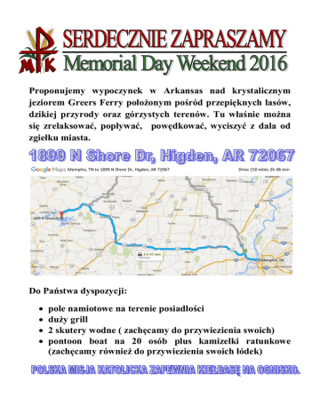 Proponujemy wypoczynek w Arkansas nad krystalicznym jeziorem Greers Ferry położonym pośród przepięknych lasów, dzikiej przyrody oraz górzystych terenów. Tu właśnie można się zrelaksować, popływać, powędkować, wyciszyć z dala od zgiełku miasta. Memphis, TN to 1899 N Shore Dr, Higden, AR 72067 Drive 150 miles 2h 48 min 1899 Do Państwa dyspozycji: pole namiotowe na terenie posiadłości duży grill 2 skutery wodne ( zachęcamy do przywiezienia swoich) pontoon boat na 20 osób plus kamizelki ratunkowe (zachęcamy również do przywiezienia swoich łódek) Na terenie posiadłości zostanie odprawiona: jezioro plaża pływanie na pontoon boat pływanie na skuterach wodnych wędkowanie biwakowanie ognisko grillowanie wycieczki na Sugar Loaf Mountain chodzienie po górskich szlakach (Np. Sugar Loaf Mountain Nature Trail jest to 2 milowy szlak położony w pobliżu Higden, AR, które oferuje malownicze widoki i jest oceniany jako umiarkowany. Szlak jest używany przede wszystkim do uprawiania turystyki pieszej i jest dostępny przez cały rok) Rodzice odpowiedzialni są za swoje dzieci ** Dno jeziora jest bardzo skaliste polecamy wzięcie butów do wody. Klapki nie zdadzą egzaminu, są niebezpieczne. * Chętnych prosimy o zgłoszenia do pani Zosi Schmidt ( tel. 901-484-3899) do końca marca.