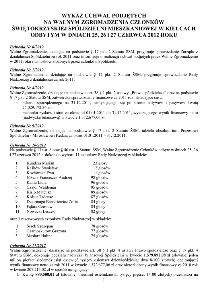 WYKAZ UCHWAŁ PODJĘTYCH NA WALNYM ZGROMADZENIA CZŁONKÓW ŚWIĘTOKRZYSKIEJ SPÓŁDZIELNI MIESZKANIOWEJ W KIELCACH ODBYTYM W DNIACH 25, 26 i 27 CZERWCA 2012 ROKU Uchwała Nr 6/2012 Walne Zgromadzenie, działając na podstawie § 17 pkt. 2 Statutu ŚSM, przyjmuje sprawozdanie Zarządu z działalności Spółdzielni za rok 2011 oraz informacje o realizacji uchwał podjętych przez Walne Zgromadzenie w 2011 roku i wniosków złożonych przez członków Spółdzielni. Uchwała Nr 7/2012 Walne Zgromadzenie, działając na podstawie § 17 pkt. 2 Statutu ŚSM, przyjmuje sprawozdanie Rady Nadzorczej z działalności za rok 2011. Uchwała Nr 8/2012 Walne Zgromadzenie, działając na podstawie art. 38 § 1 pkt. 2 ustawy ,,Prawo spółdzielcze” oraz na podstawie § 17 pkt. 2 Statutu ŚSM, zatwierdza sprawozdanie finansowe za 2011 rok, składające się z: bilansu sporządzonego na 31.12.2011, zamykającego się po stronie aktywów i pasywów kwotą 75.029.172,36 zł, rachunku zysków i strat za okres od 01.01.2011 do 31.12.2011, wykazującego wynik finansowy netto (nadwyżkę bilansową) w kwocie 1.372.677,06 zł. Uchwała Nr 9/2012 Walne Zgromadzenie, działając na podstawie § 17 pkt. 2 Statutu ŚSM, udziela absolutorium Prezesowi Spółdzielni - Mirosławowi Kędzia za okres 01.01.2011 – 31.12.2011. Uchwała Nr 10/2012 Na podstawie § 13 ust. 6 oraz § 40 ust. 1 Statutu ŚSM, Walne Zgromadzenie Członków odbyte w dniach 25, 26 i 27 czerwca 2012 r. dokonało wyboru 11 członków Rady Nadzorczej w składzie: 1. 2. 3. 4. 5. 6. 7. 8. 9. 10. 11. Kundera Marian Kaśków Stanisław Kozłowska Ewa Jóźwik Franciszek Andrzej Kania Lidia Czajor Waldemar Kisio Mateusz Kołsut Tadeusz Dziarmaga Banakiewicz Zofia Fąfara Czesław Nowacki Leszek 123 głosy 112 głosów 111 głosów 98 głosów 96 głosów 95 głosów 89 głosów 87 głosów 84 głosy 84 głosy 82 głosy oraz 3 rezerwowych członków Rady Nadzorczej w składzie: 1. 2. 3. Serek Szczepan Czarnoskutow Grażyna Masiarz Halina 78 głosów 77 głosów 75 głosów Uchwała Nr 11/2012 Walne Zgromadzenie, działając na podstawie art. 38 § 1 pkt. 4 ustawy Prawo spółdzielcze oraz § 17 pkt. 4 Statutu ŚSM, dokonuje podziału nadwyżki bilansowej Spółdzielni w kwocie 1.579.892,08 zł (słownie: jeden milion pięćset siedemdziesiąt dziewięć tysięcy osiemset dziewięćdziesiąt dwa 8/100 złotych) obejmującej wynik finansowy netto za rok 2011 w kwocie 1.372.677,06 zł oraz nierozliczony wynik finansowy za 2010 rok w kwocie 207.215,02 zł w sposób następujący: 1. Kwotę 880.500,01 zł (słownie: osiemset osiemdziesiąt tysięcy pięćset 1/100 złotych) przeznacza na 1 2. 3. 4. 5. dofinansowanie kosztów eksploatacji części wspólnych oraz funduszu remontowego nieruchomości mieszkaniowych, w zakresie obciążającym członków, proporcjonalnie do powierzchni użytkowej ich lokali mieszkalnych. Kwotę 3.203,64 zł (słownie: trzy tysiące dwieście trzy 64/100 złotych) przeznacza na dofinansowanie kosztów związanych z eksploatacją i utrzymaniem garaży w zakresie obciążającym członków proporcjonalnie do powierzchni użytkowej garaży. Kwotę 379.599,70 zł (słownie: trzysta siedemdziesiąt dziewięć tysięcy pięćset dziewięćdziesiąt dziewięć 70/100 złotych) przeznacza na dofinansowanie kosztów związanych z eksploatacją i utrzymaniem mienia Spółdzielni przeznaczonego do wspólnego użytkowania w zakresie obciążającym członków, proporcjonalnie do powierzchni ich lokali mieszkalnych i garaży. Kwotę 316.588,73 zł (słownie: trzysta szesnaście tysięcy pięćset osiemdziesiąt osiem 73/100) pozostawia się jako nierozliczony wynik finansowy. Nadwyżkę bilansową przypadającą poszczególnym nieruchomościom mieszkaniowym ustala się według stanu powierzchni użytkowej lokali członków na dzień 31.12.2011. Uchwała Nr 12/3/2012 Walne Zgromadzenie Członków ŚSM, działając na podstawie § 17 pkt. 8 Statutu, po rozpatrzeniu odwołania i dodatkowych wyjaśnień, uchyla uchwałę Rady Nadzorczej Nr 139 z dnia 25.10.2010, w sprawie niewyrażenia zgody na przyjęcie w poczet członków ŚSM P. Łyżwy Pawła zam. Kielce, ul. Klonowa 48/49. Uchwała Nr 12/12/2012 Walne Zgromadzenie Członków ŚSM, działając na podstawie § 17 pkt. 8 Statutu, po rozpatrzeniu odwołania i dodatkowych wyjaśnień, uchyla uchwałę Rady Nadzorczej Nr 140 z dnia 27.04.2012 w sprawie wykreślenia z członkostwa w ŚSM P. Iwony Głębowskiej zam. Kielce ul. Orkana 36/13. Uchwała Nr 13/2012 I. Walne Zgromadzenie Członków ŚSM, działając na podstawie § 17 pkt. 9 Statutu, zmienia następujące zapisy w Statucie ŚSM w Kielcach: 1. § 16 otrzymuje brzmienie: „Walne Zgromadzenie Członków ŚSM zwoływane jest w jednej części.” 2. W § 19 ust. 1 wykreśla się słowa „części” oraz „ pierwszej części”. 3. W § 19 ust. 2 wykreśla się słowo „część”. 4. § 19 ust. 3 otrzymuje brzmienie: „Walne Zgromadzenie jest ważne niezależnie od liczby obecnych na nim członków.” 5. § 19 ust. 4 otrzymuje brzmienie: „Uchwałę uważa się za podjętą, jeżeli za uchwałą opowiedziała się wymagana w ustawie lub statucie większość członków biorących udział w głosowaniu.” 6. W § 19 ust. 5 skreśla się słowa: „(jego wszystkich części)” oraz „pierwszej części”. 7. W § 19 ust. 6 skreśla się słowa „pierwszej części”. 8. W § 19 ust. 7 skreśla się słowa „pierwszej części”. 9. W § 20 ust. 1 skreśla się słowa: „części” praz „pierwszej części”. 10. § 20 ust. 2 otrzymuje brzmienie: „Zarząd o potrzebie zgłaszania kandydatów do Rady Nadzorczej Spółdzielni lub delegatów na zjazd Związku Rewizyjnego, w którym Spółdzielnia jest zrzeszona, informuje członków na 30 dni przed datą Walnego Zgromadzenia.” 11. § 20 ust. 3 skreśla się słowa „każdej części”. 12. § 21 ust. 1 skreśla się słowo „Części”. 13. W § 22 ust. 1 skreśla s