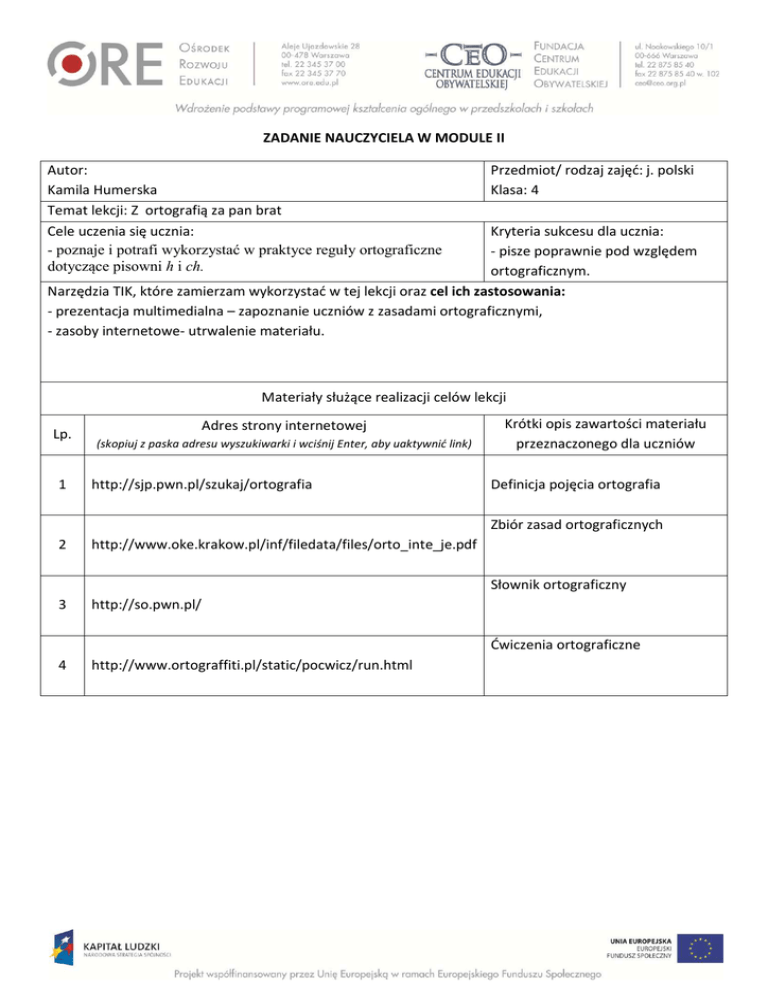 ZADANIE NAUCZYCIELA W MODULE II Autor: Kamila Humerska Temat lekcji: Z ortografią za pan brat Cele uczenia się ucznia: - poznaje i potrafi wykorzystać w praktyce reguły ortograficzne dotyczące pisowni h i ch. Przedmiot/ rodzaj zajęć: j. polski Klasa: 4 Kryteria sukcesu dla ucznia: - pisze poprawnie pod względem ortograficznym. Narzędzia TIK, które zamierzam wykorzystać w tej lekcji oraz cel ich zastosowania: - prezentacja multimedialna – zapoznanie uczniów z zasadami ortograficznymi, - zasoby internetowe- utrwalenie materiału. Materiały służące realizacji celów lekcji Lp. 1 Adres strony internetowej (skopiuj z paska adresu wyszukiwarki i wciśnij Enter, aby uaktywnić link) http://sjp.pwn.pl/szukaj/ortografia Krótki opis zawartości materiału przeznaczonego dla uczniów Definicja pojęcia ortografia Zbiór zasad ortograficznych 2 http://www.oke.krakow.pl/inf/filedata/files/orto_inte_je.pdf Słownik ortograficzny 3 http://so.pwn.pl/ Ćwiczenia ortograficzne 4 http://www.ortograffiti.pl/static/pocwicz/run.html
